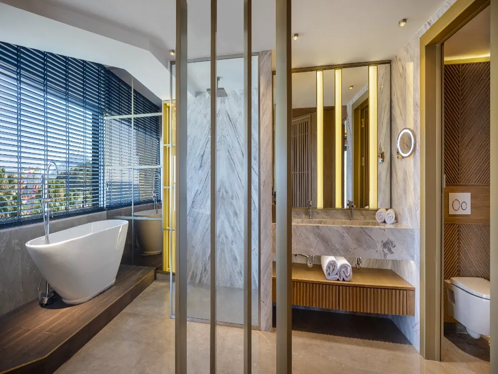 Dla max. 5 osób, Przestrzeń zewnętrzna: Balkon, Kanały telewizji: angielski, Telefon w pokoju, prysznic, jacuzzi, Powierzchnia pokoju: ok. 100 m2, Dostawka: łóżko rozkładane, Rodzaj podłogi: płytki, Sprzątanie cykliczne, Salon, 2 sypialnie, Drzwi łączące między pokojami, Maksymalna liczba osób dorosłych: 4, Maksymalna liczba dzieci: 1, Widok na ogród i morze, Liczba łazienek: 2, Liczba toalet: 2, Zestaw do parzenia kawy i herbaty, Klimatyzacja: Klimatyzacja centralna, Działa w godzinach: 24h, przez cały rok