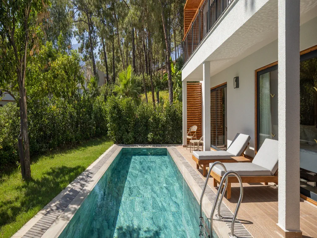 Dla max. 4 osób, Przestrzeń zewnętrzna: Balkon, Kanały telewizji: angielski, Telefon w pokoju, prysznic, Powierzchnia pokoju: ok. 60 m2, Dostawka: łóżko rozkładane, Rodzaj podłogi: płytki, Sprzątanie cykliczne, 2 sypialnie, Drzwi łączące między pokojami, Maksymalna liczba osób dorosłych: 3, Maksymalna liczba dzieci: 1, Od strony basenu, Prywatny basen, Liczba łazienek: 2, Liczba toalet: 2, Zestaw do parzenia kawy i herbaty, Klimatyzacja: Klimatyzacja centralna, Działa w godzinach: 24h, przez cały rok