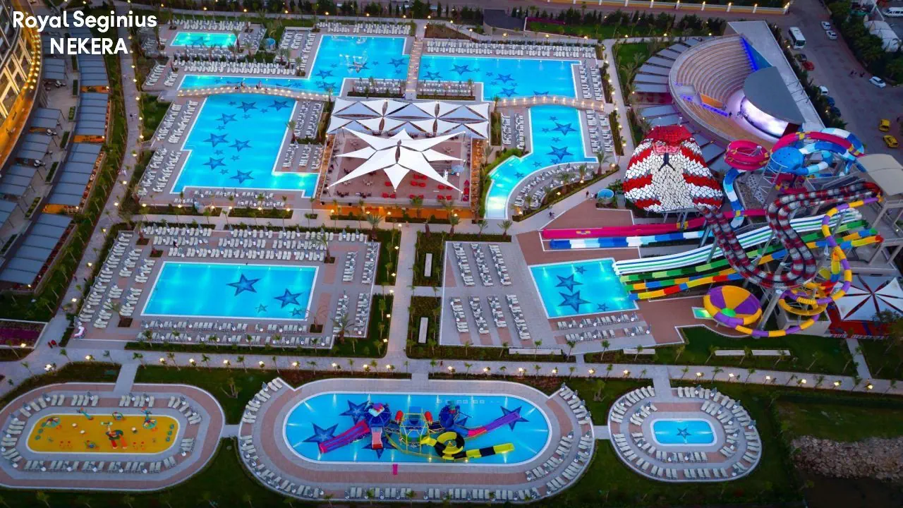 ok. 70 000 m² - 1 budynek główny, 9 pięter - całodobowa recepcja, windy Baseny i aquapark - 4 baseny zewnętrzne dla dorosłych (w tym relaksacyjny i półolimpijski) - 2 brodziki zewnętrzne dla dzieci