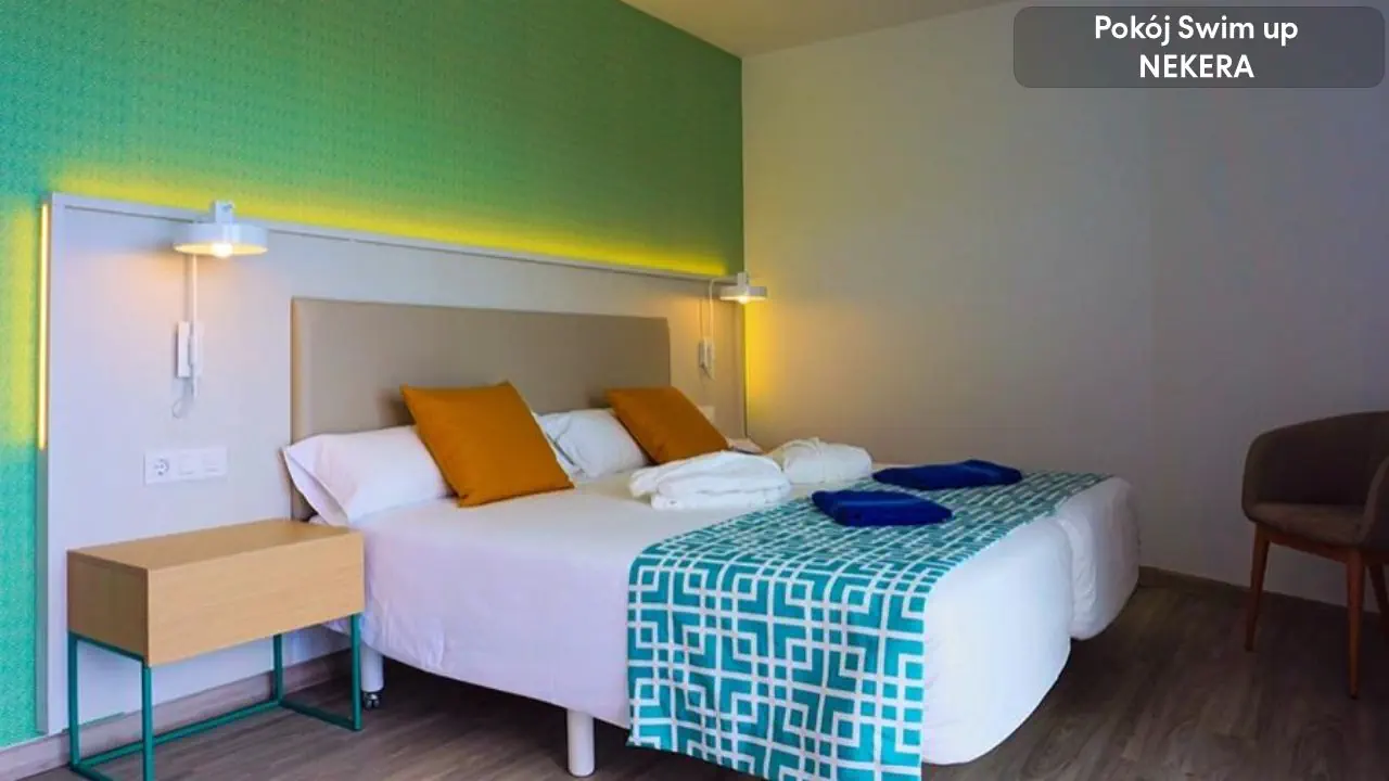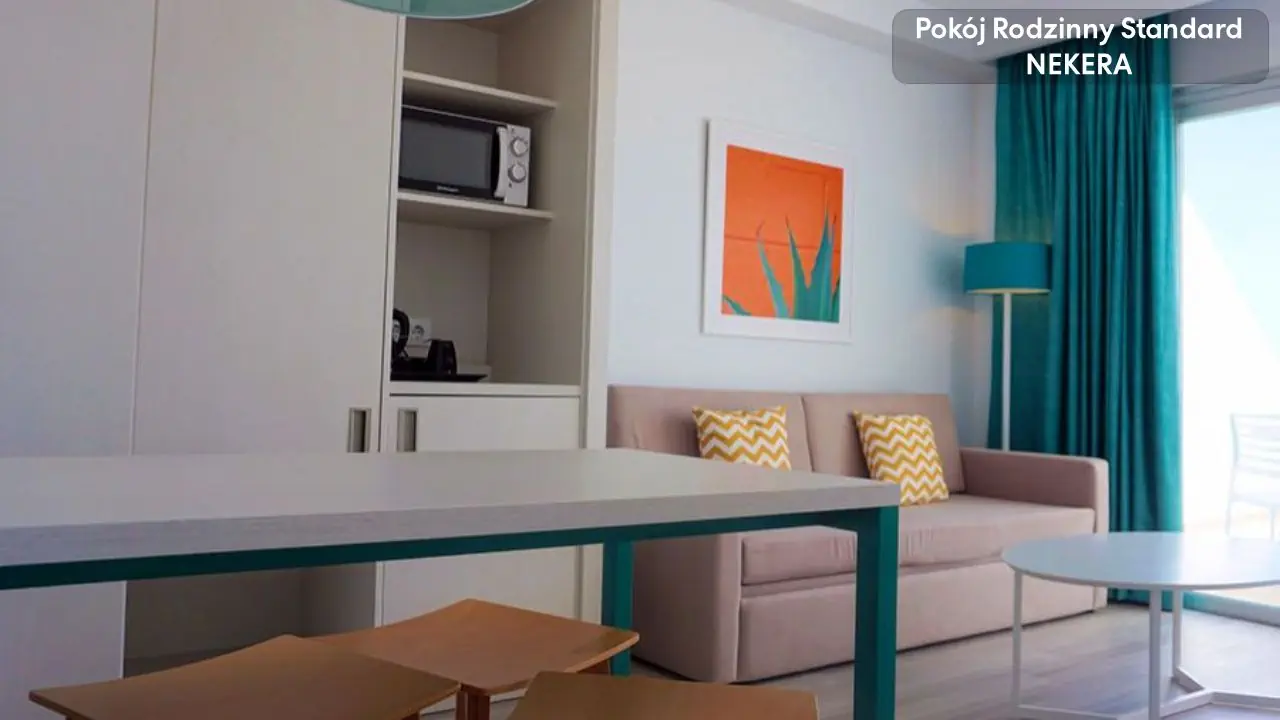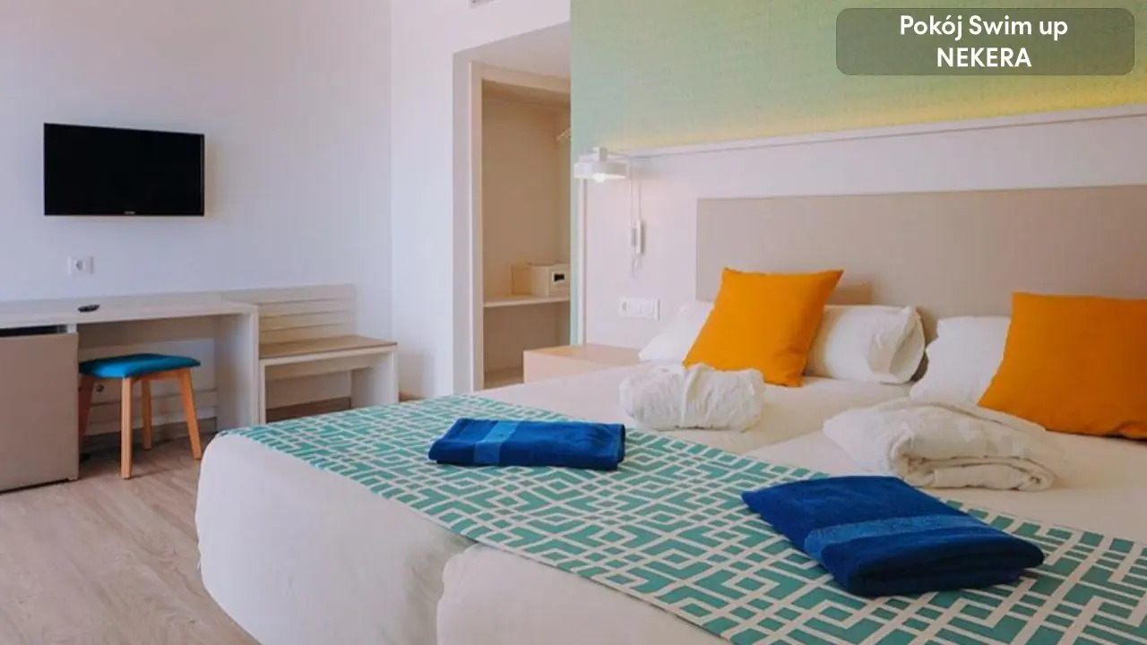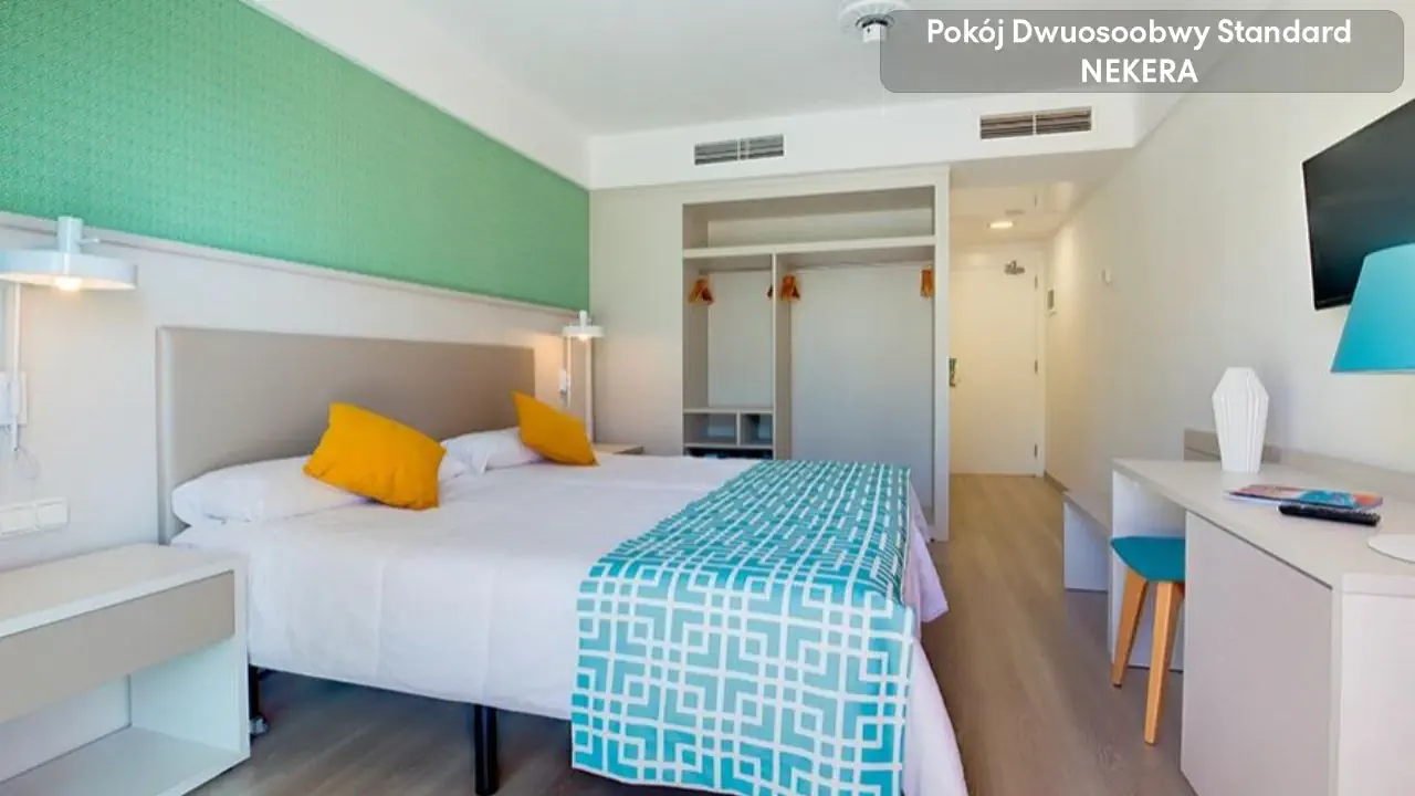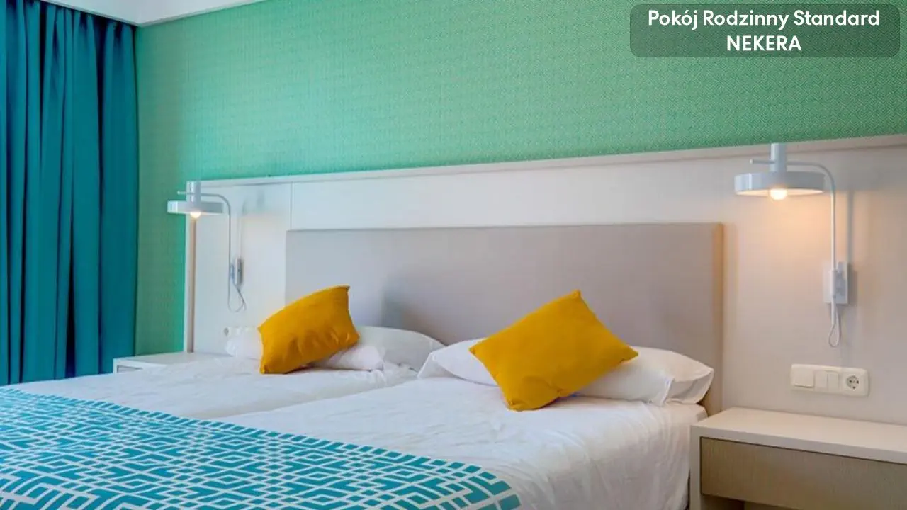 Pokój Dwuosobowy Standard - dwa łóżka pojedyncze - prywatny balkon lub taras - klimatyzacja - TV - bezpłatne WiFi - w pełni wyposażona łazienka z prysznicem lub wanną i suszarką do włosów Pokój Rodzinny Standard - ok. 42m2 - osobna sypialnia z dwoma pojedynczymi łóżkami - salon z rozkładaną sofą - prywatny balkon lub taras - w pełni wyposażona łazienka z prysznicem lub wanną i suszarką do włosów - poza tym wyposażenie standardowe Pokój Swim up - pokój wyłącznie dla osób powyżej 18 roku życia - dwa łóżka pojedyncze - prywatny taras z bezpośrednim dostępem do basenu - częściowy widok na morze - w pełni wyposażona łazienka z prysznicem lub wanną i suszarką do włosów - poza tym wyposażony tak, jak pozostałe pokoje