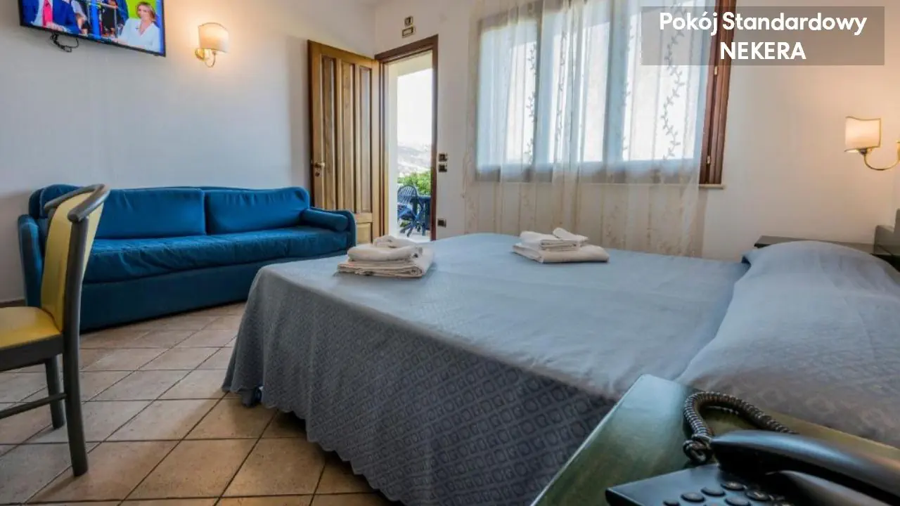 Pokój STANDARD dla max 3 osób dorosłych, łóżko podwójne lub 2 łóżka pojedyncze, łóżko pojedyncze lub sofa jako dostawka, klimatyzacja(sezonowo), sejf, TV-Sat., telefon (płatny), minibar (płatny), prywatna łazienka ( prysznic lub wanna, umywalka, lustro, toaleta, mini kosmetyki, suszarka do włosów, umeblowany balkon lub taras. Pokój RODZINNY , max 4 osób dorosłych, dwa pomieszczenia, łóżko podwójne lub 2 łóżka pojedyncze, 1–2 łóżka pojedyncze, klimatyzacja (sezonowo), sejf, TV-Sat., telefon (płatny), minibar (płantny), prywatna łazienka ( prysznic lub wanna, umywalka, lustro, toaleta, mini kosmetyki, suszarka do włosów, umeblowany balkon lub taras Dostęp do Internetu: bezpłatne Wi-Fi na terenie hotelu – w częściach ogólnodostępnych oraz w pokojach (zasięg i prędkość mogą być zróżnicowane w zależności od obłożenia i położenia pokoju).