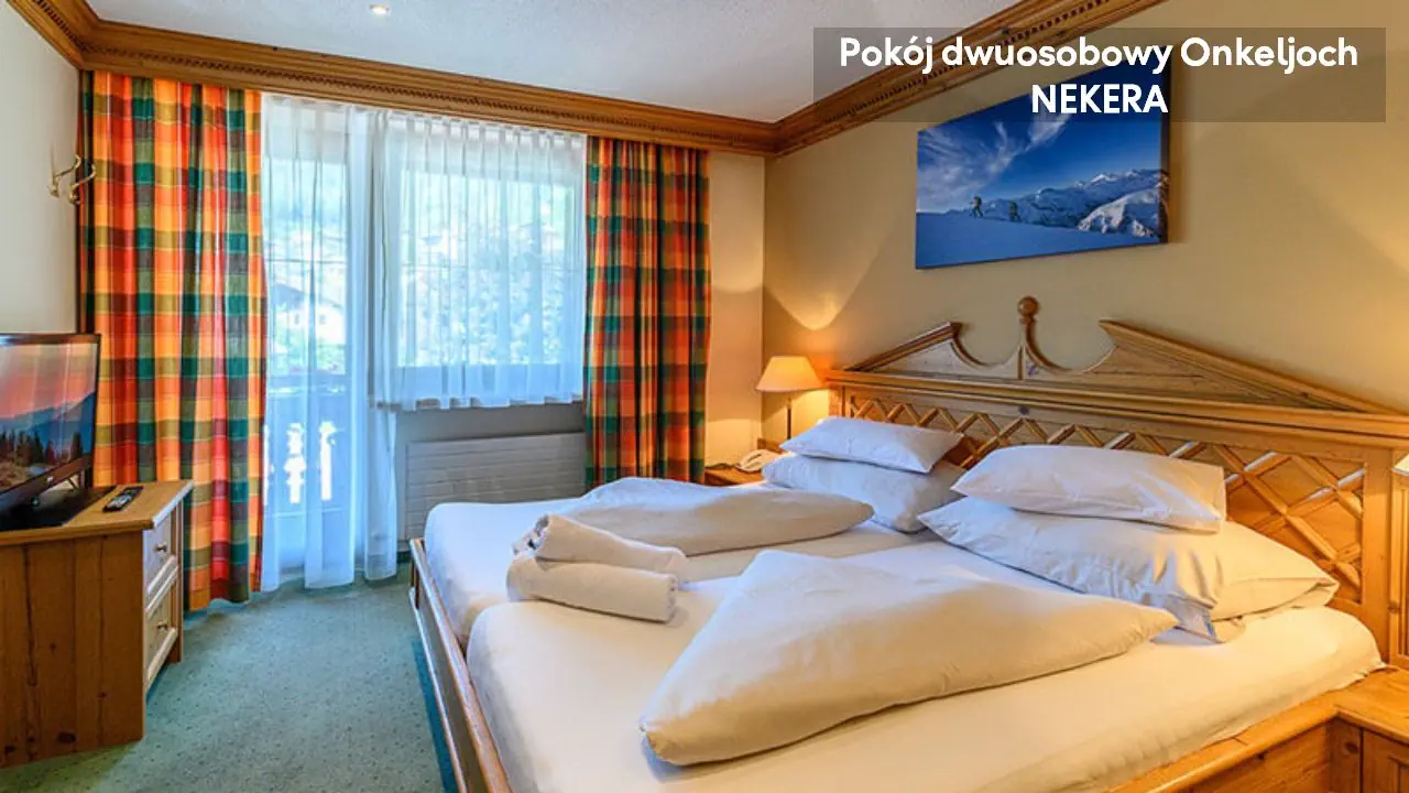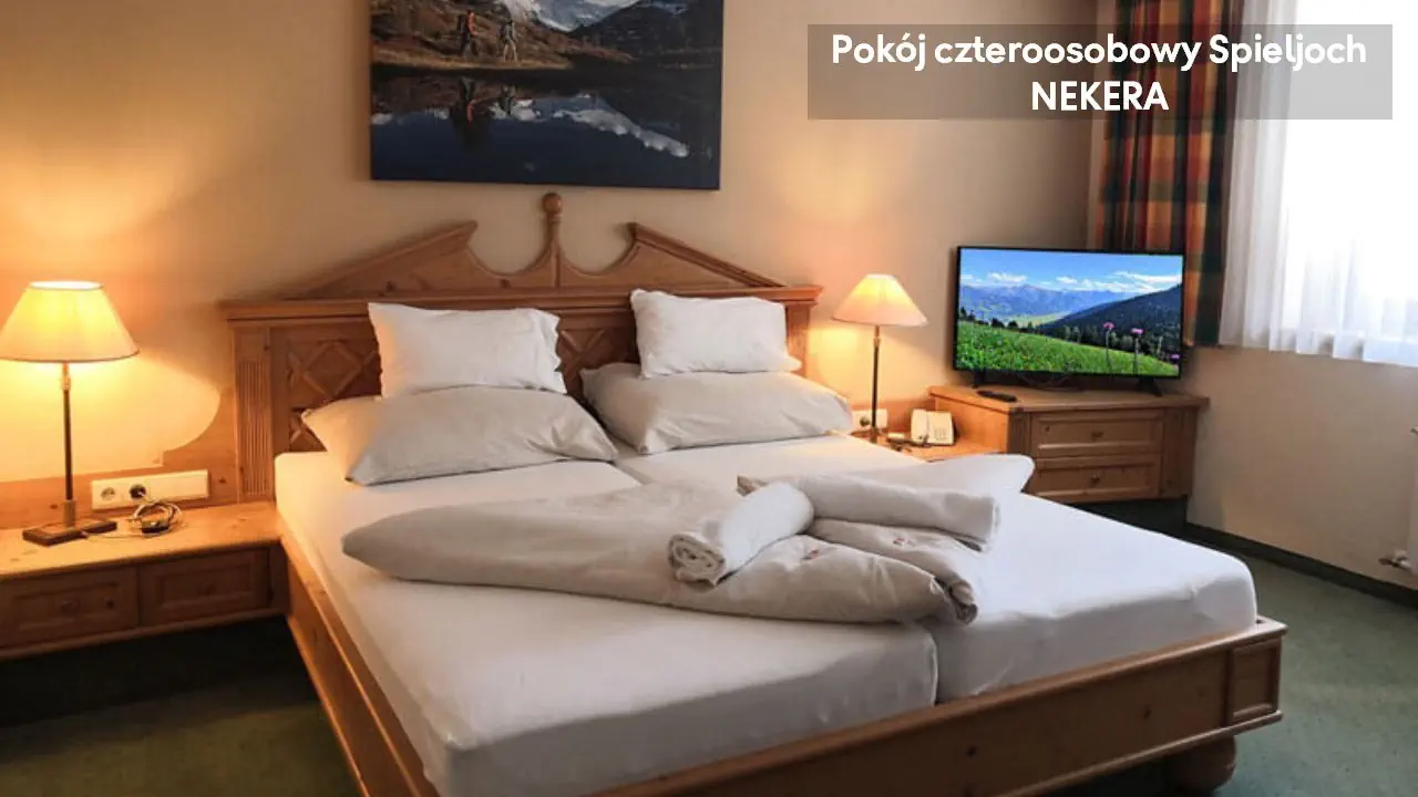 pokoje dwuosobowe Onkeljoch: ok. 16-19 m2; ogrzewanie, TV-Sat., telefon, sejf, wanna lub prysznic, WC, suszarka. Dla max. 2 osób dorosłych. Pokoje jednoosobowe Onkeljoch: ok. 12 m2; wyposażone jak pokoje dwuosobowe. Pokoje dwuosobowe Spiejoch I: ok. 20-24 m2; dodatkowo rozkładana sofa dla 1-2 dzieci. Dostępne pokoje z balkonem, na zapytanie, za dodatkową opłatą. Poza tym wyposażone jak pokoje Onkeljoch. Pokoje dwuosobowe Spiejoch II: ok. 23-25 m2; dodatkowo rozkładana sofa. Dla 2-3 osób dorosłych lub 2 os. dorosłych i 1-2 dzieci. Dostępne pokoje z balkonem, na zapytanie, za dodatkową opłatą. Poza tym wyposażone jak pokoje Onkeljoch.
