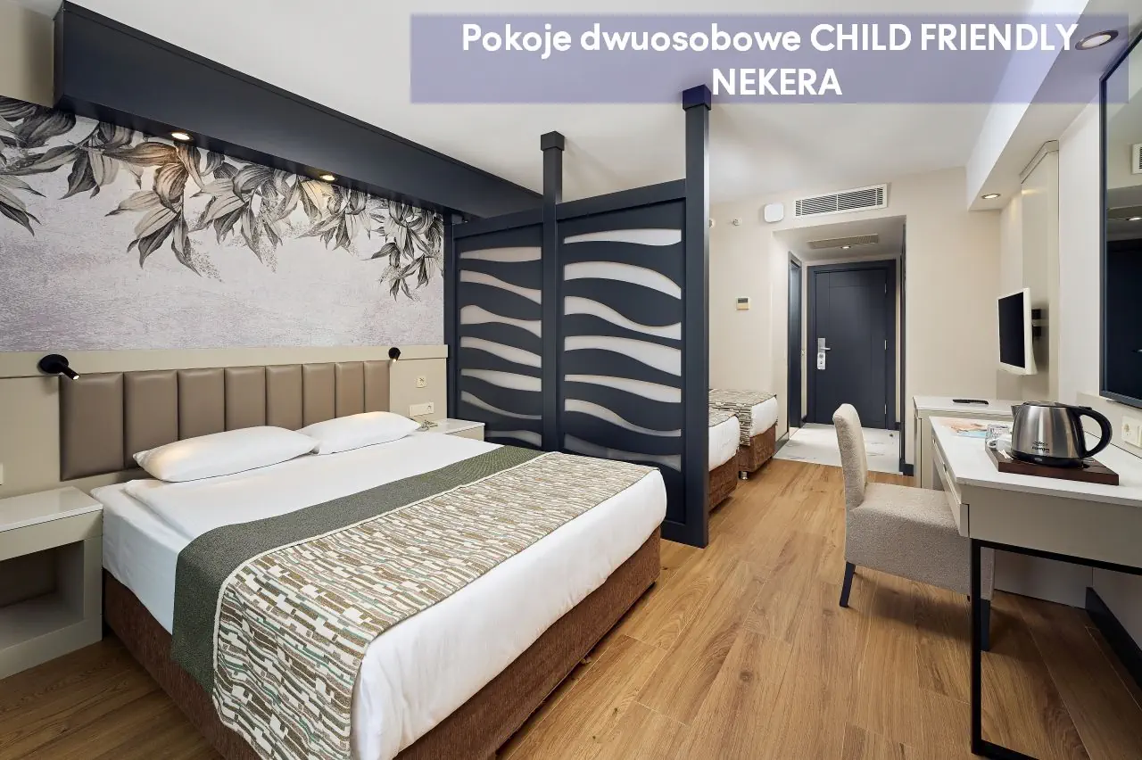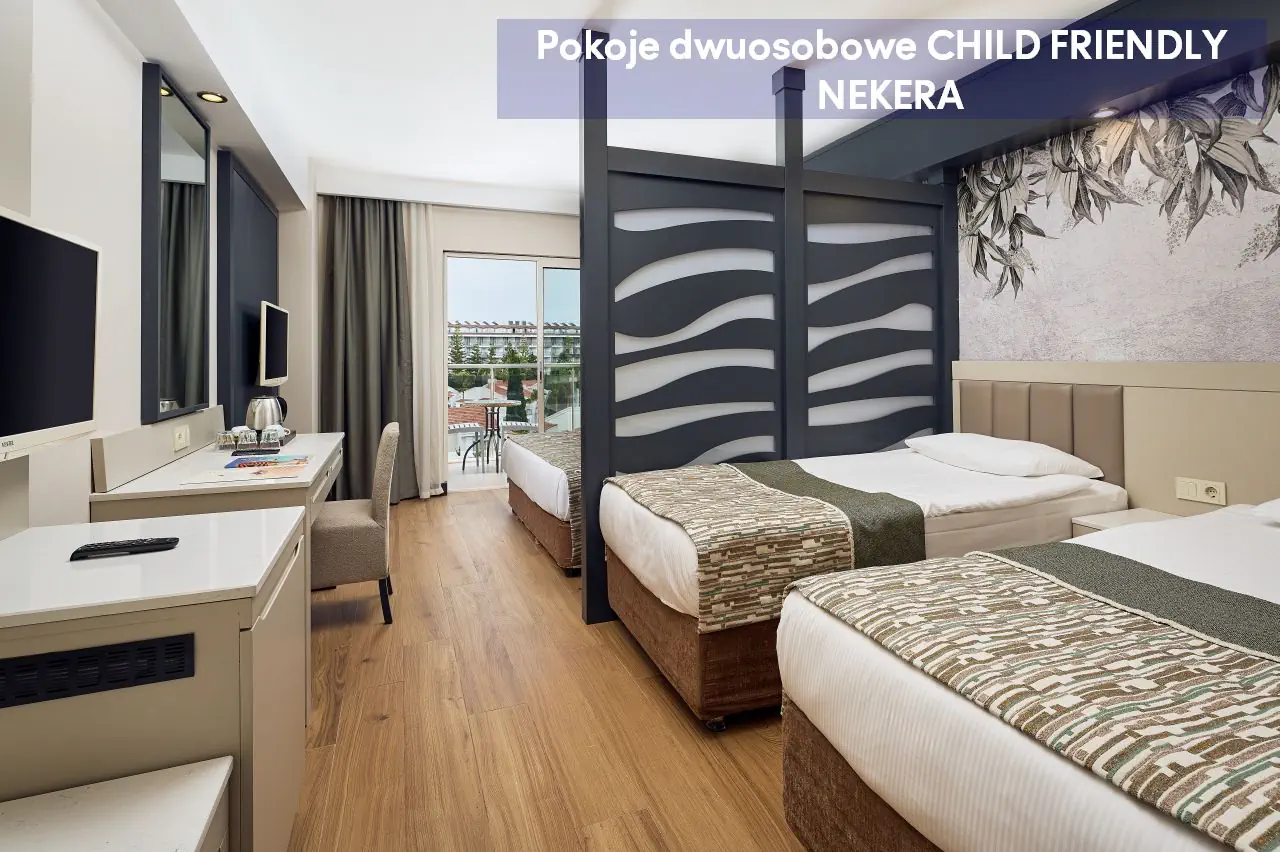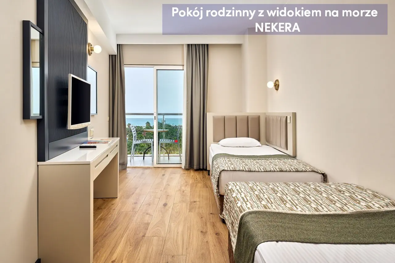 Pokoje dwuosobowe ekonomiczne ECONOMY - powierzchnia ok. 30 m² - dla max. 2 os dorosłych - łóżko podwójne lub 2 łóżka pojedyncze - klimatyzacja indywidualna - telewizor z płaskim ekranem - łazienka z prysznicem - zestaw mini kosmetyków - suszarka do włosów - telefon (za opłatą) - bezpłatne Wi-Fi - sejf (bezpłatny) - mini bar (uzupełniony w dniu przyjazdu w napoje bezalkoholowe oraz piwo, w pozostałe dni – tylko woda) - zestaw do parzenia kawy/herbaty - łóżeczko dla dzieci do lat 2 (na życzenie, bezpłatnie) - balkon francuski z widokiem na ląd Pokoje dwuosobowe Standard Land View z widokiem na ląd - powierzchnia ok. 30 m² - dla max. 2 os dorosłych i 1 dziecka lub 3 osób dorosłych - łóżko podwójne lub 2 łóżka pojedyncze - klimatyzacja indywidualna - telewizor z płaskim ekranem - łazienka z prysznicem - zestaw mini kosmetyków - suszarka do włosów - telefon (za opłatą) - bezpłatne Wi-Fi - sejf (bezpłatny) - mini bar (uzupełniony w dniu przyjazdu w napoje bezalkoholowe oraz piwo, w pozostałe dni – tylko woda) - zestaw do parzenia kawy/herbaty - łóżeczko dla dzieci do lat 2 (na życzenie, bezpłatnie) - balkon z widokiem na ląd Pokoje dwuosobowe Standard Side Sea View z częściowym widokiem na morze - powierzchnia ok. 30 m² - dla max. 2 os dorosłych i 1 dziecka lub 3 osób dorosłych - łóżko podwójne lub 2 łóżka pojedyncze - klimatyzacja indywidualna - telewizor z płaskim ekranem - łazienka z prysznicem - zestaw mini kosmetyków - suszarka do włosów - telefon (za opłatą) - bezpłatne Wi-Fi - sejf (bezpłatny) - mini bar (uzupełniony w dniu przyjazdu w napoje bezalkoholowe oraz piwo, w pozostałe dni – tylko woda) - zestaw do parzenia kawy/herbaty - łóżeczko dla dzieci do lat 2 (na życzenie, bezpłatnie) - balkon z częściowym widokiem na morze Pokoje dwuosobowe Standard Sea View z widokiem na morze - powierzchnia ok. 30 m² - dla max. 2 os dorosłych i 1 dziecka lub 3 osób dorosłych - łóżko podwójne lub 2 łóżka pojedyncze - klimatyzacja indywidualna - telewizor z płaskim ekranem - łazienka z prysznicem - zestaw mini kosmetyków - suszarka do włosów - telefon (za opłatą) - bezpłatne Wi-Fi - sejf (bezpłatny) - mini bar (uzupełniony w dniu przyjazdu w napoje bezalkoholowe oraz piwo, w pozostałe dni – tylko woda) - zestaw do parzenia kawy/herbaty - łóżeczko dla dzieci do lat 2 (na życzenie, bezpłatnie) - balkon z częściowym widokiem na morze Pokoje dwuosobowe COMFORT ROOM - powierzchnia ok. 30 m² - dla max. 2 os dorosłych i 1 dziecka lub 3 osób dorosłych - łóżko podwójne lub 2 łóżka pojedyncze - wyższe piętra - klimatyzacja indywidualna - telewizor z płaskim ekranem - łazienka z prysznicem - zestaw mini kosmetyków - suszarka do włosów - telefon (za opłatą) - bezpłatne Wi-Fi - sejf (bezpłatny) - mini bar (uzupełniony w dniu przyjazdu w napoje bezalkoholowe oraz piwo, w pozostałe dni – tylko woda) - zestaw do parzenia kawy/herbaty - łóżeczko dla dzieci do lat 2 (na życzenie, bezpłatnie) - balkon z widokiem na basen lub morze Pokoje dwuosobowe CHILD FRIENDLY - 1 pokój - powierzchnia ok. 30 m² - dla max. 2 os dorosłych i 2 dzieci - łóżko podwójne i 2 łóżka pojedyncze (oddzielone przepierzeniem) - klimatyzacja indywidualna - telewizor z płaskim ekranem - łazienka z prysznicem - zestaw mini kosmetyków - suszarka do włosów - telefon (za opłatą) - bezpłatne Wi-Fi - sejf (bezpłatny) - mini bar (uzupełniony w dniu przyjazdu w napoje bezalkoholowe oraz piwo, w pozostałe dni – tylko woda) - zestaw do parzenia kawy/herbaty - łóżeczko dla dzieci do lat 2 (na życzenie, bezpłatnie) - balkon z częściowym widokiem na morze Pokoje rodzinne z widokiem na ląd - 2 pokoje oddzielone drzwiami - powierzchnia ok. 50 m² - dla max. 2 os dorosłych i 2 dzieci lub 4 osób dorosłych - łóżko podwójne (1 sypialnia) i 2 łóżka pojedyncze (2 sypialnia) - klimatyzacja indywidualna - telewizor z płaskim ekranem - łazienka z prysznicem - zestaw mini kosmetyków - suszarka do włosów - telefon (za opłatą) - bezpłatne Wi-Fi - sejf (bezpłatny) - mini bar (uzupełniony w dniu przyjazdu w napoje bezalkoholowe oraz piwo, w pozostałe dni – tylko woda) - zestaw do parzenia kawy/herbaty - łóżeczko dla dzieci do lat 2 (na życzenie, bezpłatnie) - balkon z widokiem na ląd Pokoje rodzinne z widokiem na morze - 2 pokoje oddzielone drzwiami - powierzchnia ok. 50 m² - dla max. 2 os dorosłych i 2 dzieci lub 4 osób dorosłych - łóżko podwójne (1 sypialnia) i 2 łóżka pojedyncze (2 sypialnia) - klimatyzacja indywidualna - telewizor z płaskim ekranem - łazienka z prysznicem - zestaw mini kosmetyków - suszarka do włosów - telefon (za opłatą) - bezpłatne Wi-Fi - sejf (bezpłatny) - mini bar (uzupełniony w dniu przyjazdu w napoje bezalkoholowe oraz piwo, w pozostałe dni – tylko woda) - zestaw do parzenia kawy/herbaty - łóżeczko dla dzieci do lat 2 (na życzenie, bezpłatnie) - balkon z widokiem na morze