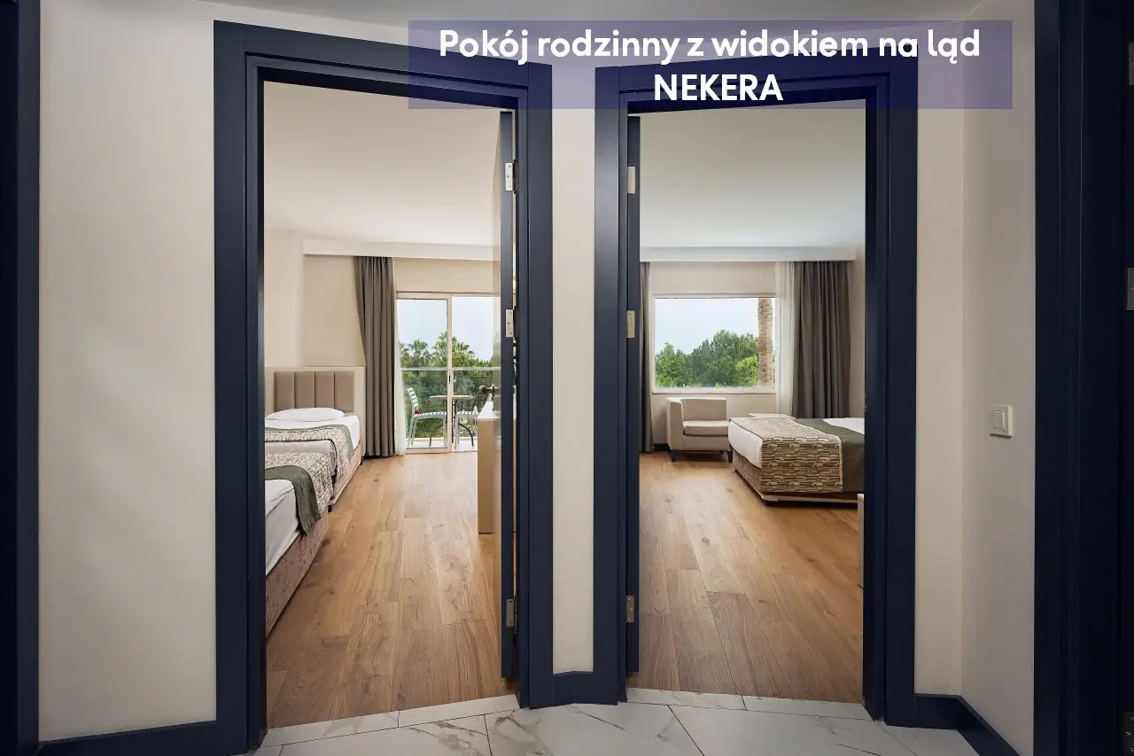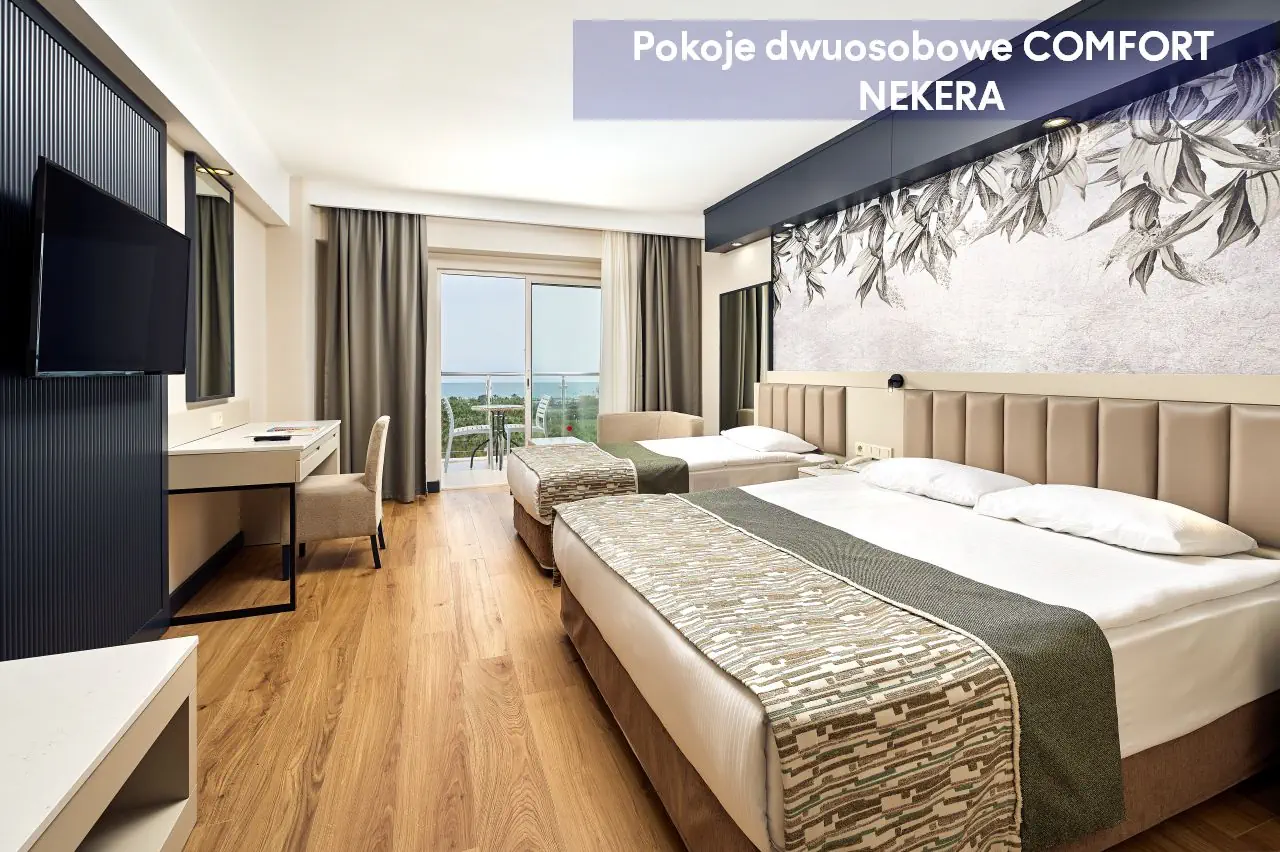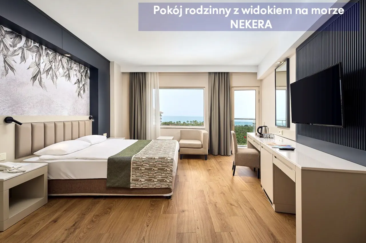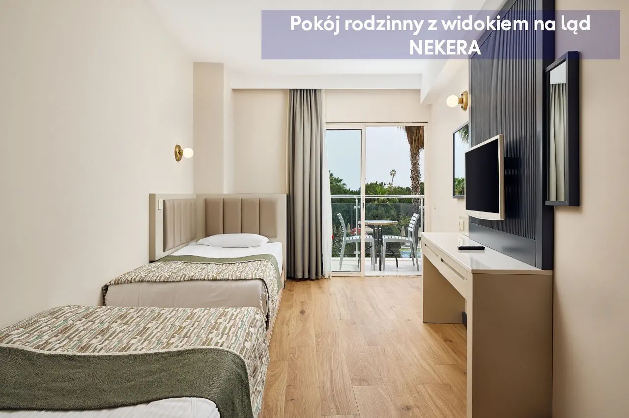 Pokoje dwuosobowe ekonomiczne ECONOMY - powierzchnia ok. 30 m² - dla max. 2 os dorosłych - łóżko podwójne lub 2 łóżka pojedyncze - klimatyzacja indywidualna - telewizor z płaskim ekranem - łazienka z prysznicem - zestaw mini kosmetyków - suszarka do włosów - telefon (za opłatą) - bezpłatne Wi-Fi - sejf (bezpłatny) - mini bar (uzupełniony w dniu przyjazdu w napoje bezalkoholowe oraz piwo, w pozostałe dni – tylko woda) - zestaw do parzenia kawy/herbaty - łóżeczko dla dzieci do lat 2 (na życzenie, bezpłatnie) - balkon francuski z widokiem na ląd Pokoje dwuosobowe Standard Land View z widokiem na ląd - powierzchnia ok. 30 m² - dla max. 2 os dorosłych i 1 dziecka lub 3 osób dorosłych - łóżko podwójne lub 2 łóżka pojedyncze - klimatyzacja indywidualna - telewizor z płaskim ekranem - łazienka z prysznicem - zestaw mini kosmetyków - suszarka do włosów - telefon (za opłatą) - bezpłatne Wi-Fi - sejf (bezpłatny) - mini bar (uzupełniony w dniu przyjazdu w napoje bezalkoholowe oraz piwo, w pozostałe dni – tylko woda) - zestaw do parzenia kawy/herbaty - łóżeczko dla dzieci do lat 2 (na życzenie, bezpłatnie) - balkon z widokiem na ląd Pokoje dwuosobowe Standard Side Sea View z częściowym widokiem na morze - powierzchnia ok. 30 m² - dla max. 2 os dorosłych i 1 dziecka lub 3 osób dorosłych - łóżko podwójne lub 2 łóżka pojedyncze - klimatyzacja indywidualna - telewizor z płaskim ekranem - łazienka z prysznicem - zestaw mini kosmetyków - suszarka do włosów - telefon (za opłatą) - bezpłatne Wi-Fi - sejf (bezpłatny) - mini bar (uzupełniony w dniu przyjazdu w napoje bezalkoholowe oraz piwo, w pozostałe dni – tylko woda) - zestaw do parzenia kawy/herbaty - łóżeczko dla dzieci do lat 2 (na życzenie, bezpłatnie) - balkon z częściowym widokiem na morze Pokoje dwuosobowe Standard Sea View z widokiem na morze - powierzchnia ok. 30 m² - dla max. 2 os dorosłych i 1 dziecka lub 3 osób dorosłych - łóżko podwójne lub 2 łóżka pojedyncze - klimatyzacja indywidualna - telewizor z płaskim ekranem - łazienka z prysznicem - zestaw mini kosmetyków - suszarka do włosów - telefon (za opłatą) - bezpłatne Wi-Fi - sejf (bezpłatny) - mini bar (uzupełniony w dniu przyjazdu w napoje bezalkoholowe oraz piwo, w pozostałe dni – tylko woda) - zestaw do parzenia kawy/herbaty - łóżeczko dla dzieci do lat 2 (na życzenie, bezpłatnie) - balkon z częściowym widokiem na morze Pokoje dwuosobowe COMFORT ROOM - powierzchnia ok. 30 m² - dla max. 2 os dorosłych i 1 dziecka lub 3 osób dorosłych - łóżko podwójne lub 2 łóżka pojedyncze - wyższe piętra - klimatyzacja indywidualna - telewizor z płaskim ekranem - łazienka z prysznicem - zestaw mini kosmetyków - suszarka do włosów - telefon (za opłatą) - bezpłatne Wi-Fi - sejf (bezpłatny) - mini bar (uzupełniony w dniu przyjazdu w napoje bezalkoholowe oraz piwo, w pozostałe dni – tylko woda) - zestaw do parzenia kawy/herbaty - łóżeczko dla dzieci do lat 2 (na życzenie, bezpłatnie) - balkon z widokiem na basen lub morze Pokoje dwuosobowe CHILD FRIENDLY - 1 pokój - powierzchnia ok. 30 m² - dla max. 2 os dorosłych i 2 dzieci - łóżko podwójne i 2 łóżka pojedyncze (oddzielone przepierzeniem) - klimatyzacja indywidualna - telewizor z płaskim ekranem - łazienka z prysznicem - zestaw mini kosmetyków - suszarka do włosów - telefon (za opłatą) - bezpłatne Wi-Fi - sejf (bezpłatny) - mini bar (uzupełniony w dniu przyjazdu w napoje bezalkoholowe oraz piwo, w pozostałe dni – tylko woda) - zestaw do parzenia kawy/herbaty - łóżeczko dla dzieci do lat 2 (na życzenie, bezpłatnie) - balkon z częściowym widokiem na morze Pokoje rodzinne z widokiem na ląd - 2 pokoje oddzielone drzwiami - powierzchnia ok. 50 m² - dla max. 2 os dorosłych i 2 dzieci lub 4 osób dorosłych - łóżko podwójne (1 sypialnia) i 2 łóżka pojedyncze (2 sypialnia) - klimatyzacja indywidualna - telewizor z płaskim ekranem - łazienka z prysznicem - zestaw mini kosmetyków - suszarka do włosów - telefon (za opłatą) - bezpłatne Wi-Fi - sejf (bezpłatny) - mini bar (uzupełniony w dniu przyjazdu w napoje bezalkoholowe oraz piwo, w pozostałe dni – tylko woda) - zestaw do parzenia kawy/herbaty - łóżeczko dla dzieci do lat 2 (na życzenie, bezpłatnie) - balkon z widokiem na ląd Pokoje rodzinne z widokiem na morze - 2 pokoje oddzielone drzwiami - powierzchnia ok. 50 m² - dla max. 2 os dorosłych i 2 dzieci lub 4 osób dorosłych - łóżko podwójne (1 sypialnia) i 2 łóżka pojedyncze (2 sypialnia) - klimatyzacja indywidualna - telewizor z płaskim ekranem - łazienka z prysznicem - zestaw mini kosmetyków - suszarka do włosów - telefon (za opłatą) - bezpłatne Wi-Fi - sejf (bezpłatny) - mini bar (uzupełniony w dniu przyjazdu w napoje bezalkoholowe oraz piwo, w pozostałe dni – tylko woda) - zestaw do parzenia kawy/herbaty - łóżeczko dla dzieci do lat 2 (na życzenie, bezpłatnie) - balkon z widokiem na morze