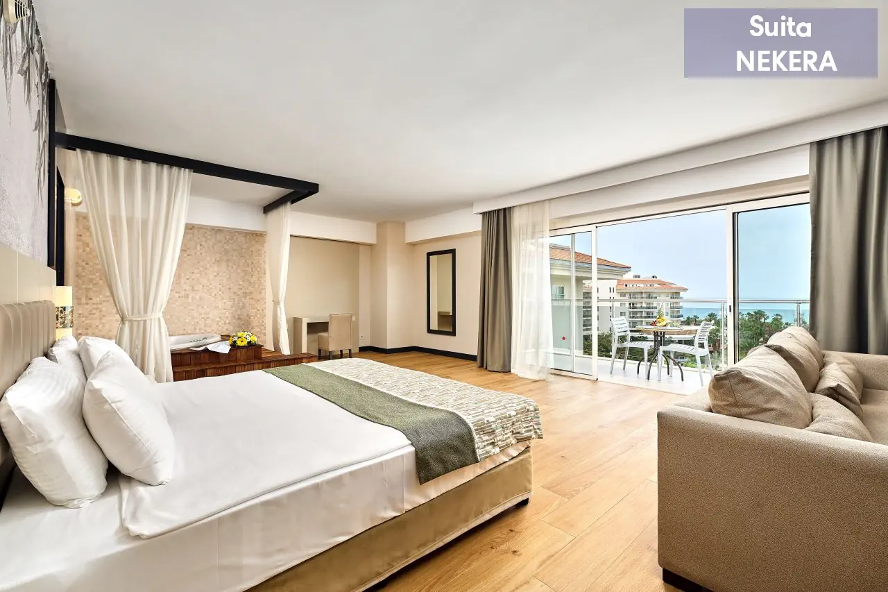 - pokój mieszkalno-sypialny - powierzchnia ok. 80 m² - dla max. 2 os dorosłych - łóżko podwójne + kanapa (w części wypoczynkowej) oraz jacuzzi w pokoju - klimatyzacja indywidualna - telewizor z płaskim ekranem - łazienka z prysznicem - zestaw mini kosmetyków - suszarka do włosów - telefon (za opłatą) - bezpłatne Wi-Fi - sejf (bezpłatny) - mini bar (uzupełniony w dniu przyjazdu w napoje bezalkoholowe oraz piwo, w pozostałe dni – tylko woda) - zestaw do parzenia kawy/herbaty - łóżeczko dla dzieci do lat 2 (na życzenie, bezpłatnie) - balkon z widokiem na morze