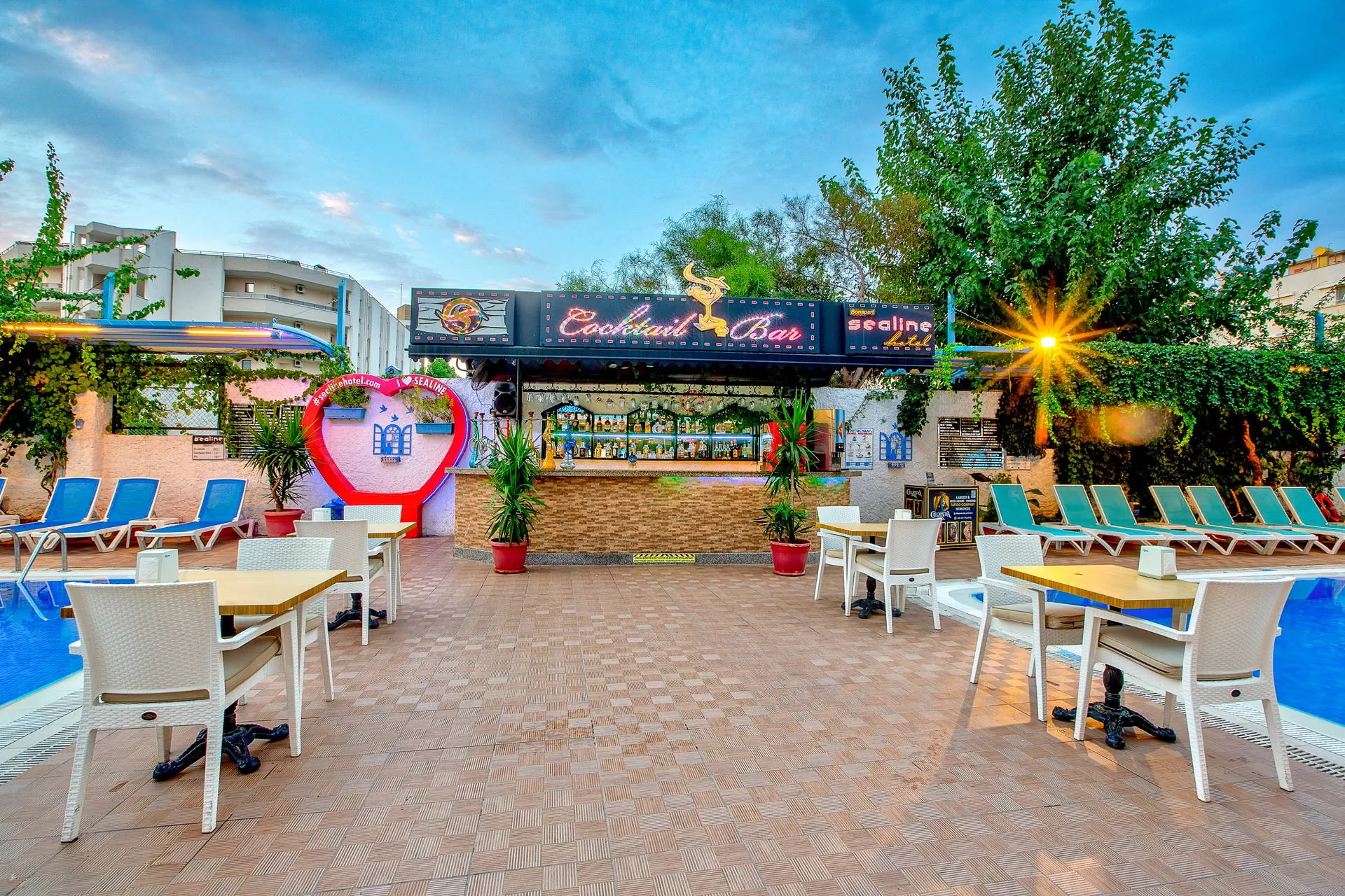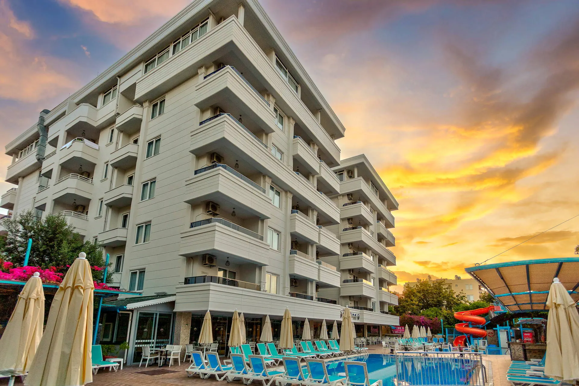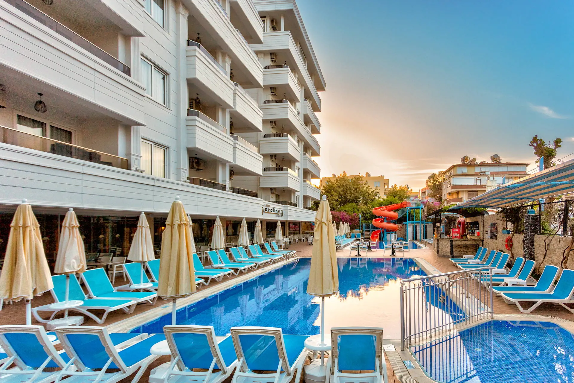 Położenie Świetna lokalizacja w odległości ok. 500 m od centrum turystycznego kurortu Alanya, ok. 800 m do portu. W okolicy hotelu liczne kawiarnie, sklepy, bary i restauracje oraz kantor. Do lotniska w Antalyi ok. 120 km. Plaża Do słynnej plaży Kleopatry ok. 350 metrów. Leżaki i parasole na plaży płatne (ok. 6 EUR/dzień/komplet). Do dyspozycji gości Recepcja 24 h, winda, lobby, restauracja główna, bar. Ponadto: 2 baseny w tym jeden ze zjeżdzalnią, taras słoneczny z bezpłatnymi leżakami i parasolami. Hotel nie prowadzi serwisu ręczników kąpielowych. Wyżywienie All Inclusive: śniadanie (08:00-10:00), lunch (12:30-14:00), obiadokolacja (19:00-21:00) w formie bufetu w restauracji głównej, kawa, herbata, ciastko (16:00-17:00), nocna zupa (23:00-24:00). Napoje bezalkoholowe oraz lokalne alkohole (10:00-23:00). Płatne dodatkowo: świeżo wyciskane soki, konsumpcja po 23:00, kawa po turecku. Program sportowy i animacyjny Hotel nie prowadzi animacji. Dwa wieczory w tygodniu organizuje wieczorne show. Ponadto: tenis stołowy, za dodatkową opłatą billard. Internet Bezpłatny internet Wi-Fi w lobby i przy basenie. Kategoria lokalna *** Naszym zdaniem Hotel polecamy szczególnie osobom które pragną wypoczywać w samym sentrum Alanyi. Bliskość wszelakich rozrywek jakich jak bary, restauracje, sklepy oraz przepiękna plaża Kleopatry dostępna w zasięgu spaceru sprawiają że jest to idealna oferta dla osób które pragną na wakacjach przeżyć prawdziwą turecką przygodę. Największą zaletą poza położeniem, są bardzo przestronne pokoje rodzinne. Gorąco polecamy. Strona www www.sealinehotel.com