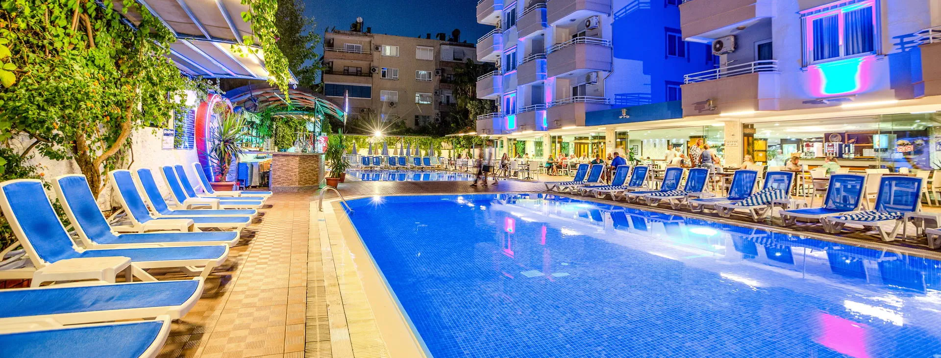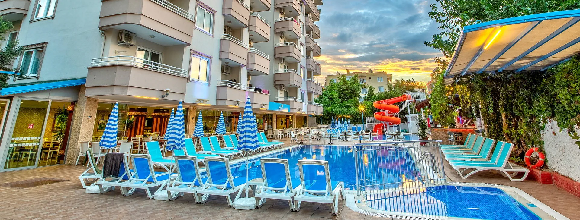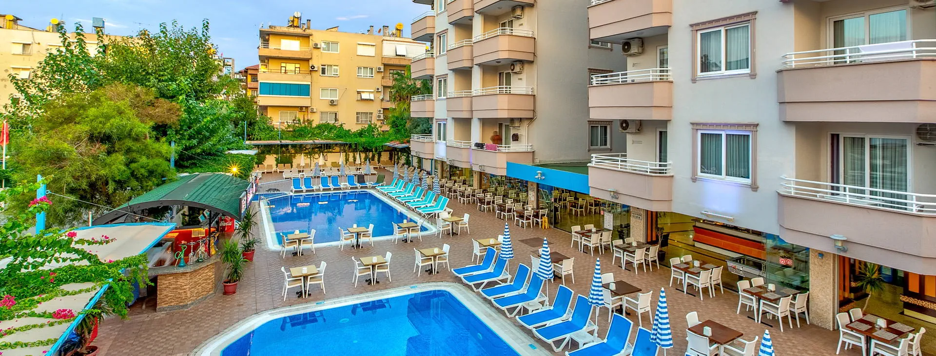 Położenie: Świetna lokalizacja w odległości ok. 500 m od centrum turystycznego kurortu Alanya, ok. 800 m do portu. W okolicy hotelu liczne kawiarnie, sklepy, bary i restauracje oraz kantor. Do lotniska w Antalyi ok. 120 km. Plaża: Do słynnej plaży ok. 350 metrów, do plaży Kleopatry ok. 10 minut spacerem. Leżaki i parasole na plaży płatne (ok. 6 EUR/dzień/komplet). Do dyspozycji gości: Recepcja 24 h, winda, lobby, restauracja główna, bar. Ponadto: 2 baseny w tym jeden ze zjeżdzalnią, taras słoneczny z bezpłatnymi leżakami i parasolami. Hotel nie prowadzi serwisu ręczników kąpielowych. Wyżywienie: All Inclusive: śniadanie (08:00-10:00), lunch (12:30-14:00), obiadokolacja (19:00-21:00) w formie bufetu w restauracji głównej, kawa, herbata, ciastko (16:00-17:00), nocna zupa (23:00-24:00). Napoje bezalkoholowe oraz lokalne alkohole (10:00-23:00). Płatne dodatkowo: świeżo wyciskane soki, konsumpcja po 23:00, kawa po turecku. Program sportowy i animacyjny: Hotel nie prowadzi animacji. Dwa wieczory w tygodniu organizuje wieczorne show. Ponadto: tenis stołowy, za dodatkową opłatą billard. Internet: Bezpłatny internet Wi-Fi w lobby. Internet w pokojach, w restauracji i przy basenie płatny dodatkowo (1€/1$ na dzień). Kategoria lokalna: *** Strona www: