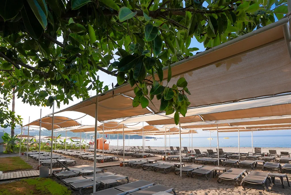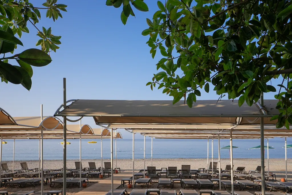 Wydzielona część plaży publicznej, Piaszczysto-żwirowa, Piaszczysto-żwirowe zejście do morza, odleglość do plaży: 10 m, długość plaży: 75 m, Parasole - bezpłatnie, Leżaki - bezpłatnie, Ręczniki - bezpłatnie, Pawilony na plaży - płatne, Beach Bar - bezpłatnie, Prysznic