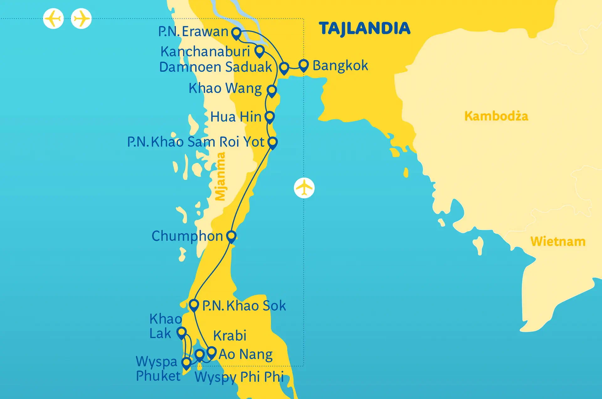 Do dyspozycji gości w hotelach restauracja, bar i w większości hoteli basen Zakwaterowanie Część objezdowa Hotele dobrej klasy, odpowiadające standardowi ***/**** w ocenie organizatora. Pokoje: we wszystkich hotelach są wyposażone w TV, klimatyzację, łazienki z WC i często mini bar (dodatkowo płatny). Pokój 3 - osobowy to z reguły pokój 2 - osobowy z dostawką (dostawka na ogół w formie łóżka polowego lub rozkładanej kanapy). Część pobytowa Zakwaterowanie w wybranym hotelu na Khao Lak. Opisy poszczególnych hoteli w katalogu lub systemie rezerwacyjnym.