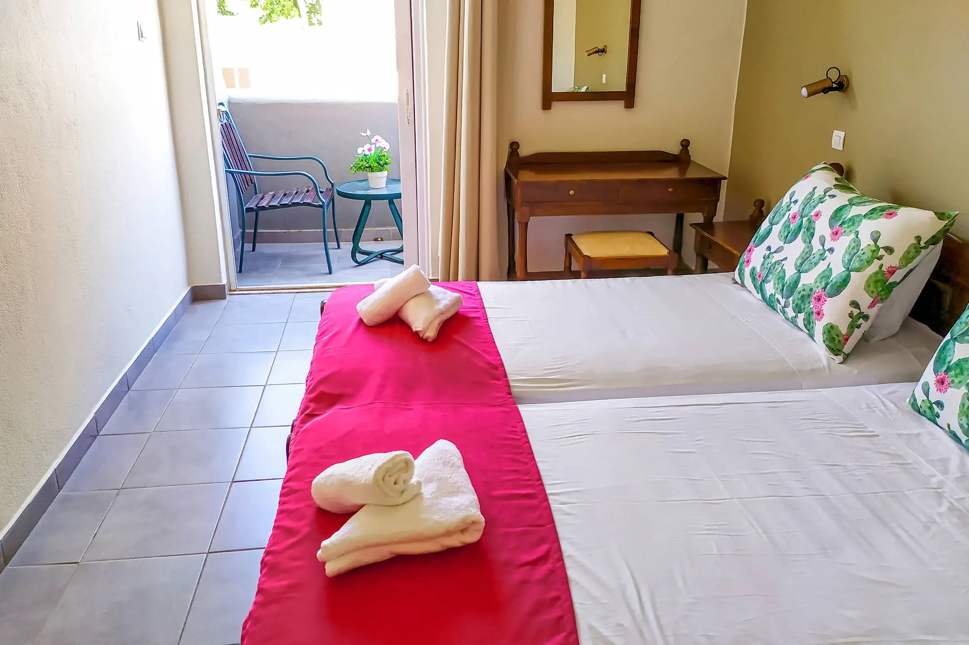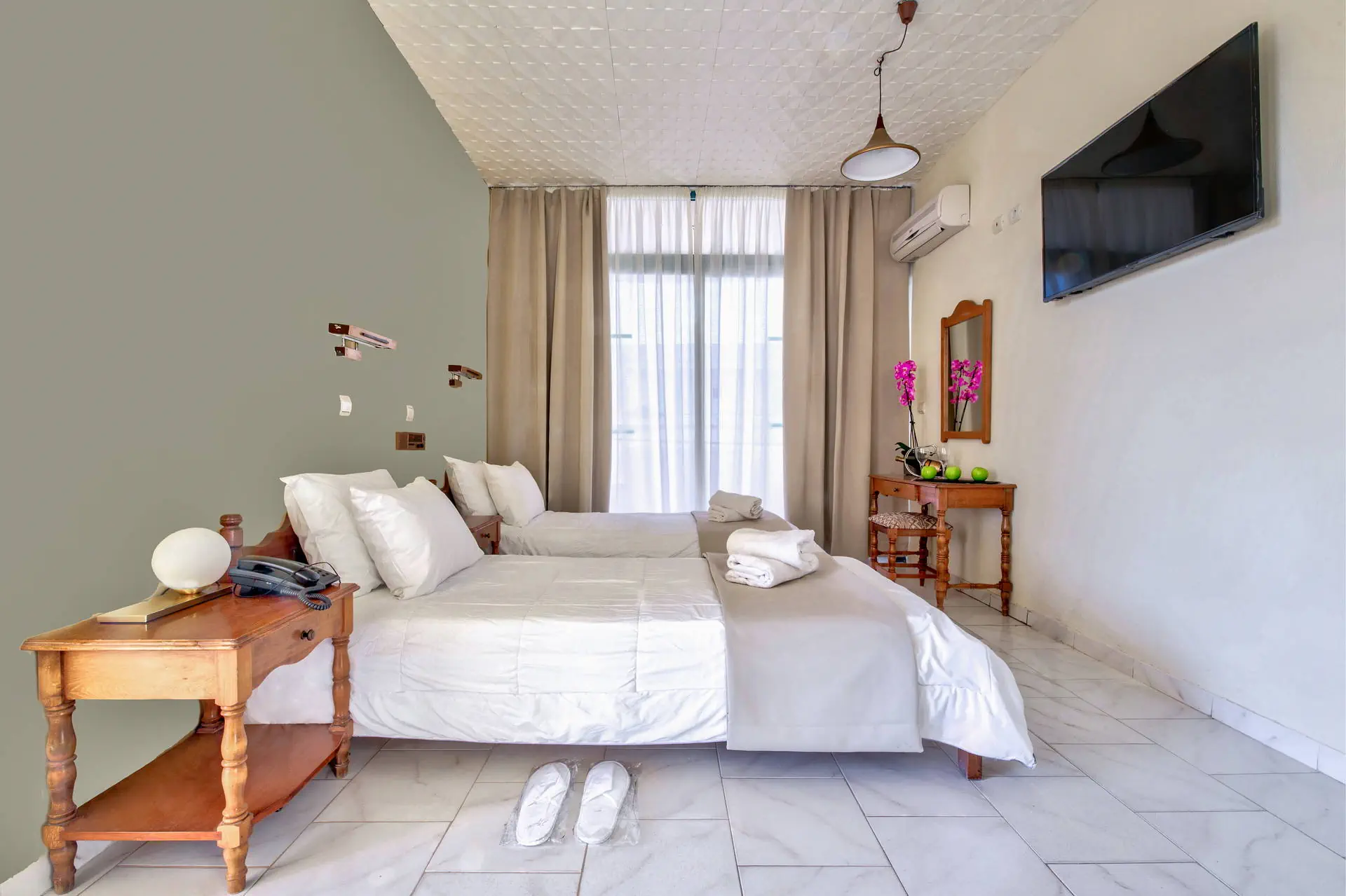 Położenie Kameralny obiekt położony na południowym wybrzeżu wyspy Kos, w odległości ok. 450 m od centrum urokliwego portowego miasteczka Kardamena. W okolicy znajdują się restauracje, kawiarnie, bary i sklepy. Do najbliższego przystanku komunikacji publicznej ok. 450 m, do lotniska międzynarodowego ok. 8 km. UWAGA! Cena nie obejmuje lokalnego podatku turystycznego w wysokości 5 EUR/pokój/dzień. Podatek jest obligatoryjny i płatny bezpośrednio w recepcji, przed zakwaterowaniem Klientów w hotelu. Plaża Hotel znajduje się zaledwie ok. 20 m od piaszczystej plaży w Kardamenie. Leżaki i parasole na plaży płatne dodatkowo (bezpłatne przy minimalnej konsumpcji z baru o wartości min. 10 EUR), ręczniki plażowe bezpłatne (wymagany depozyt). Do dyspozycji gości Klimatyzowana, całodobowa recepcja z lobby, przechowalnia bagażu, sejf. Hotel posiada zewnętrzny basen i brodzik dla dzieci z wodą słodką (leżaki i parasole bez dodatkowych opłat). Jadalnia serwująca śniadania, restauracja Symposium, bar kawowy w lobby z tarasem oferującym widok na morze, bar przy basenie serwujący wybór alkoholi i napojów bezalkoholowych, a także przekąski (kanapki, pizza, tortille). Darmowy parking. Hotel nie jest przystosowany dla osób niepełnosprawnych. Obiekt nie akceptuje zwierząt. Płatne dodatkowo: wypożyczalnia samochodów i rowerów, wymiana walut, usługi pralnicze. Pokoje Obiekt posiada 64 pokoje w dwóch budynkach. W ofercie znajdują się pokoje standard (z widokiem na ogród) oraz superior (z bocznym widokiem na morze, z możliwością jednej dostawki), a także przestronniejsze pokoje rodzinne (widok na ogród, możliwość zakwaterowania maksymalnie 4 osób). Pokoje posiadają balkon lub taras z krzesełkami i wyposażone są w indywidualnie sterowaną klimatyzację (płatna dodatkowo ok. 40 EUR/tydzień, mini lodówkę, TV Sat, telefon, łazienkę z WC i prysznicem. Suszarka do włosów oraz łóżeczko dla niemowlęcia dostępne są nieodpłatnie na życzenie. Niemowle wlicza się do maksymalnego obłożenia pokoju. Wyżywienie Śniadania w formie bufetu z kącikiem greckim. Za dodatkową opłatą kolacje lub lunche i kolacje w restauracji. Oferta barów płatna dodatkowo. Dodatkowo dostępna dopłata do All Inclusive Light: śniadania (07:00-09:30), lunche (12:30-14:15) i kolacje (19:00-21:00) w restauracji głównej (do posiłków napoje bezalkoholowe oraz lokalne piwo i wino), lekkie przekąski (11:00-12:30 i 14:30-16:00), przerwa kawowa (16:00-17:00), napoje bezalkoholowe i lokalne alkohole w barze przy basenie (11:00-12:30, 14:30-16:00 oraz 21:00-22:00). Program sportowy i animacyjny Hotel nie prowadzi programu animacyjnego. Bezpłatnie: tenis stołowy. Za dodatkową opłatą: bilard. Internet Bezpłatny internet WiFi dostępny na terenie obiektu. Kategoria lokalna *** Naszym zdaniem Kameralny hotel w lubianej przez turystów Kardamenie, w atrakcyjnej lokalizacji blisko plaży. Polecamy osobom ceniącym sobie korzystny stosunek jakości do ceny. Strona www