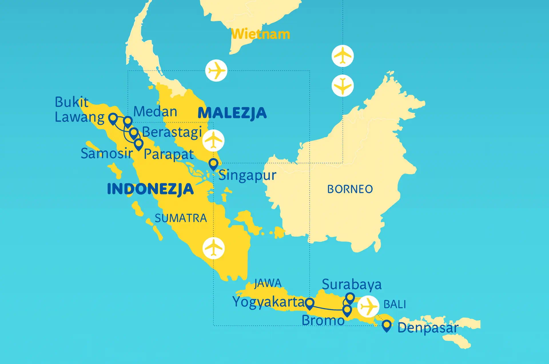 Do dyspozycji gości w hotelu restauracja i bar Zakwaterowanie Część objazdowa Hotele dobrej klasy,odpowiadające standardowi ***/**** w ocenie organizatora. wyjątek! Bromo Cottage, Bukit Lawang i Samosir (**) Pokoje: we wszystkich hotelach są wyposażone w łazienki z wc i klimatyzację, a często w TV i często mini bar (dodatkowo płatny). Część pobytowa Hotele: opisy poszczególnych hoteli w części dotyczących wczasów na Bali.