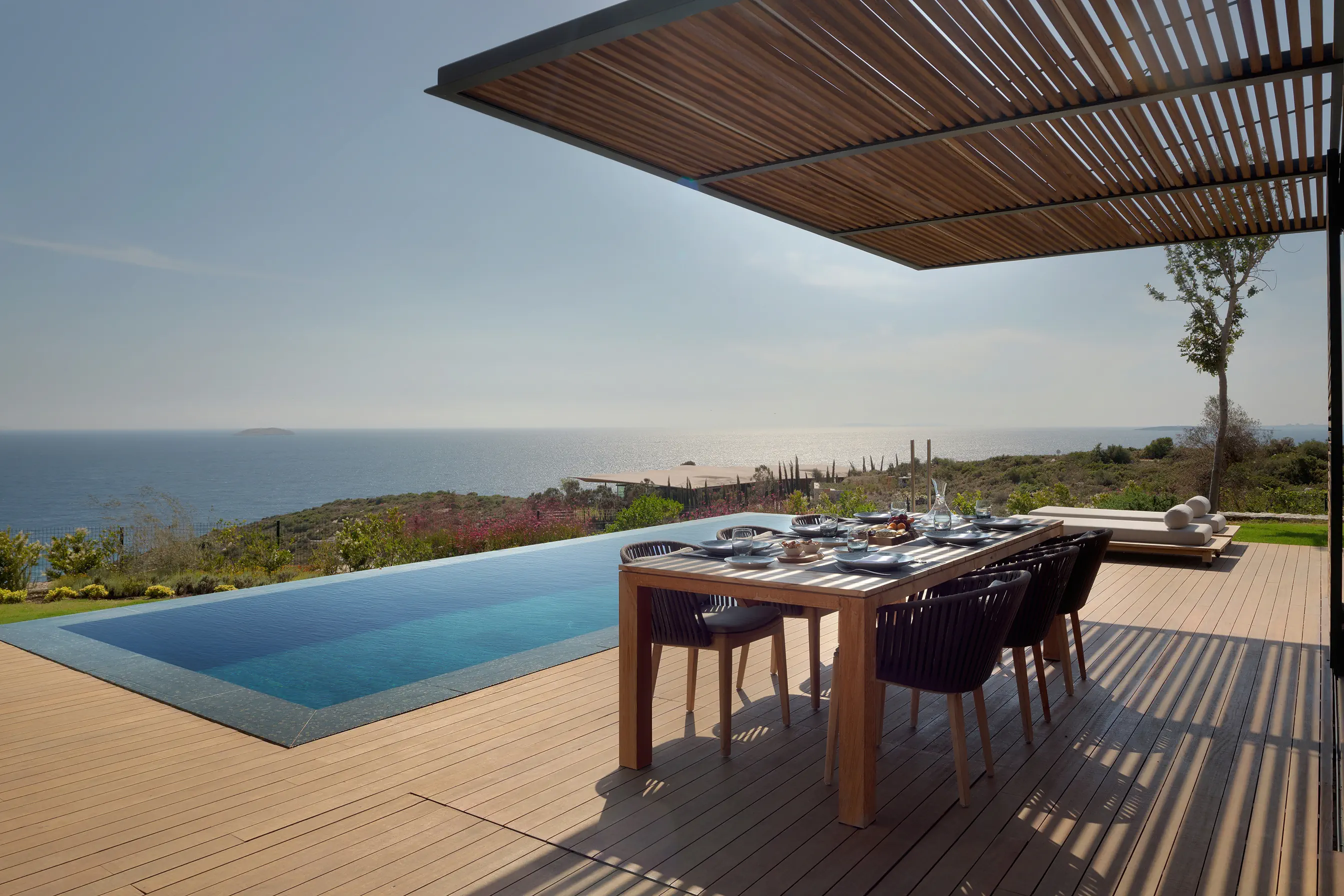 Dla max. 6 osób, Przestrzeń zewnętrzna: Taras, Kanały telewizji: Polski, Angielski, Telefon w pokoju, Aneks kuchenny, wanna i prysznic , Powierzchnia pokoju: ok. 175 - 185 m2, Dostawka: sofa, Rodzaj podłogi: drewno, Sprzątanie codziennie, Salon, część jadalniana, miejsce do pracy, 3 sypialnie, Drzwi łączące między pokojami, Maksymalna liczba osób dorosłych: 6, Maksymalna liczba dzieci: 1, Prysznic na świeżym powietrzu, Widok na basen i morze,Widok na morze, Bezpośredni dostęp do plaży, Prywatny basen, Liczba łazienek: 3, Liczba toalet: 3, Kuchenka mikrofalowa, Zestaw do parzenia kawy i herbaty, Klimatyzacja: Klimatyzacja indywidualna