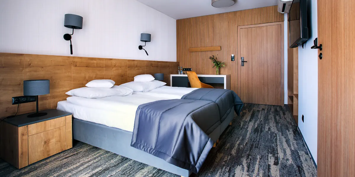 Komfortowo wyposażony pokój z klimatyzacją i balkonem z widokiem na góry. W pokoju mini lodówka, czajnik, smart TV, wifi, szlafroki i łazienka