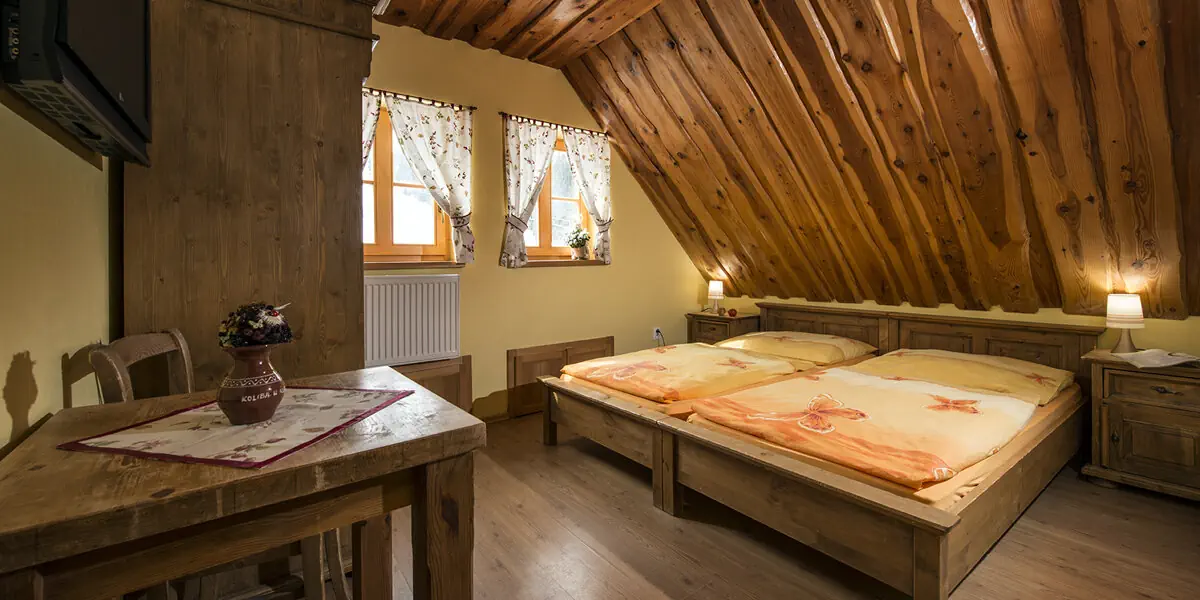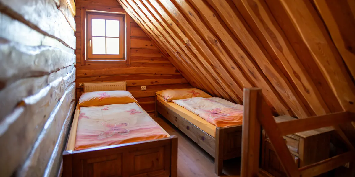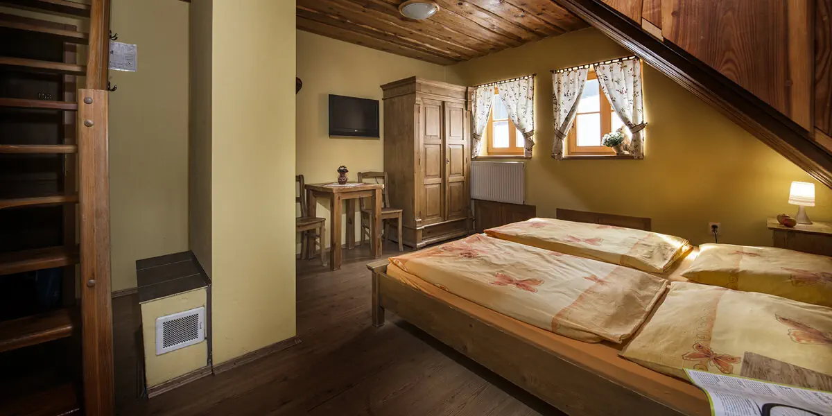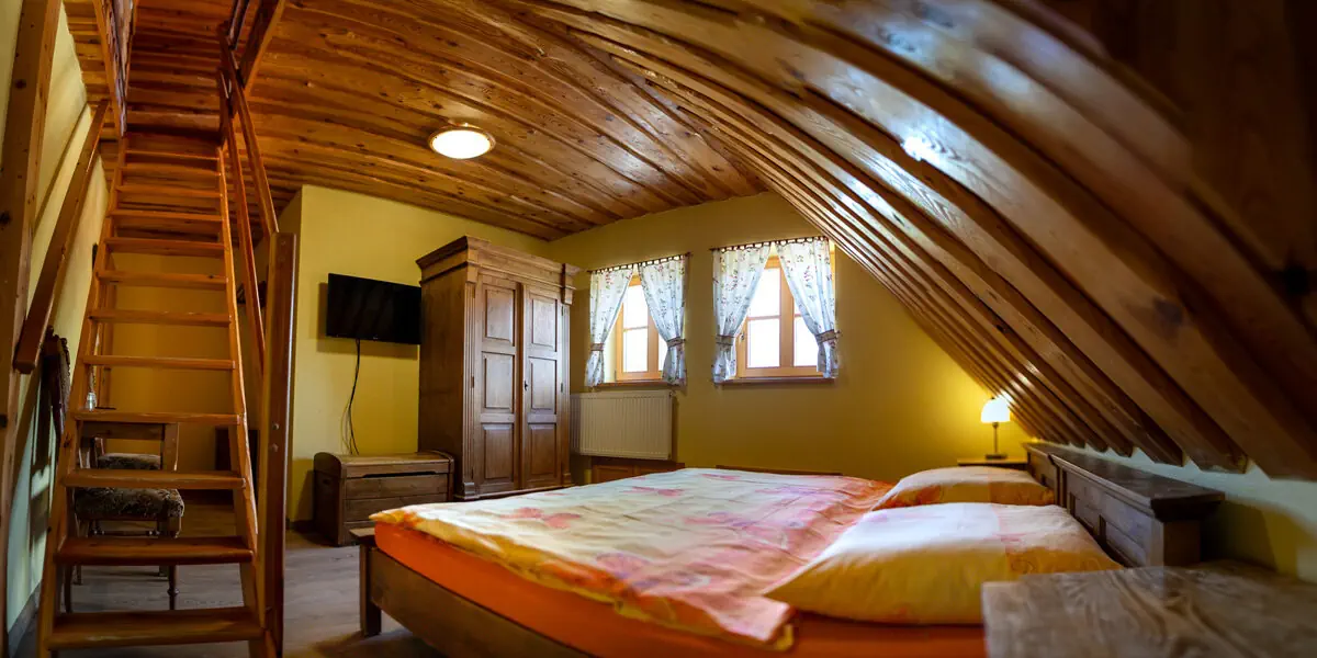Dwupoziomowy pokój z jedną sypialnią na dole i drugą na antresoli oraz z łazienką w Kolibie u Kuba 2*