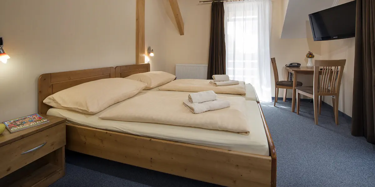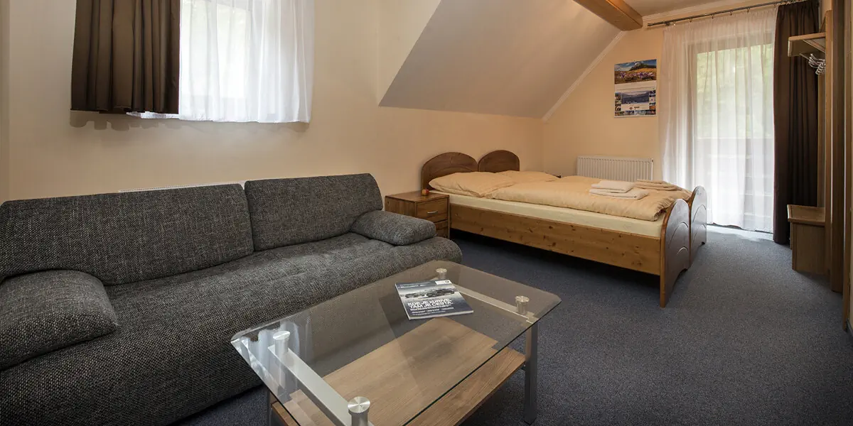 Kameralny apartament z częścią wypoczynkową i łazienką w hotelu 3*. Niektóre pokoje mają balkon. Dostawki na rozkładanej sofie.