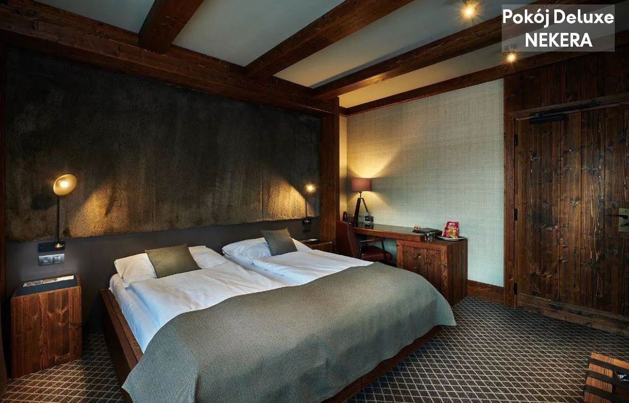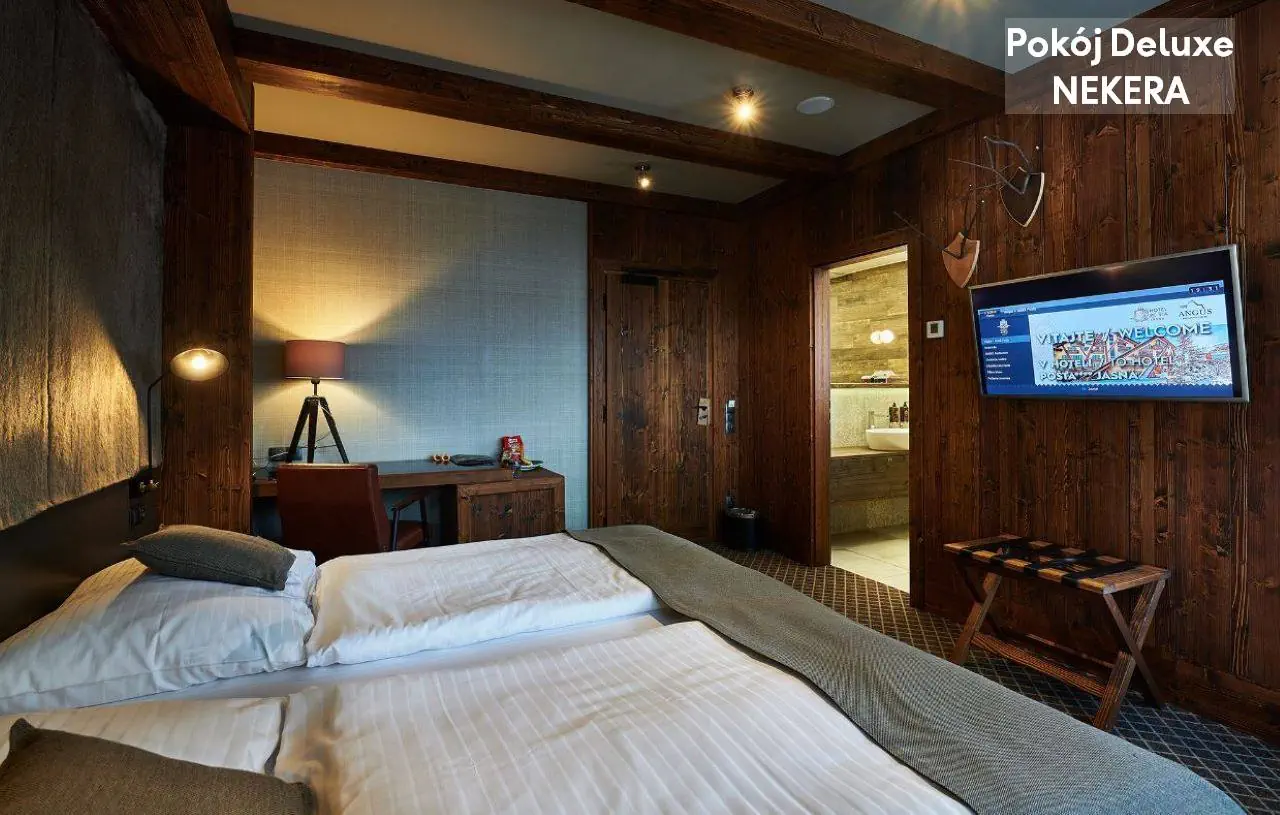 komfortowe, gustownie urządzone w górskim stylu pokoje dwuosobowe Deluxe: ok. 20 m2; ogrzewanie, TV-Sat., telefon, sejf, minibar (za opłatą), wanna lub prysznic, WC, suszarka, szlafrok.