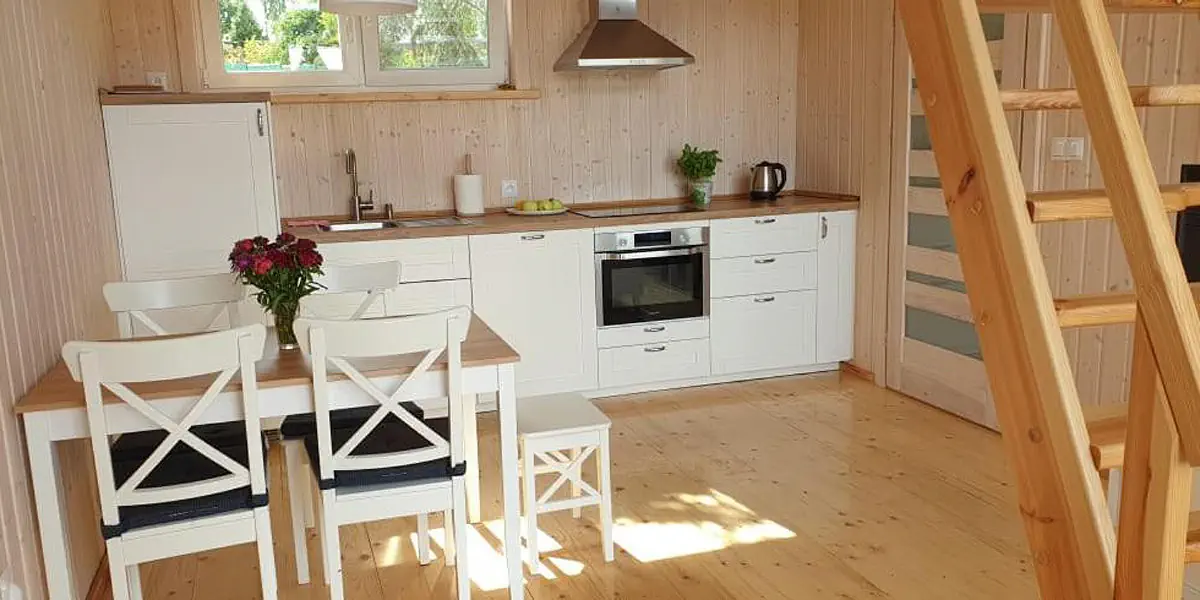Domek z salonem, aneksem kuchennym, łazienką, sypialnią na antresoli i tarasem