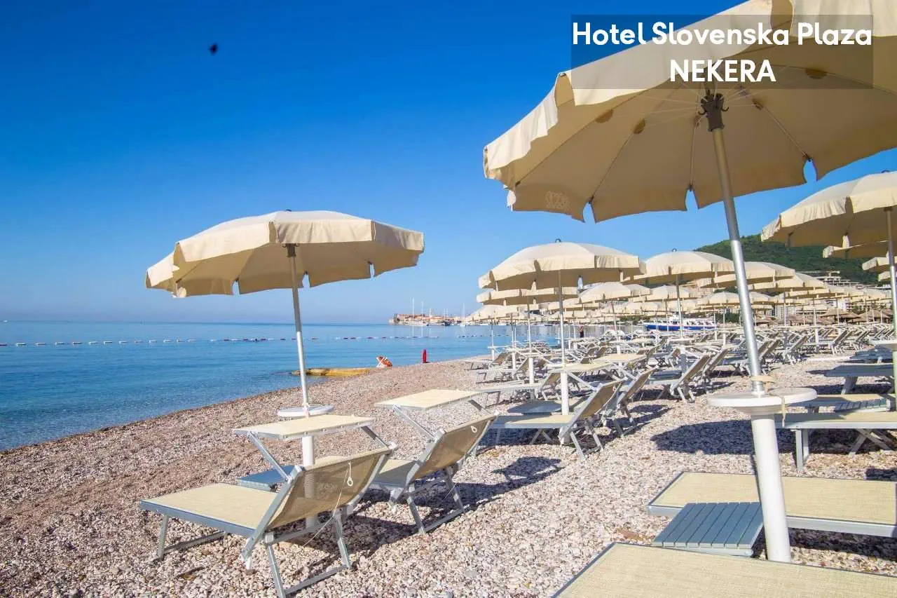 Publiczna piaszczysto-żwirowa plaża oddalona o ok. 150-250 metrów od hotelu (odległość zależy od położenia pokoju w resorcie). Leżaki i parasole słoneczne za dodatkową opłatą (ok. 8-15 EUR za zestaw 2 leżaki i parasol)