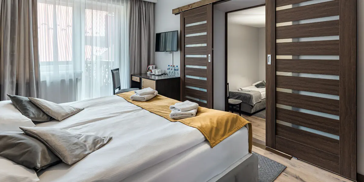 Komfortowy pokój z łóżkiem podwójnym i dwoma łóżkami pojedynczymi z możliwością złączenia. W wyposażeniu: TV, WiFi, czajnik, lodówka, łazienka z prysznicem, suszarką i kompletem ręczników.