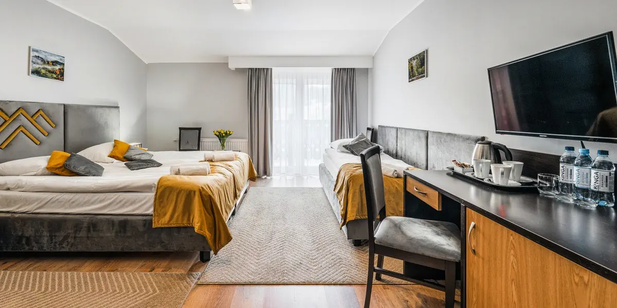 Komfortowy pokój z dwoma łóżkami pojedynczymi z możliwością złączenia oraz zestawem wypoczynkowym. W wyposażeniu: TV, WiFi, czajnik, serwis kawowy, lodówka, łazienka z prysznicem, suszarką i kompletem ręczników.