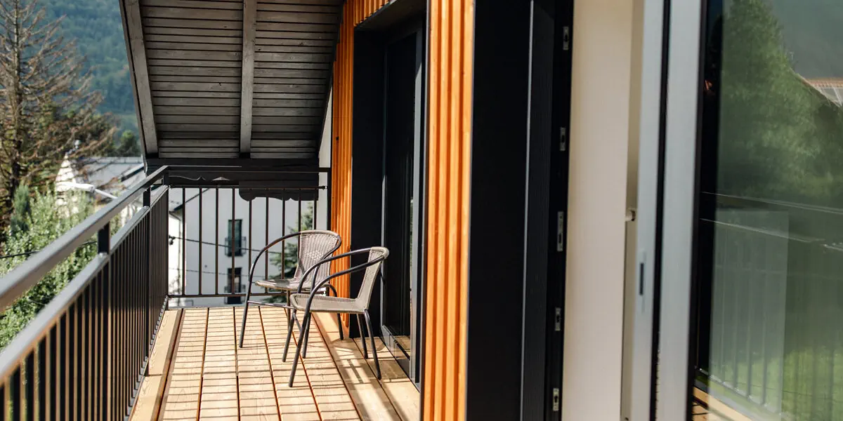 Nowoczesny pokój z balkonem z widokiem na góry i dodatkową sofą, mogącą pełnić rolę dostawki. W wyposażeniu czajnik, TV, wifi, ręczniki. W łazience prysznic, kosmetyki, suszarka do włosów
