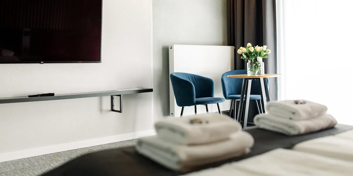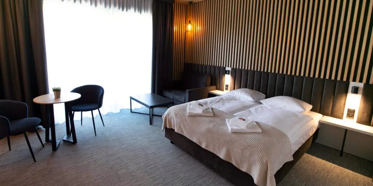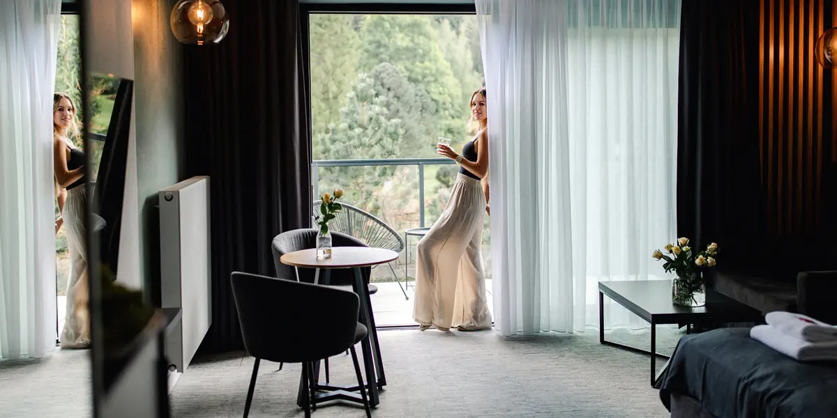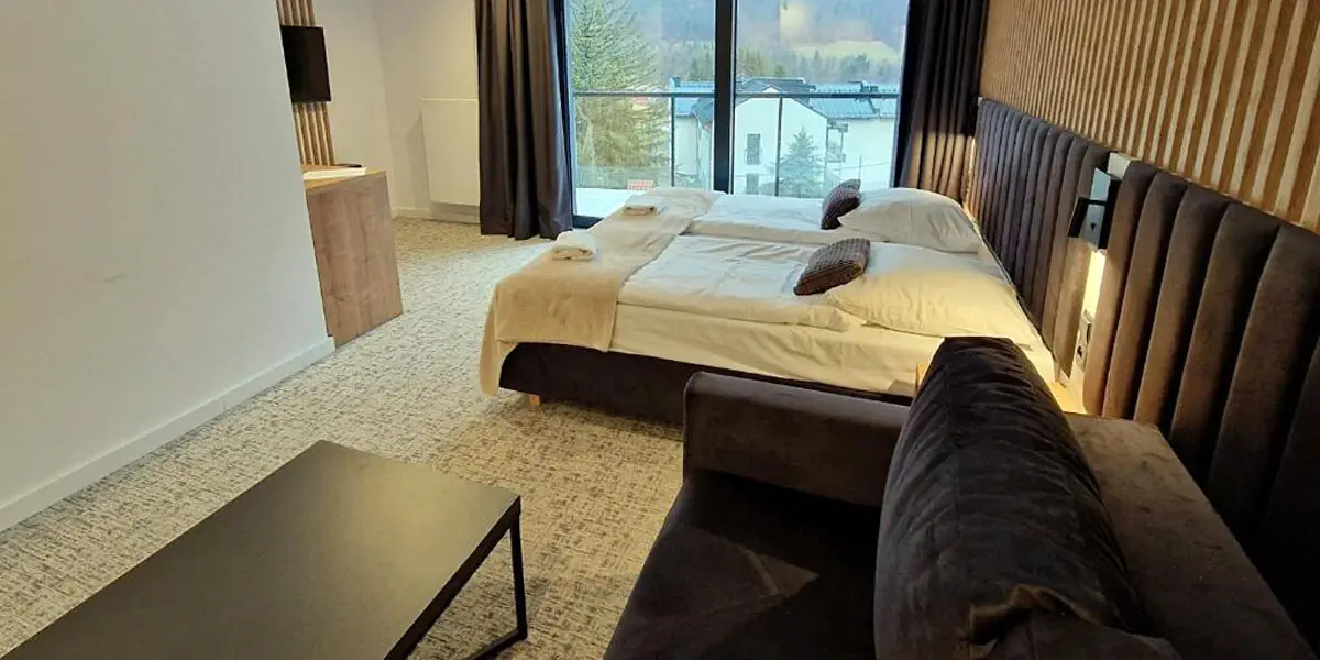 Nowoczesny i przestronny pokój z balkonem z widokiem na góry i dodatkową sofą, mogącą pełnić rolę dostawki. W wyposażeniu lodówka, czajnik, TV, wifi, ręczniki. W łazience prysznic, kosmetyki, suszarka do włosów