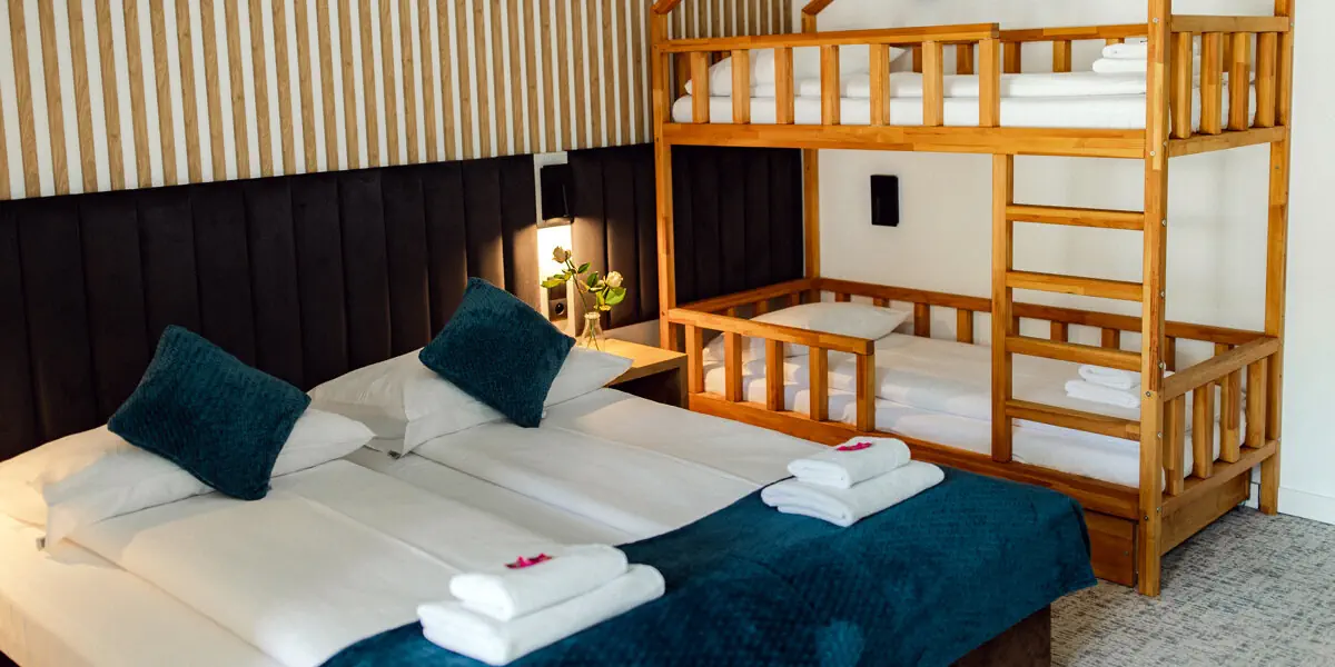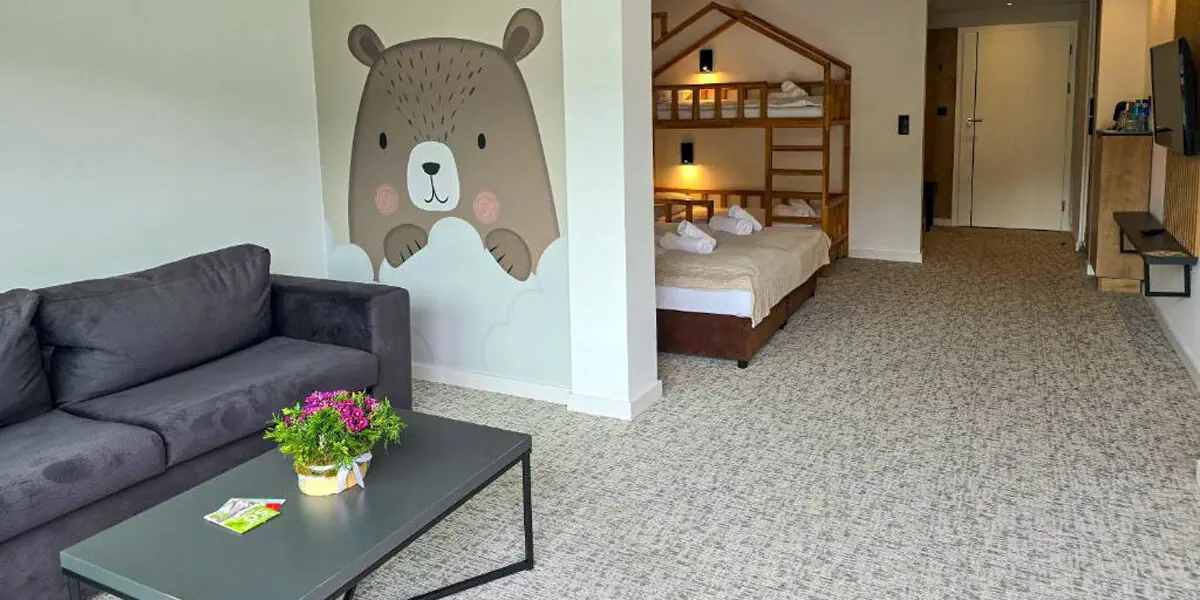 Przestronny pokój z balkonem z widokiem na góry. W części sypialnej 2 łóżka pojedyncze i łóżko piętrowej, w części dziennej rozkładana sofa, mogąca pełnić rolę dostawki. W wyposażeniu czajnik, TV, wifi, ręczniki. W łazience prysznic, kosmetyki, suszarka do włosów