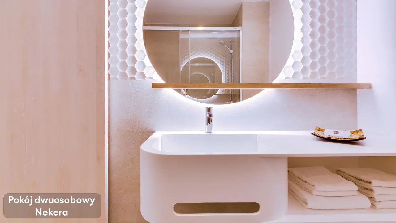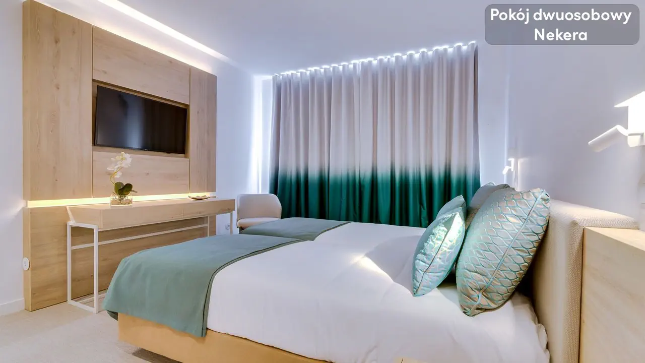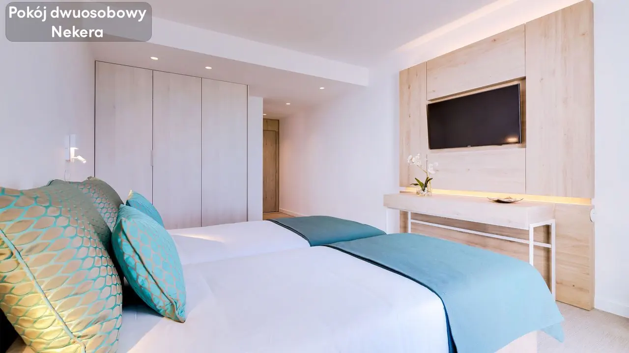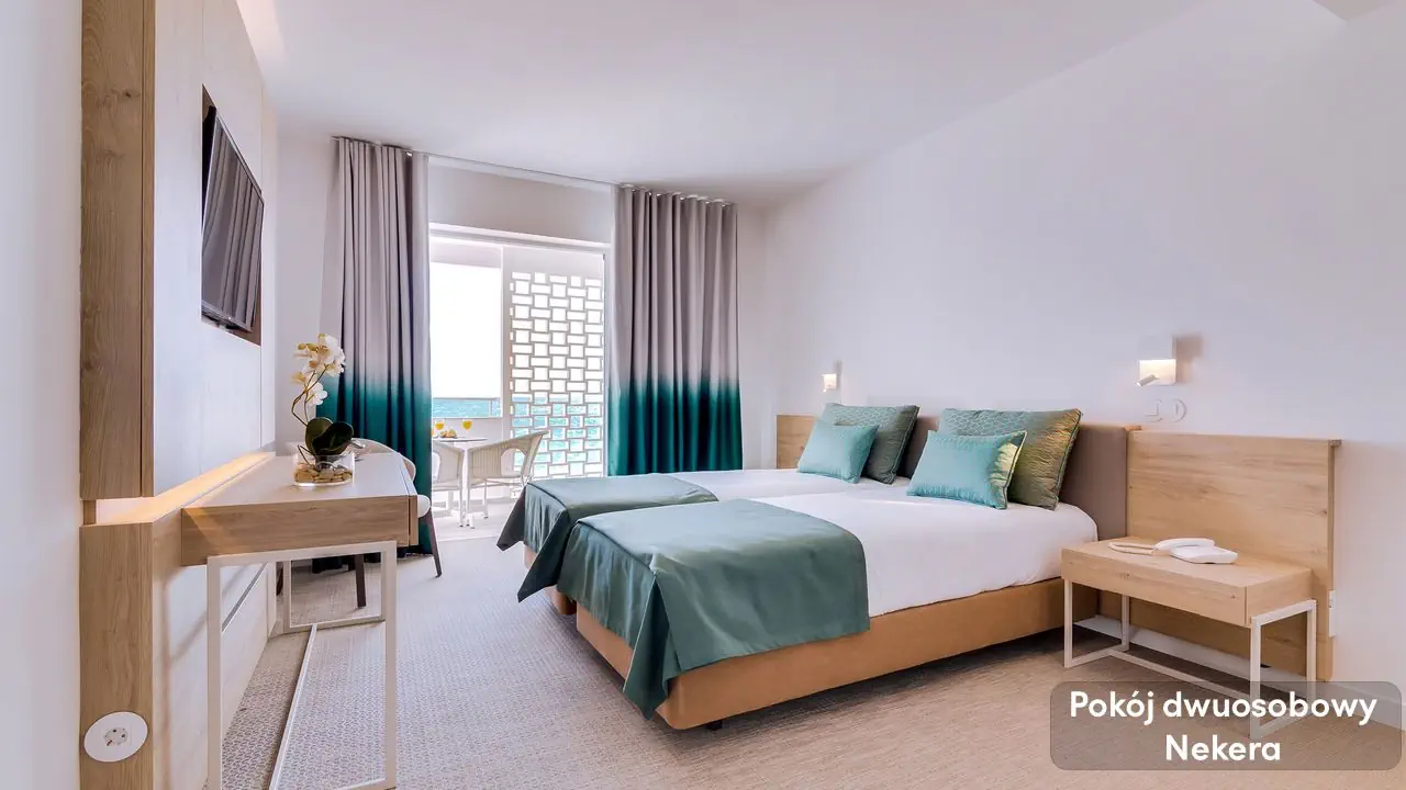 Pokój Dwuosobowy - ok. 17 m², - 2 łóżka pojedyncze lub 1 łóżko podwójne, - wyposażona łazienka (wanna lub prysznic, suszarka do włosów,) - klimatyzacja, - TV, - minibar (płatny), - sejf (płatny), - Wi-Fi, - balkon z widokiem na ocean, Pokój Trzyosobowy - ok. 17 m², - max. 3 osoby, - balkon z widokiem na ocean, - podobne wyposażenie,