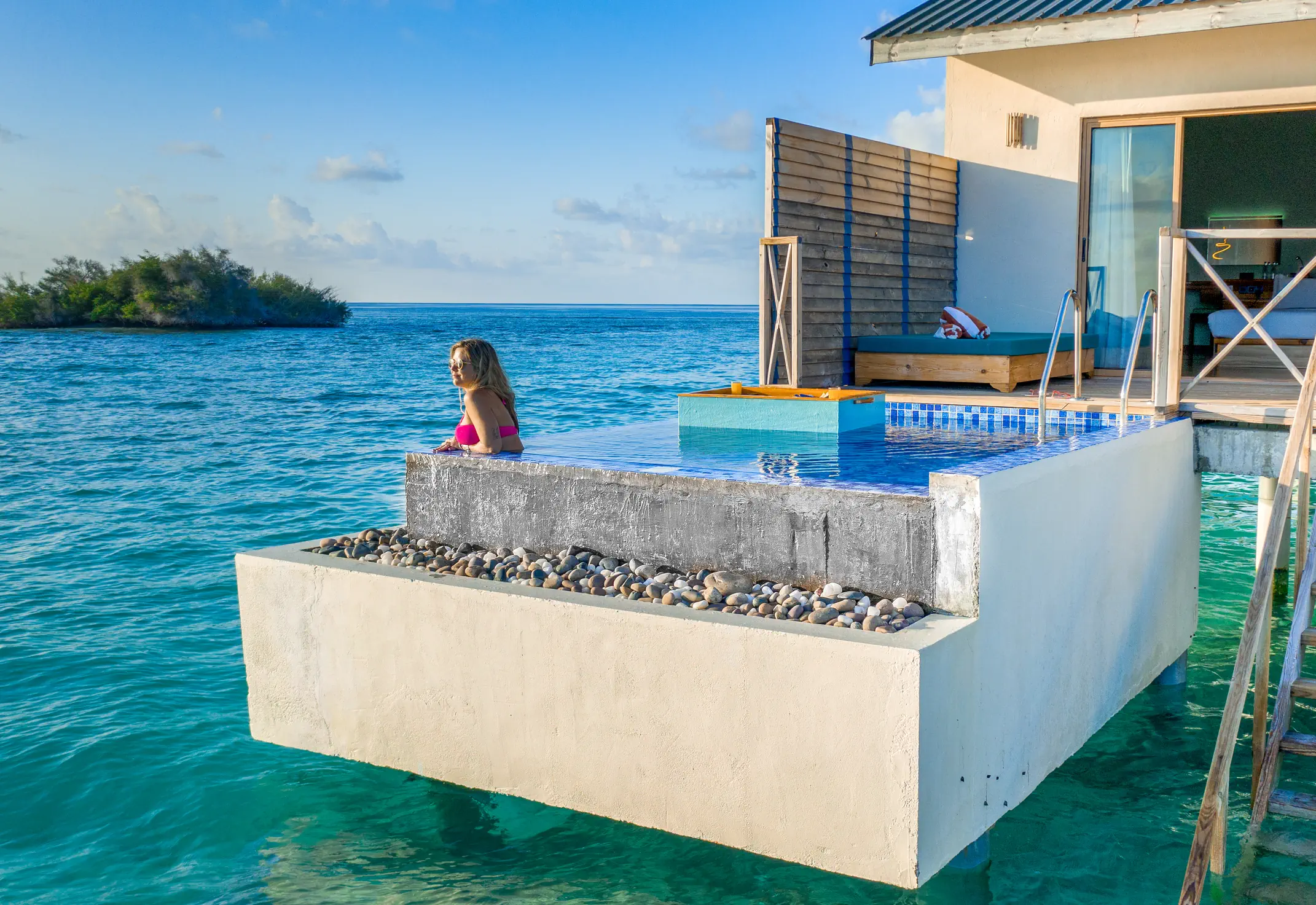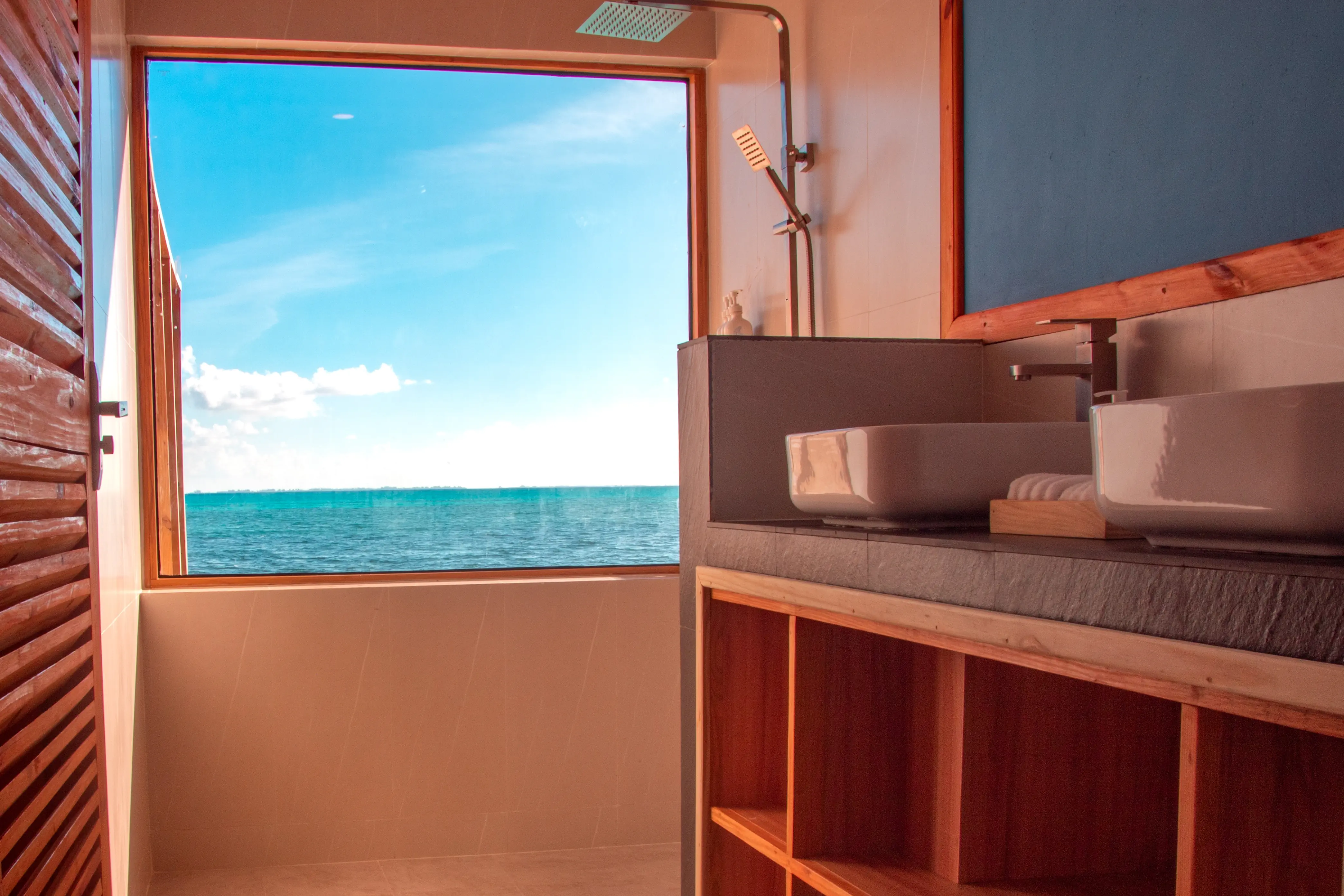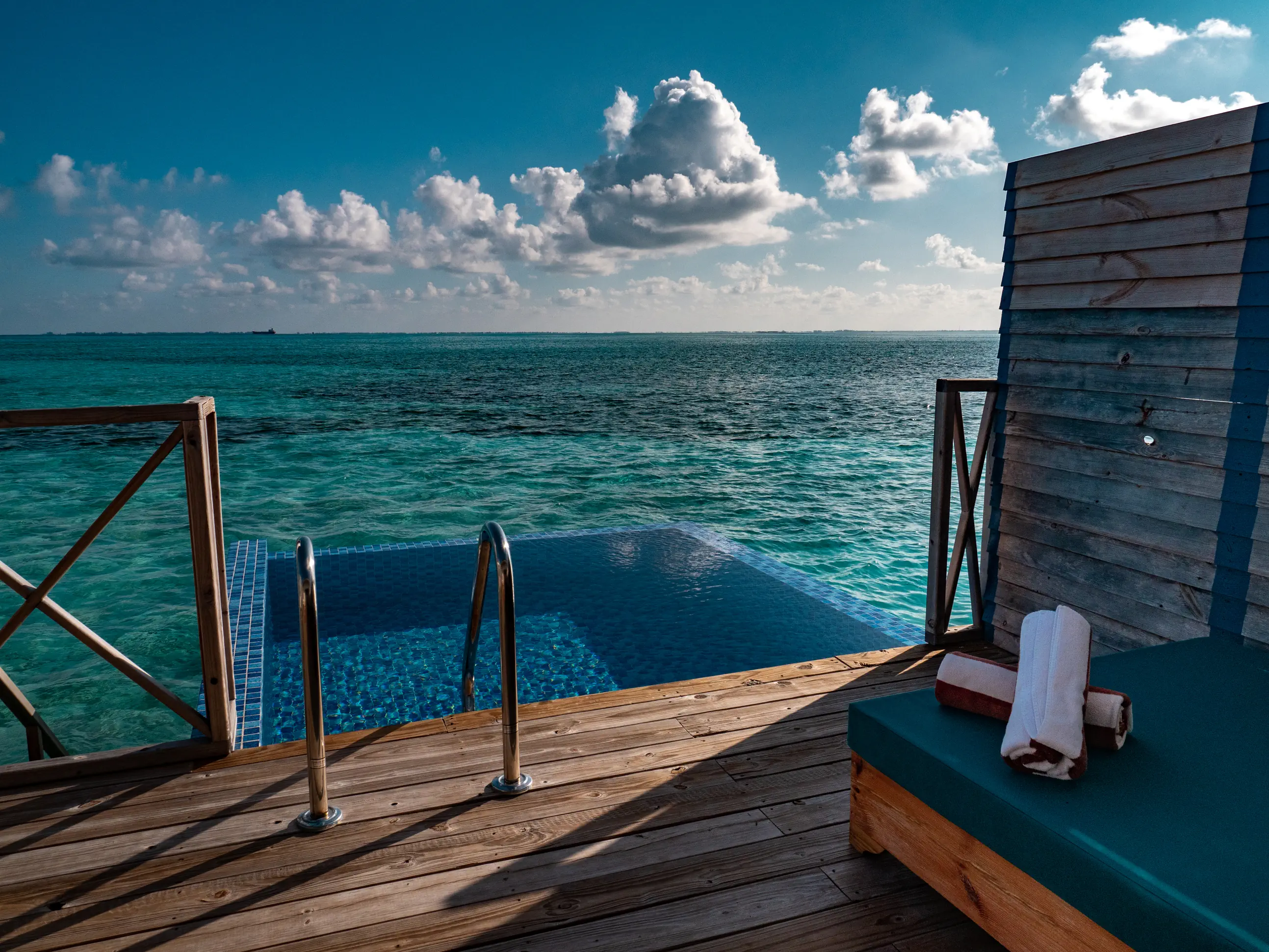 Dla max. 3 osób, Przestrzeń zewnętrzna: Taras, Kanały telewizji: Angielski, Telefon w pokoju, prysznic, Powierzchnia pokoju: ok. 75 m2, Dostawka: łóżko rozkładane, Rodzaj podłogi: płytki, Sprzątanie codziennie, część jadalniana, miejsce do pracy, 1 sypialnia, Przepierzenie, Maksymalna liczba osób dorosłych: 3, Maksymalna liczba dzieci: 2, Concierge (bezpłatnie), Kwiaty i owoce, Widok na lagunę,Frontalny widok na morze,Widok na morze, Bezpośredni dostęp do plaży, Prywatny basen, Liczba łazienek: 1, Liczba toalet: 1, Zestaw do parzenia kawy i herbaty, Klimatyzacja: Klimatyzacja indywidualna