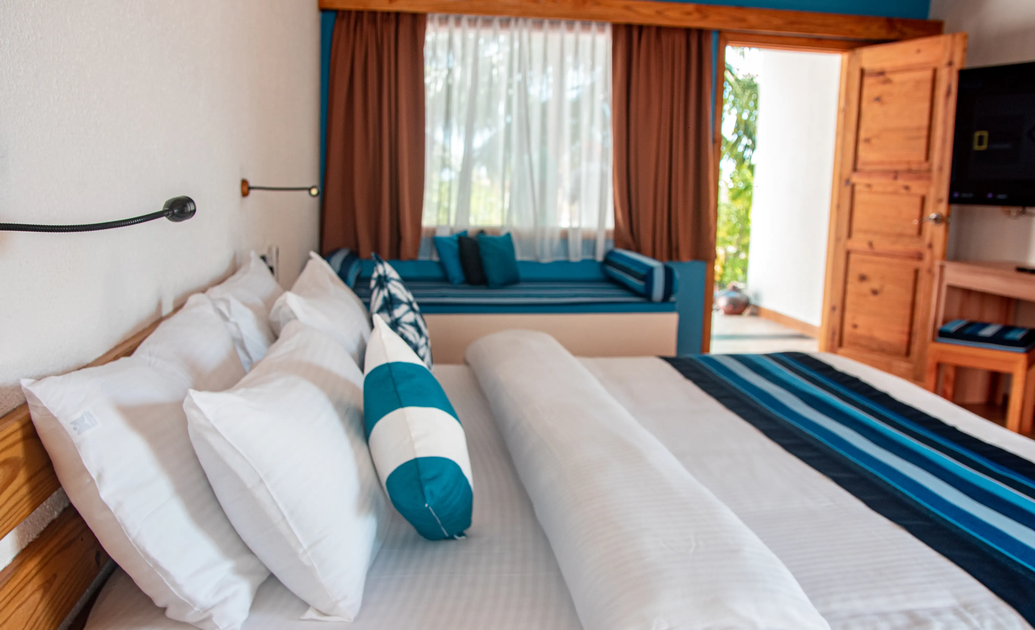 Dla max. 4 osób, Przestrzeń zewnętrzna: Taras, Kanały telewizji: Angielski, Telefon w pokoju, prysznic, Powierzchnia pokoju: ok. 50 m2, Dostawka: sofa, Rodzaj podłogi: płytki, Sprzątanie codziennie, część jadalniana, miejsce do pracy, 1 sypialnia, Maksymalna liczba osób dorosłych: 3, Maksymalna liczba dzieci: 2, Frontalny widok na plażę, Bezpośredni dostęp do plaży, Liczba łazienek: 1, Liczba toalet: 1, Zestaw do parzenia kawy i herbaty, Klimatyzacja: Klimatyzacja indywidualna