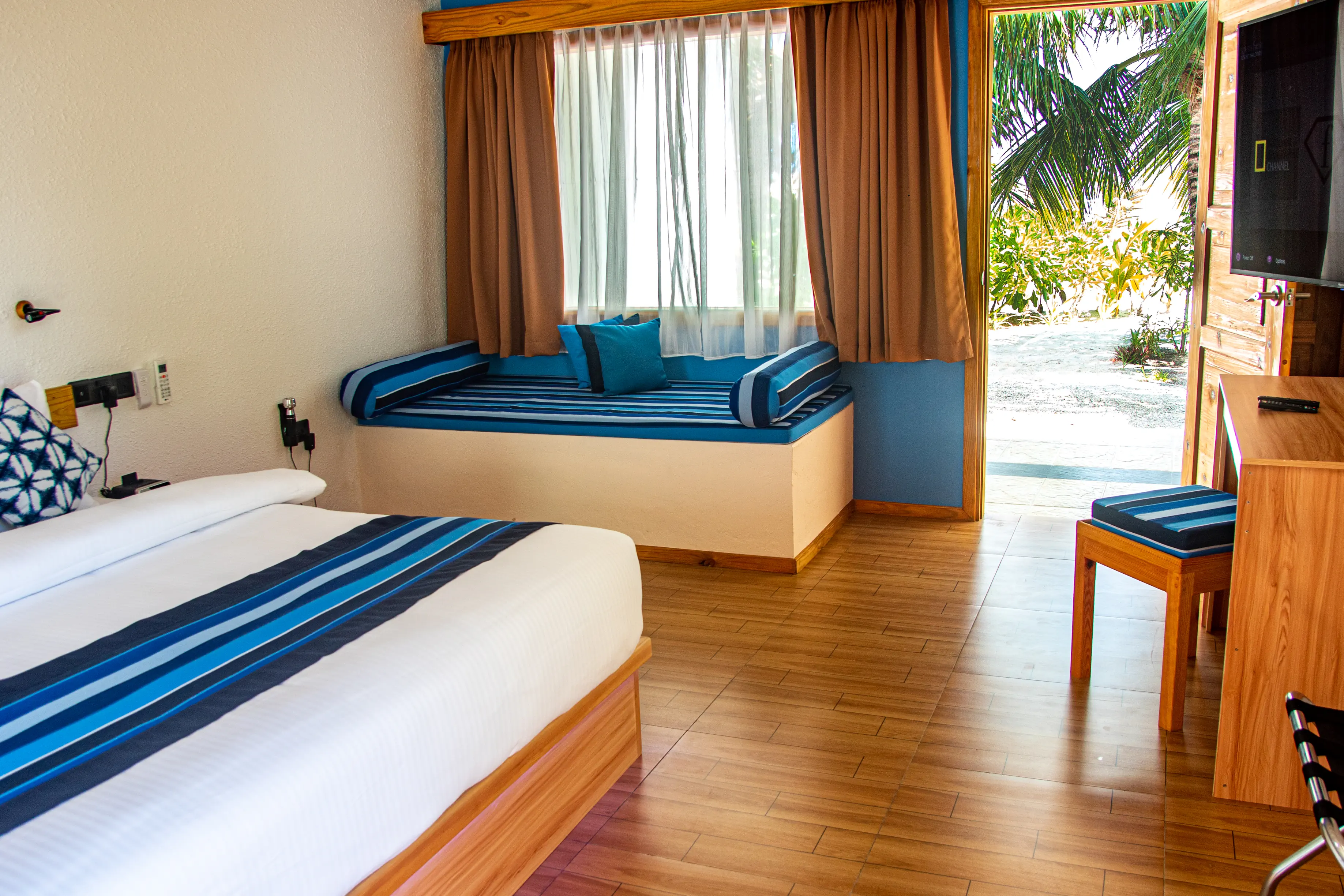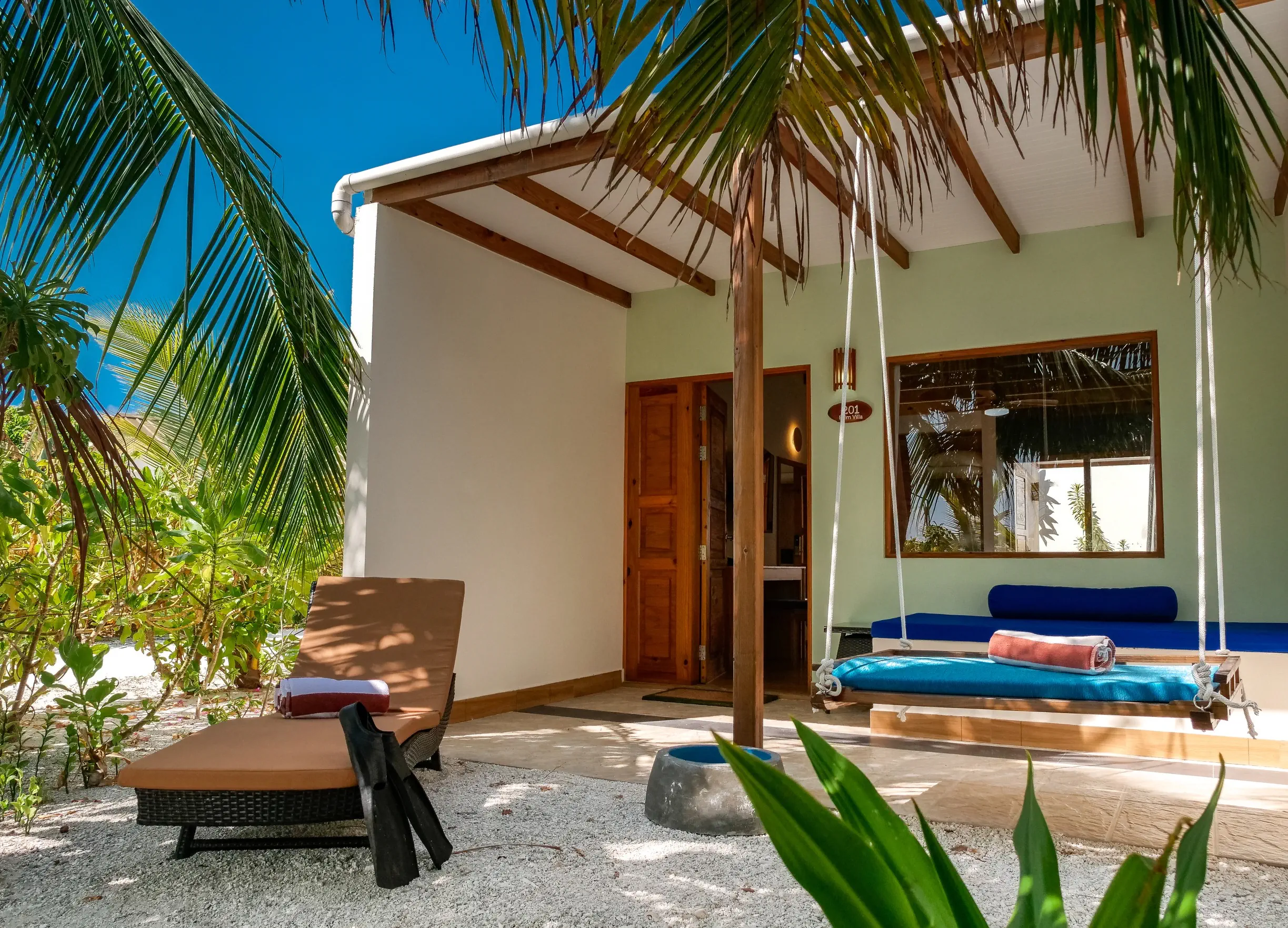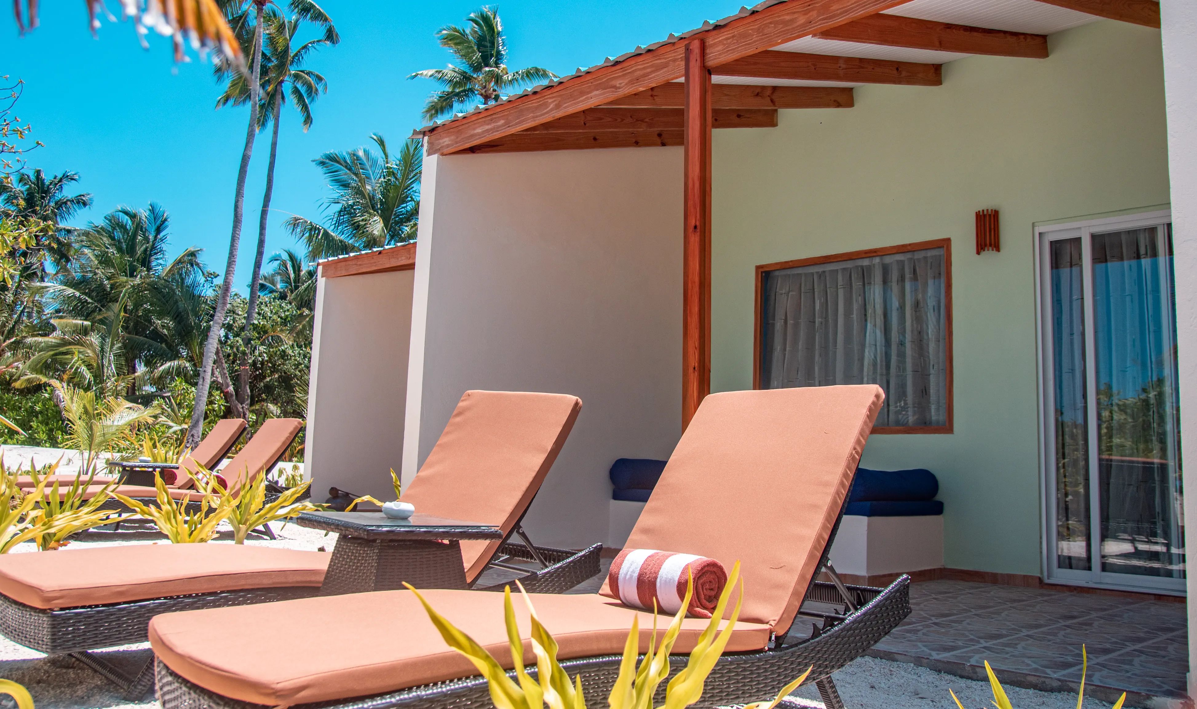 Dla max. 4 osób, Przestrzeń zewnętrzna: Taras, Kanały telewizji: Angielski, Telefon w pokoju, prysznic, Powierzchnia pokoju: ok. 50 m2, Dostawka: sofa, Rodzaj podłogi: płytki, Sprzątanie codziennie, część jadalniana, miejsce do pracy, 1 sypialnia, Maksymalna liczba osób dorosłych: 3, Maksymalna liczba dzieci: 2, Prysznic na świeżym powietrzu, Frontalny widok na plażę,Widok na ogród i morze,Widok na morze,Widok na palmy, Bezpośredni dostęp do plaży, Liczba łazienek: 1, Liczba toalet: 1, Zestaw do parzenia kawy i herbaty, Klimatyzacja: Klimatyzacja indywidualna