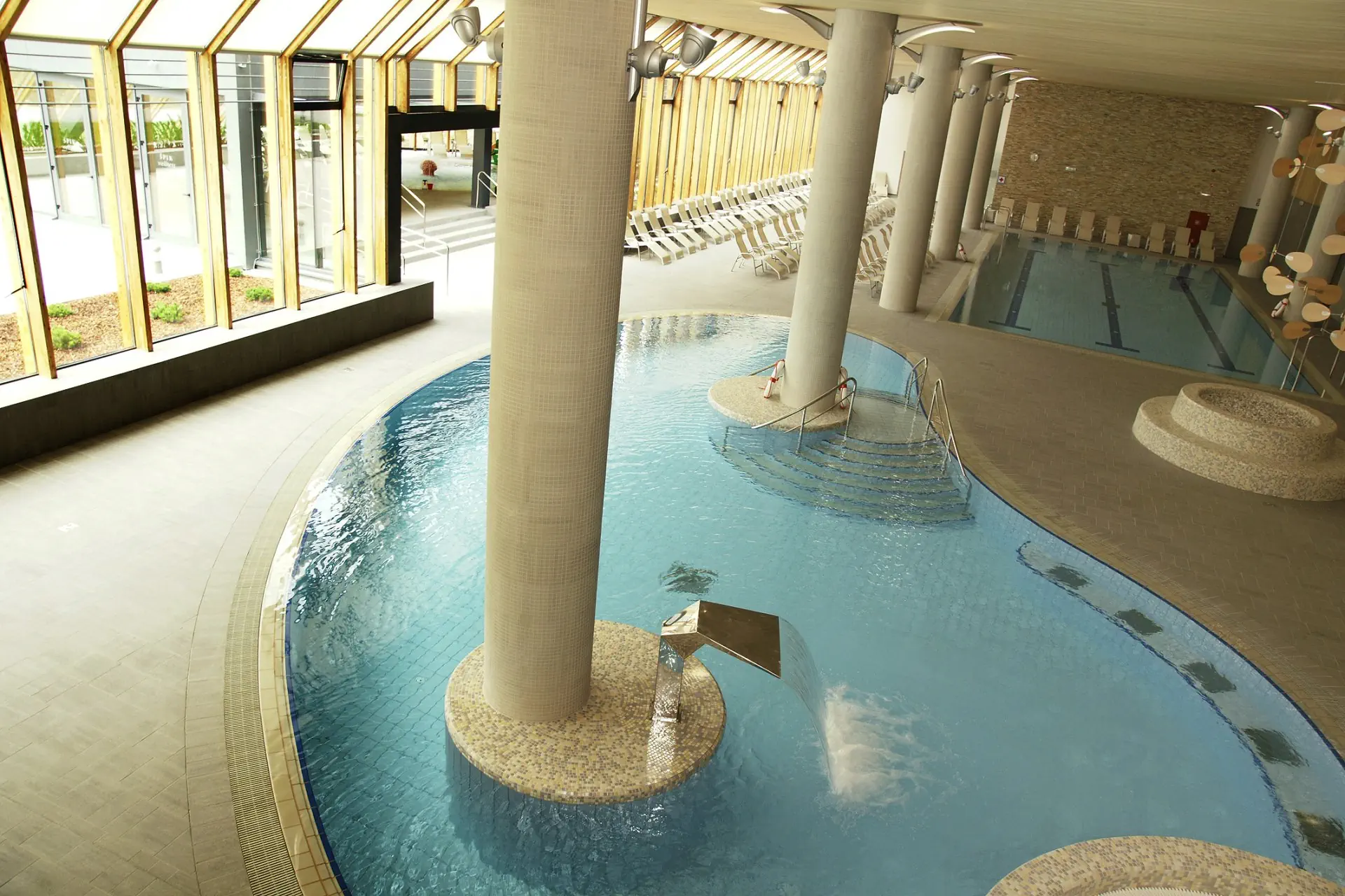 kryty "Wodny Świat" (powierzchnia 250 m2, basen relaksacyjny z kaskadą i ławkami do masażu, basen dla dzieci z urządzeniami do zabaw).