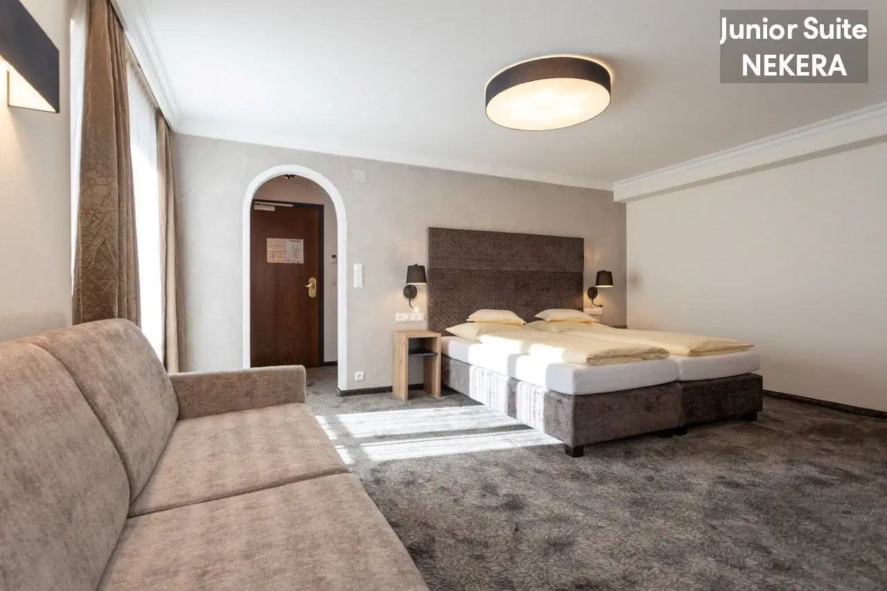 komfortowe, gustownie urządzone w tyrolskim stylu Junior Suite Söldenkogel: ok. 28-30 m2; ogrzewanie, TV-Sat., telefon, sejf, minilodówka, łóżko małżeńskie i rozkładana sofa dla 3. osoby, prysznic, WC, suszarka, szlafrok (do odbioru na recepcji). Junior Suite Schwarzkogel: przestronniejsze, ok. 32-34 m2; pomieszczenie dzienne z rozkładaną sofą dwuosobową oraz sypialnia przedzielone drzwiami przesuwnymi. 2 x TV-Sat., dla max. 4 osób; poza tym wyposażone jak Junior Suite Söldenkogel.