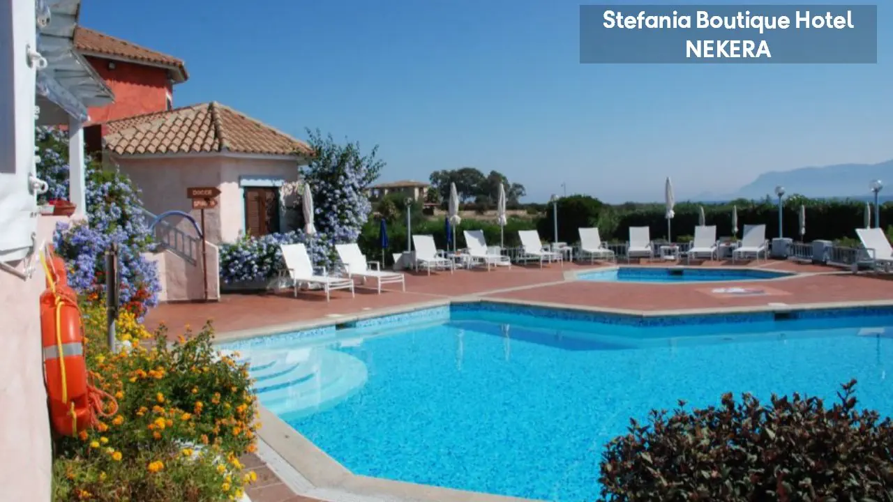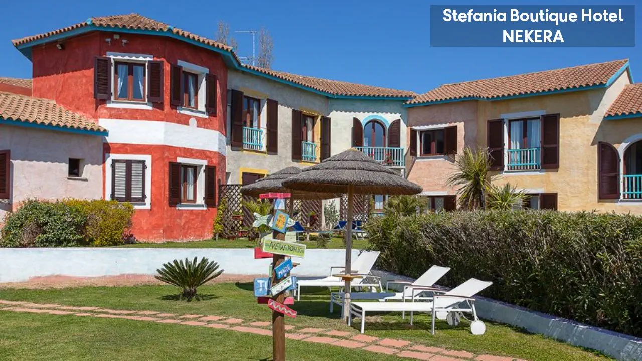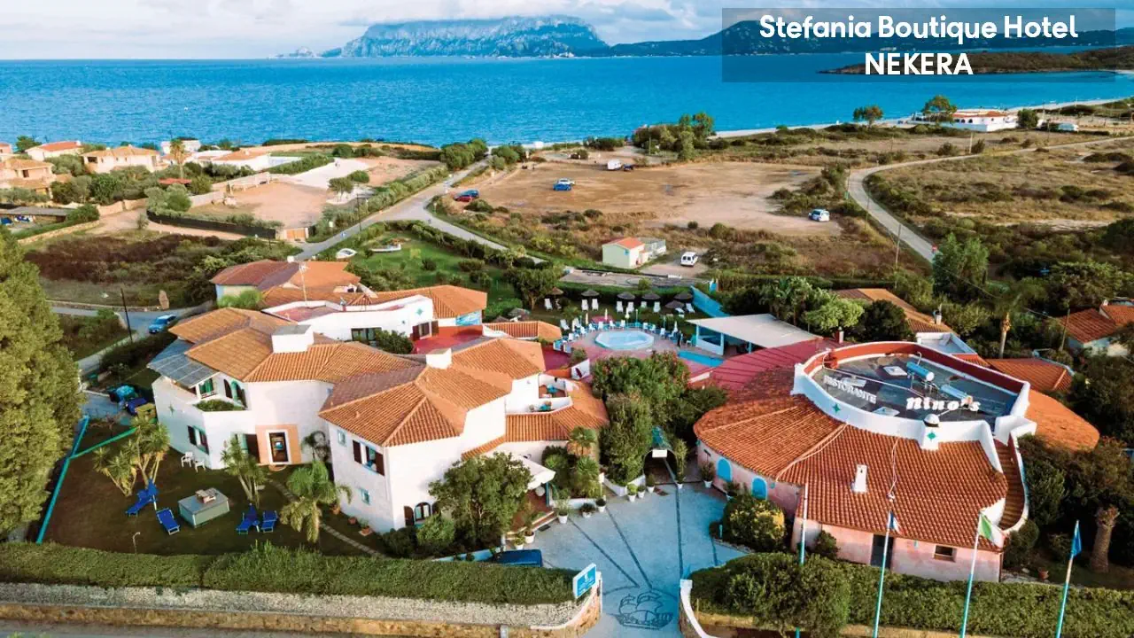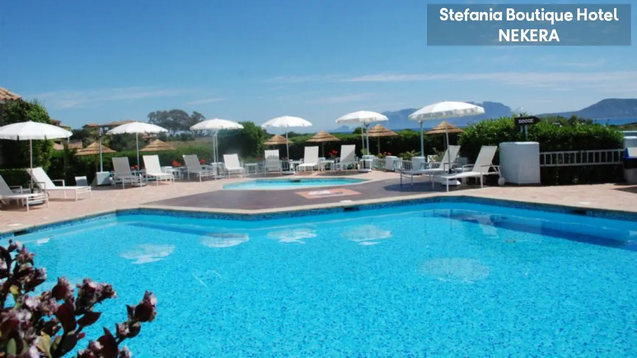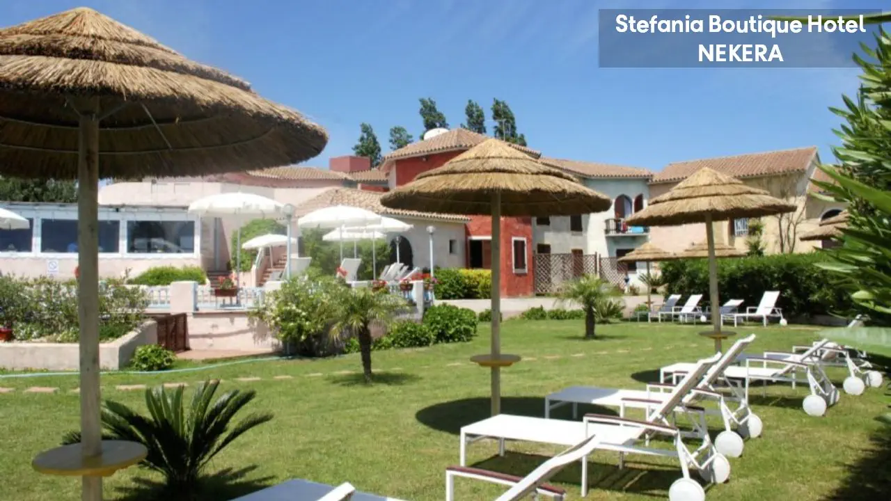 Hotel Stefania Boutique Hotel, w stylu mauretańsko-sardyńskim, składa się z dwóch części: budynku głównego (Main Building) i willi Stefania (Villa Stefania) oddzielonej spokojną uliczką. Oferuje 40 pokoi. Do dyspozycji Gości: recepcja z lobby, winda, restauracja Ninos z tarasem i widokiem na morze, bar, basen zewnętrzny z leżakami i parasolami, ogród, taras słoneczny, siłownia, strefa relaksu, czytelnia, bezpłatny parking. Dodatkowo płatne: pralnia, wypożyczalnia samochodów, rowerów, usługi medyczne na wezwanie,