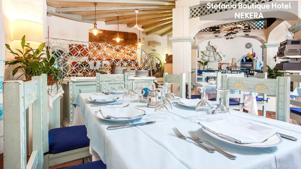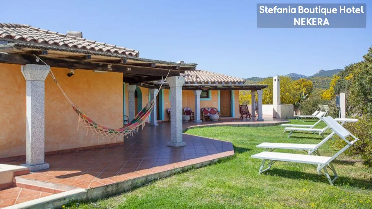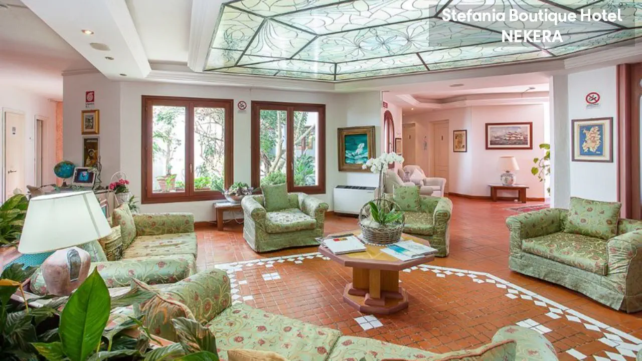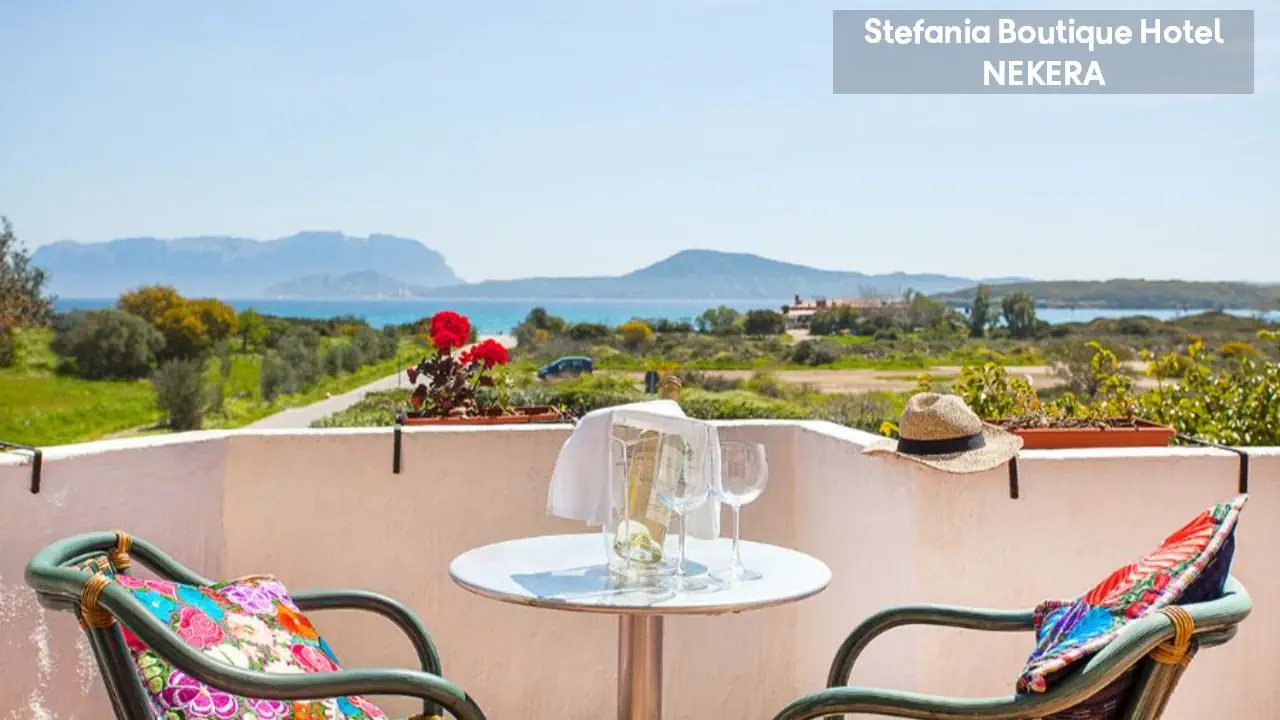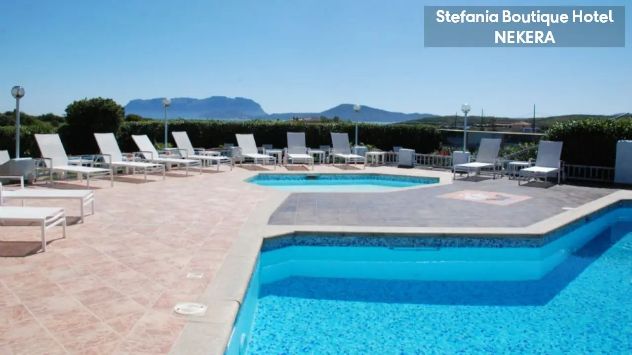 Hotel Stefania Boutique Hotel, w stylu mauretańsko-sardyńskim, składa się z dwóch części: budynku głównego (Main Building) i willi Stefania (Villa Stefania) oddzielonej spokojną uliczką. Oferuje 40 pokoi. Do dyspozycji Gości: recepcja z lobby, winda, restauracja Ninos z tarasem i widokiem na morze, bar, basen zewnętrzny z leżakami i parasolami, ogród, taras słoneczny, siłownia, strefa relaksu, czytelnia, bezpłatny parking. Dodatkowo płatne: pralnia, wypożyczalnia samochodów, rowerów, usługi medyczne na wezwanie,