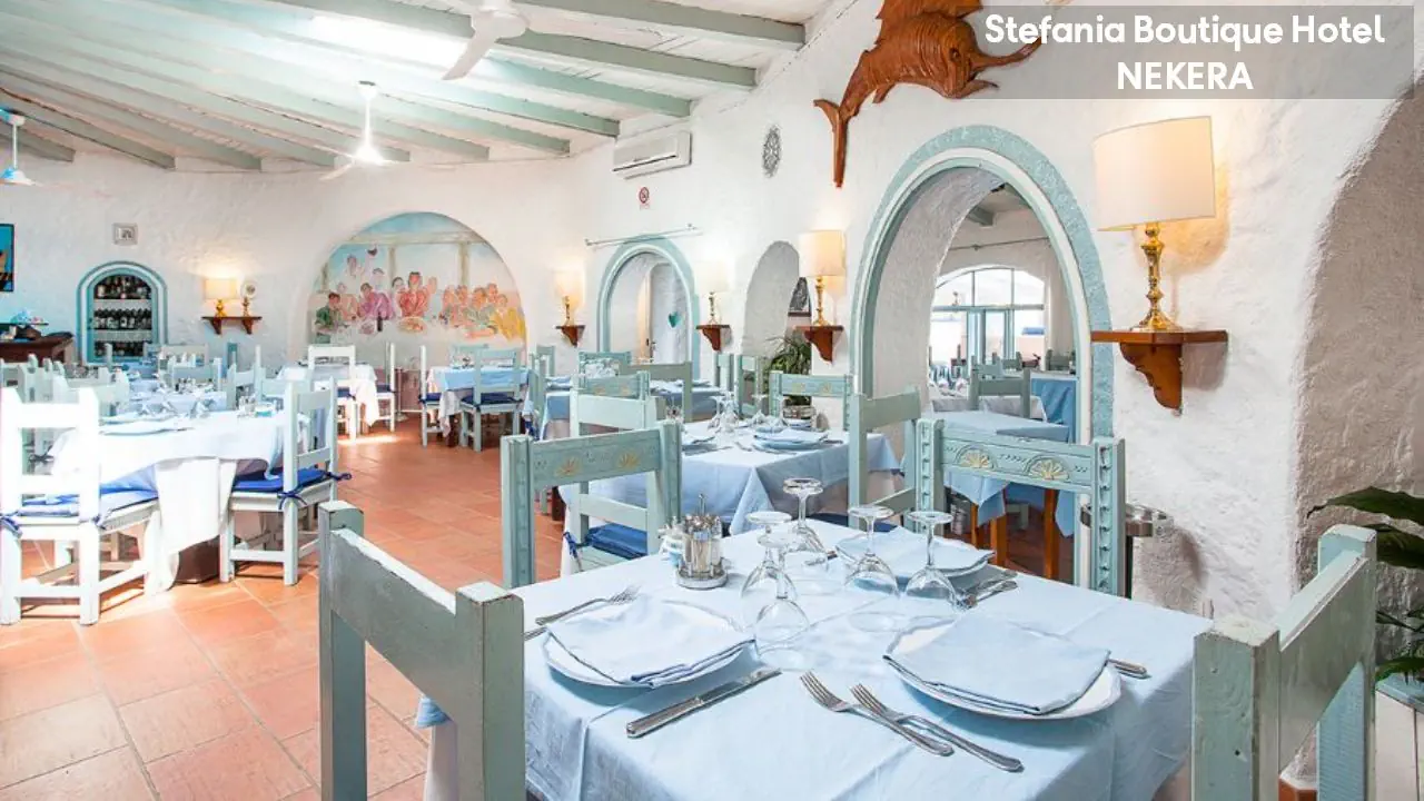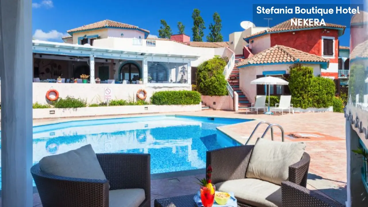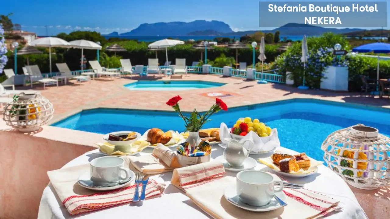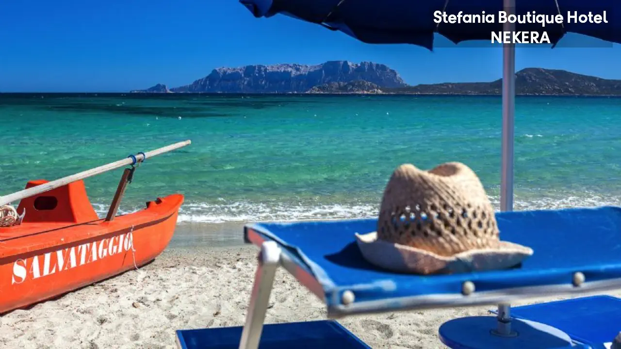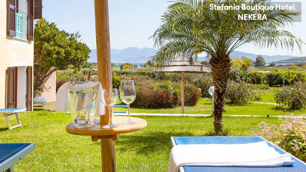 Hotel Stefania Boutique Hotel, w stylu mauretańsko-sardyńskim, składa się z dwóch części: budynku głównego (Main Building) i willi Stefania (Villa Stefania) oddzielonej spokojną uliczką. Oferuje 40 pokoi. Do dyspozycji Gości: recepcja z lobby, winda, restauracja Ninos z tarasem i widokiem na morze, bar, basen zewnętrzny z leżakami i parasolami, ogród, taras słoneczny, siłownia, strefa relaksu, czytelnia, bezpłatny parking. Dodatkowo płatne: pralnia, wypożyczalnia samochodów, rowerów, usługi medyczne na wezwanie,