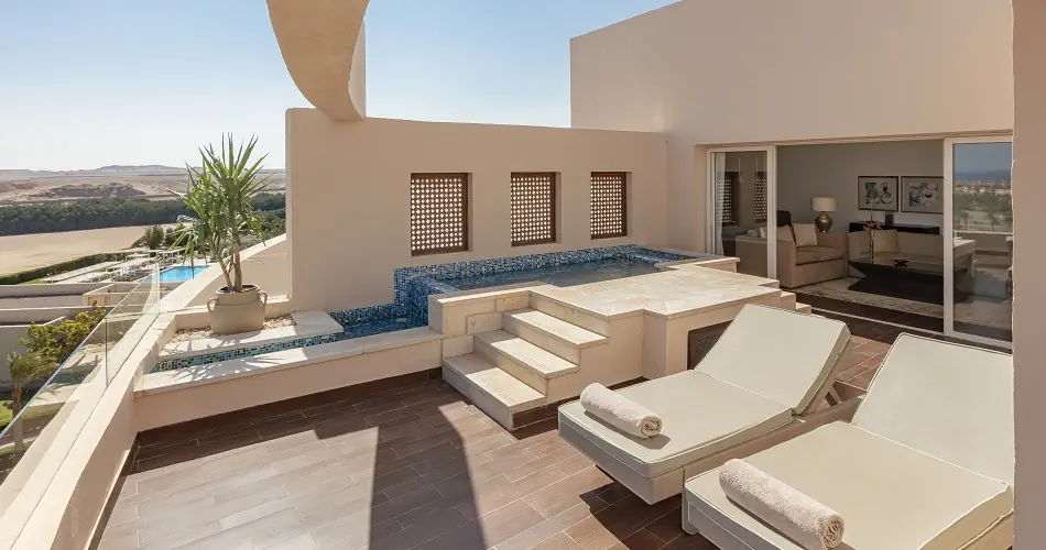 Dla max. 2 osób, Przestrzeń zewnętrzna: Balkon, Kanały telewizji: Polski, Angielski, Telefon w pokoju, wanna i prysznic , jacuzzi, Powierzchnia pokoju: ok. 132 m2, Rodzaj podłogi: płytki, Sprzątanie codziennie, Salon, Jadalnia , część jadalniana, miejsce do pracy, 1 sypialnia, Drzwi łączące między pokojami, Maksymalna liczba osób dorosłych: 2, Maksymalna liczba dzieci: , Kwiaty i owoce, Bezpłatna pralnia, Widok na zatokę,Widok na pole golfowe, Prywatny basen, Liczba łazienek: 1, Liczba toalet: 1, Zestaw do parzenia kawy i herbaty, Klimatyzacja: Klimatyzacja indywidualna