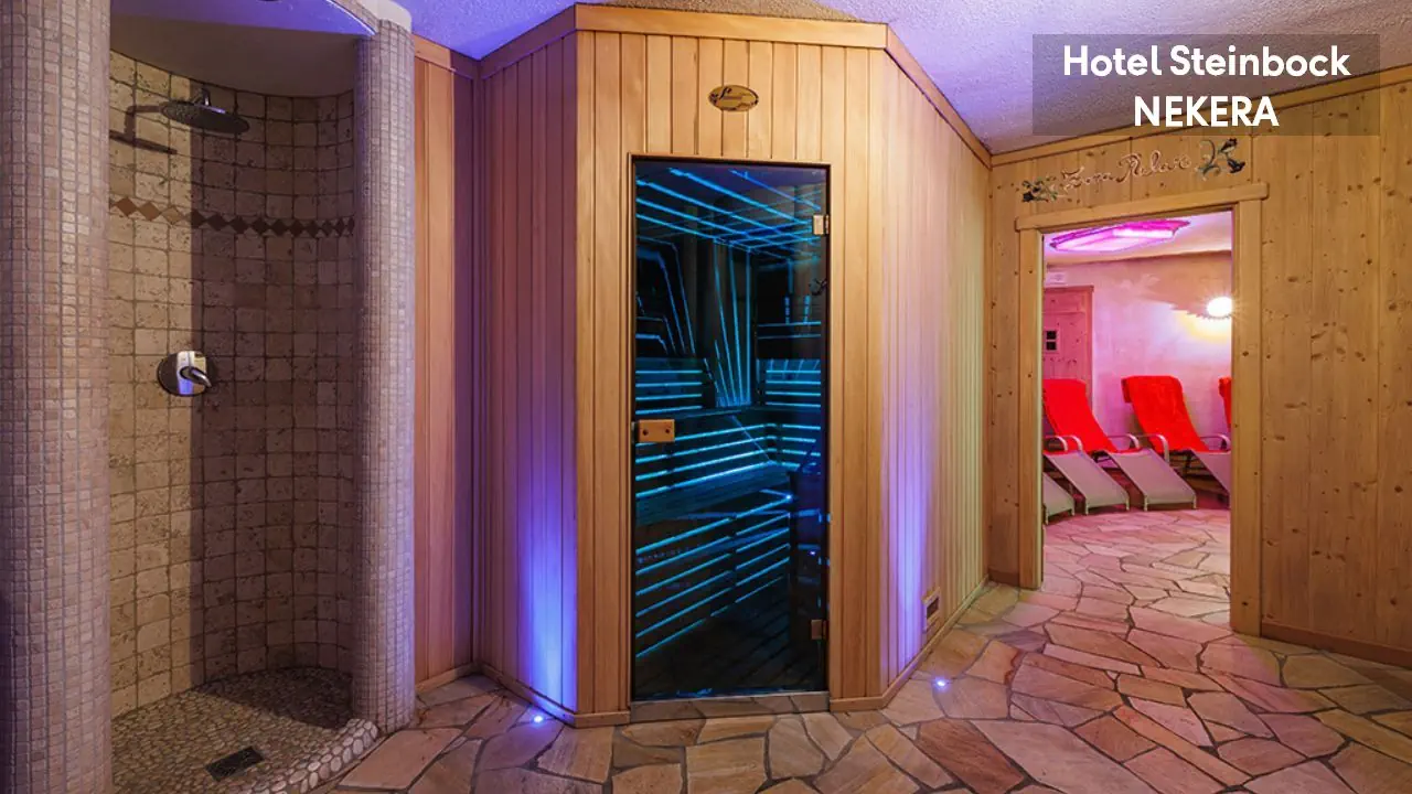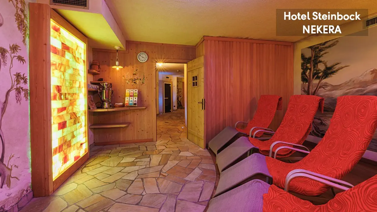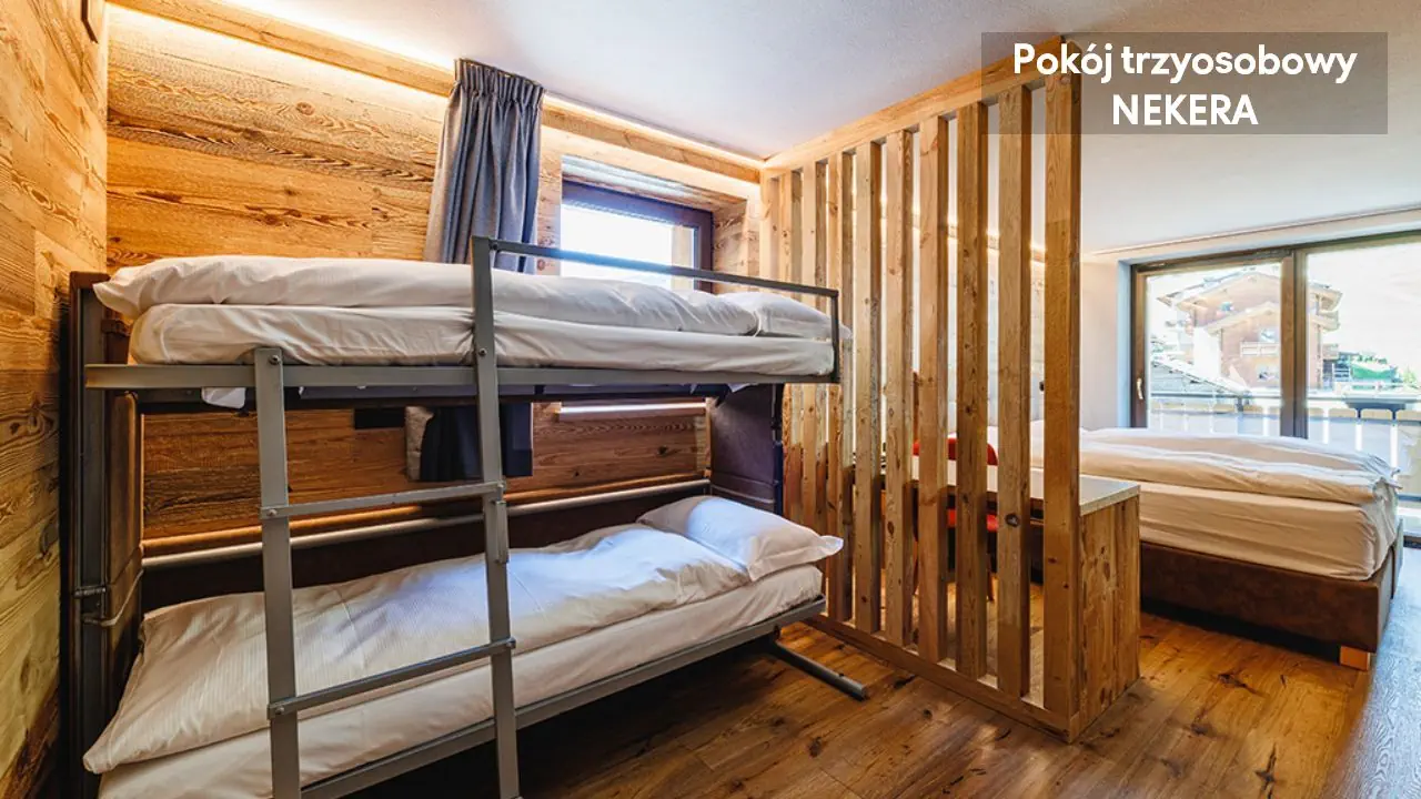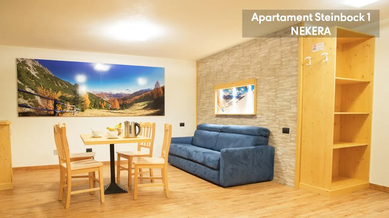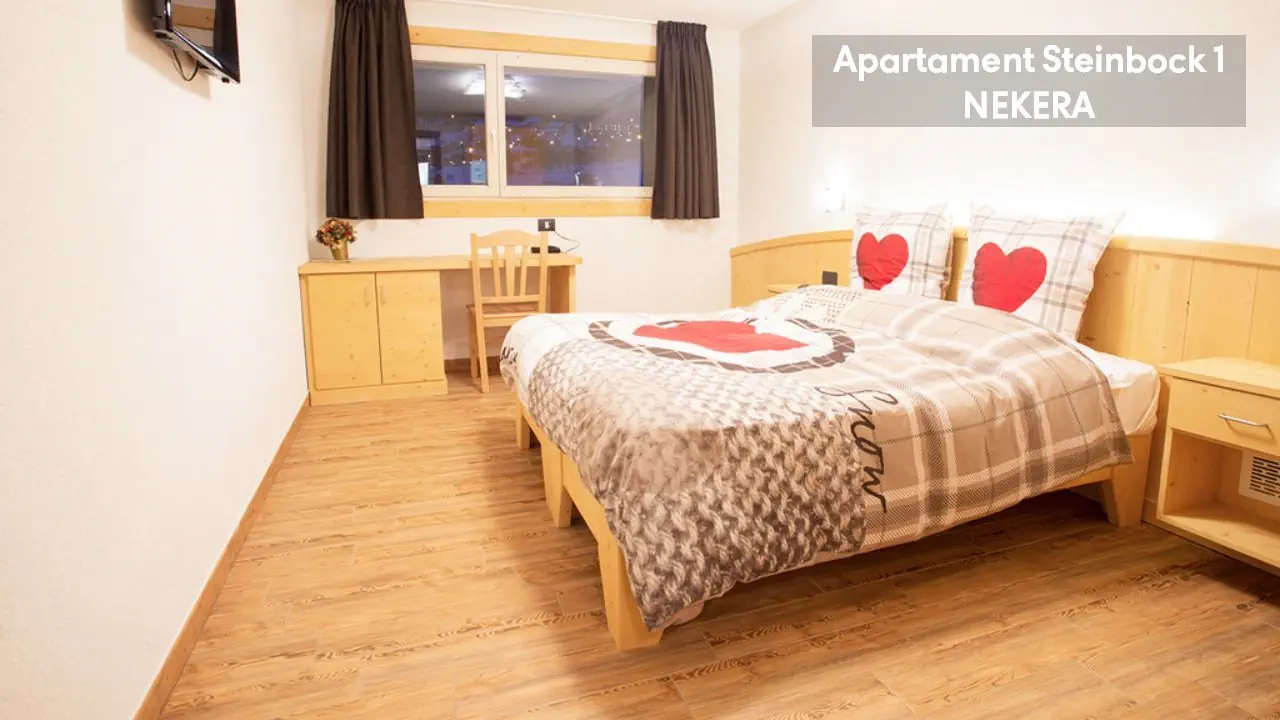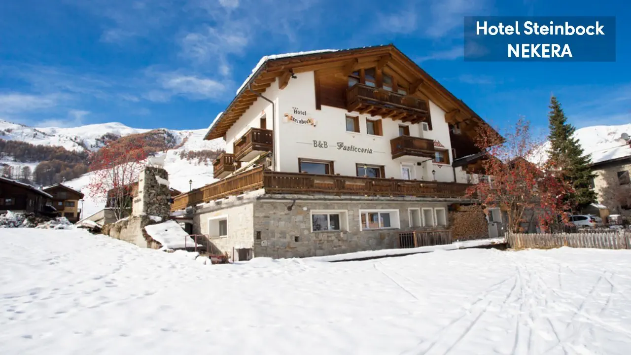 Pokój dwuosobowy: mogący zakwaterować do dwóch osób, TV, Wi-Fi, biurko, sejf, prywatna łazienka (prysznic, toaleta, umywalka, suszarka do włosów), balkon z panoramicznym widokiem. Pokój trzyosobowy: mogący zakwaterować do czterech osób, jedno łóżko podwójne i sofa, pokój z możliwością dostawki dla dziecka, balkon z widokiem na dolinę Livigno; poza tym wyposażony jak pokój dwuosobowy. Apartament Steinbock 1: ok. 55 – 60 m2, mogący zakwaterować do czterech osób, sypialnia z łóżkiem podwójnym i część dzienna z sofą i aneksem kuchennym, apartament w budynku bocznym, ok. 20 m od budynku głównego; poza tym wyposażony jak pokój dwuosobowy.