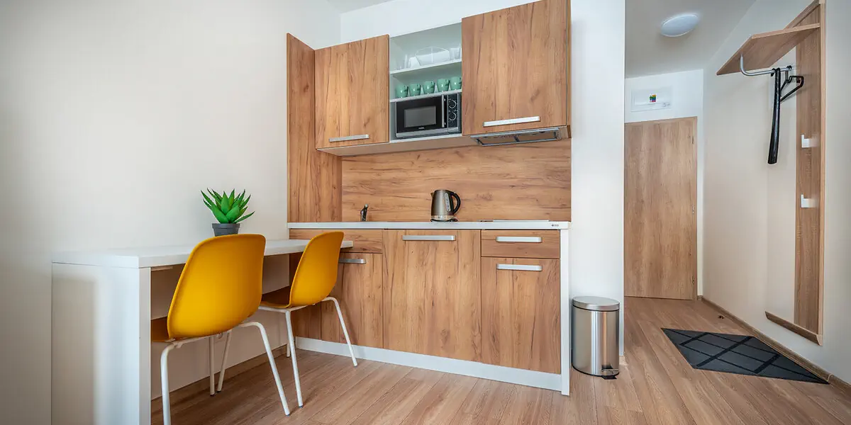 Studio z widokiem na góry, aneksem kuchennym (kuchenka, lodówka, czajnik) i łazienką (prysznic, suszarka do włosów)