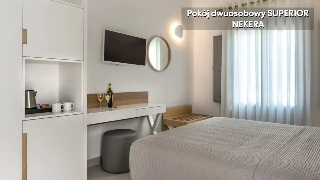 • czterogwiazdkowy, w tradycyjnym cykladzkim stylu • całkowicie odnowiony • 40 pokoi • 4 budynki (2 piętra) • recepcja 24h • lobby • ogród • hotel tylko dla dorosłych