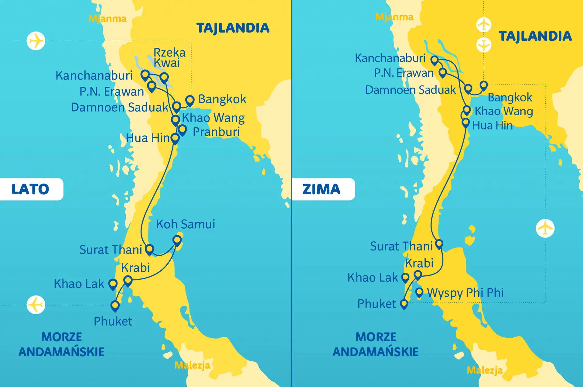 Do dyspozycji gości w hotelach restauracja, bar i w większości hoteli basen Zakwaterowanie Część objezdowa Hotele dobrej klasy, odpowiadające standardowi ***/**** w ocenie organizatora. Pokoje: we wszystkich hotelach są wyposażone w TV, klimatyzację, łazienki z WC i często mini bar (dodatkowo płatny). Pokój 3 - osobowy to z reguły pokój 2 - osobowy z dostawką (dostawka na ogół w formie łóżka polowego lub rozkładanej kanapy). Część pobytowa W sezonie Egzotyka: Zakwaterowanie w wybranym hotelu na Phuket. Opisy poszczególnych hoteli w katalogu. W sezonie Lato: Hotele standard odpowiadający **** - zakwaterowanie w hotelu Al's Resort lub podobnym na plaży na Koh Samui. Komfortowe pokoje z łazienką, wyposażone w TV, klimatyzację i telefon, mini-bar (dodatkowo płatny).
