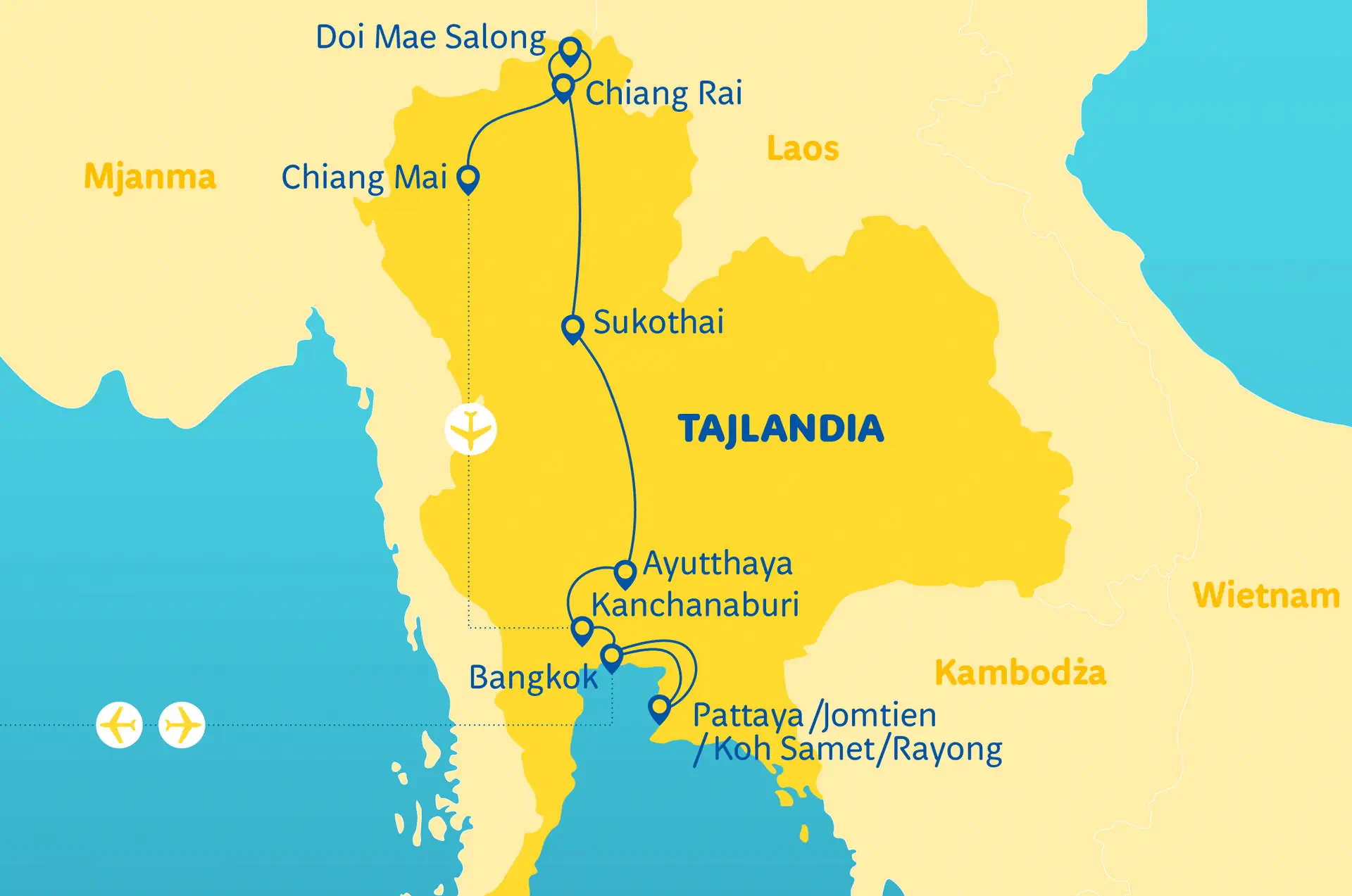 Do dyspozycji gości Część objazdowa: w hotelach restauracja, bar i w większości hoteli basen Zakwaterowanie Część objazdowa Hotele wysokiej klasy, odpowiadające standardowi ****/****+ w ocenie organizatora. Pokoje: we wszystkich hotelach są wyposażone w TV, klimatyzację, łazienki z wc i często mini bar (dodatkowo płatny). Pokój 3-osobowy, to z reguły pokój 2-osobowy z dostawką (dostawka na ogół w formie łóżka polowego lub rozkładanej kanapy). Część pobytowa Hotele: opisy poszczególnych hoteli w części dotyczących wczasów w Tajlandii (Jomtien/ Pattaya/Rayong lub Koh Samet).