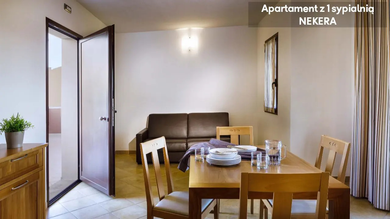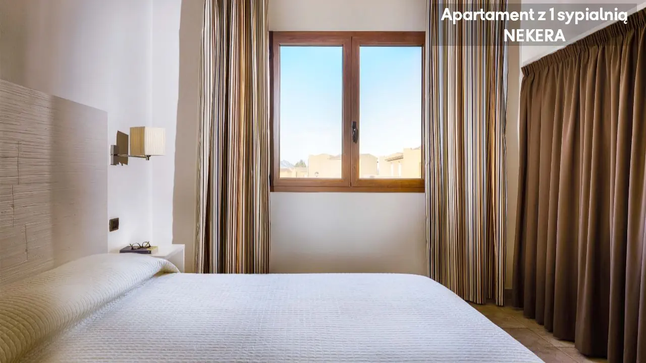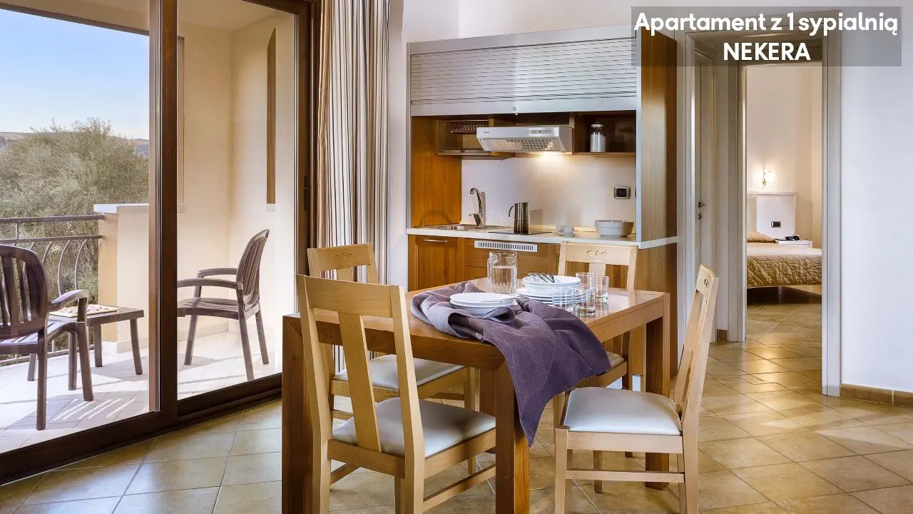 Apartament z 1 sypialnią z patio lub tarasem, ok. 35 m², dla maksymalnie 4 osób. Apartament składa się z salonu z rozkładaną sofą i w pełni wyposażonego aneksu kuchennego oraz oddzielnej sypialni z łóżkiem podwójnym, klimatyzacja, TV - Sat, sejf, prywatna łazienka ( prysznic/wanna, umywalka, lustro, toaleta, mini kosmetyki, suszarka do włosów), umeblowany patio lub taras.