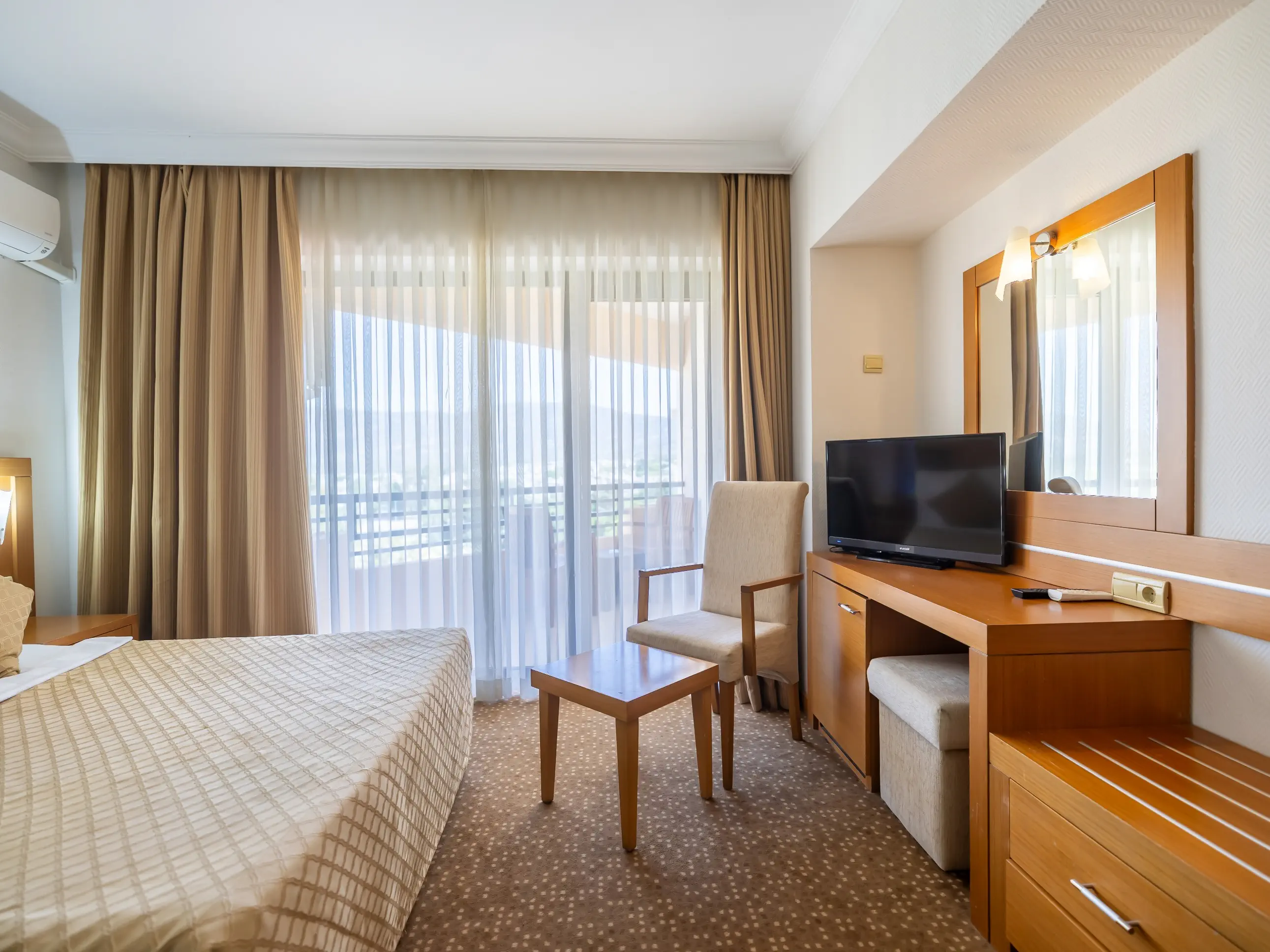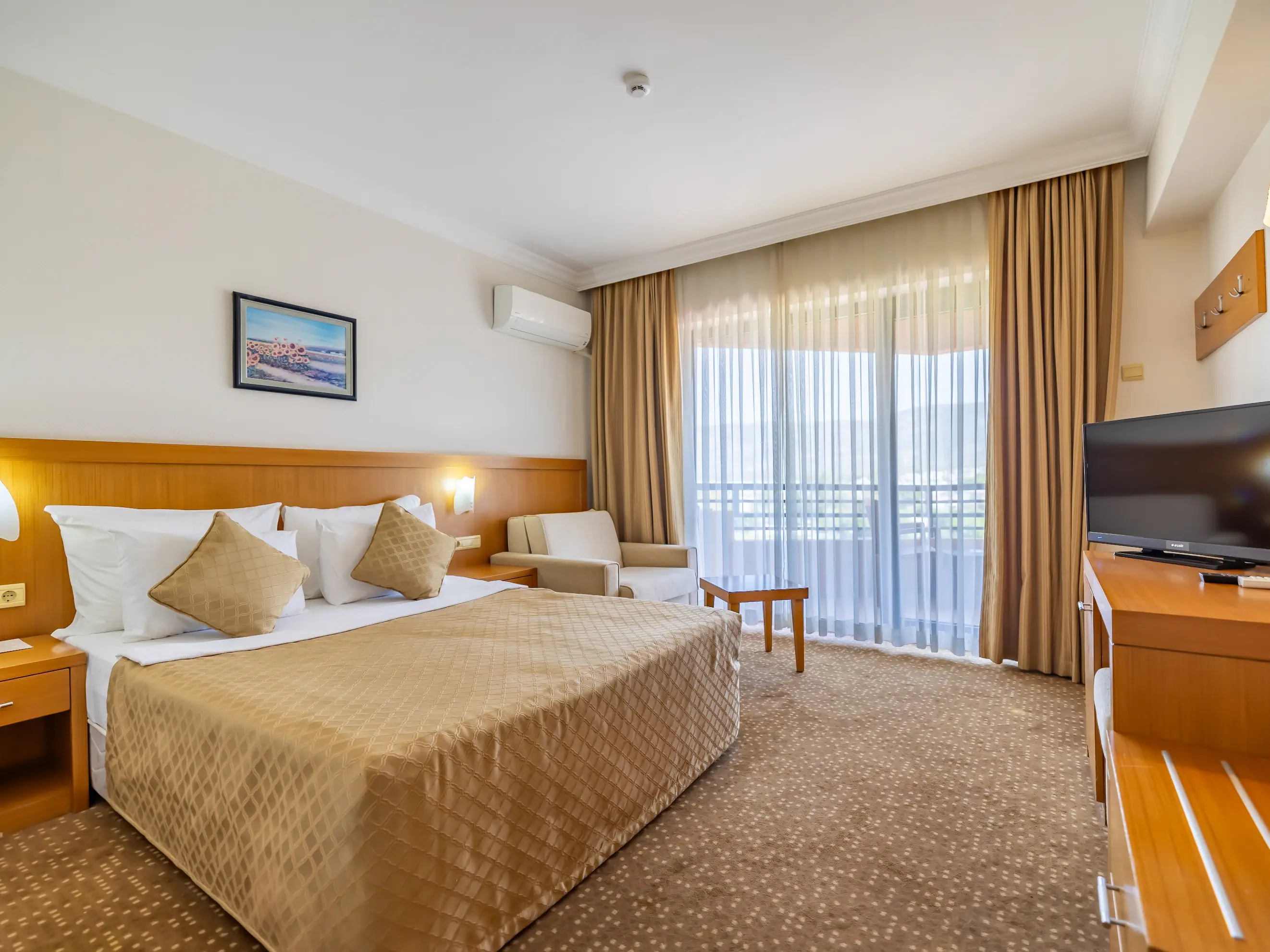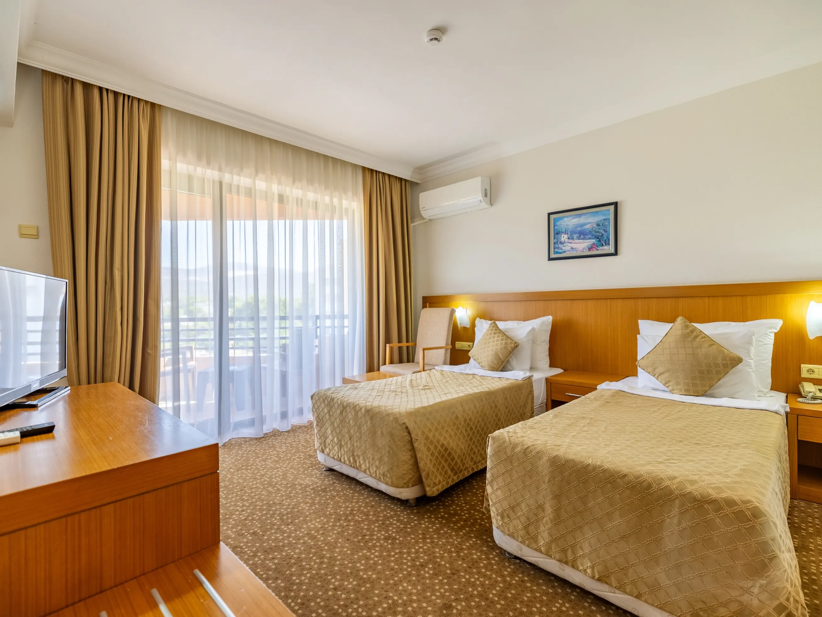Dla max. 3 osób, Przestrzeń zewnętrzna: Balkon, Kanały telewizji: Polski, Telefon w pokoju, prysznic, Powierzchnia pokoju: ok. 19 - 21 m2, Dostawka: łóżko standardowe, Rodzaj podłogi: wykładzina, Sprzątanie cykliczne, 1 sypialnia, Maksymalna liczba osób dorosłych: 3, Maksymalna liczba dzieci: 2, Widok na ogród i morze,Boczny widok na morze,Od strony morza, Liczba łazienek: 1, Liczba toalet: 1, Klimatyzacja: Klimatyzacja indywidualna