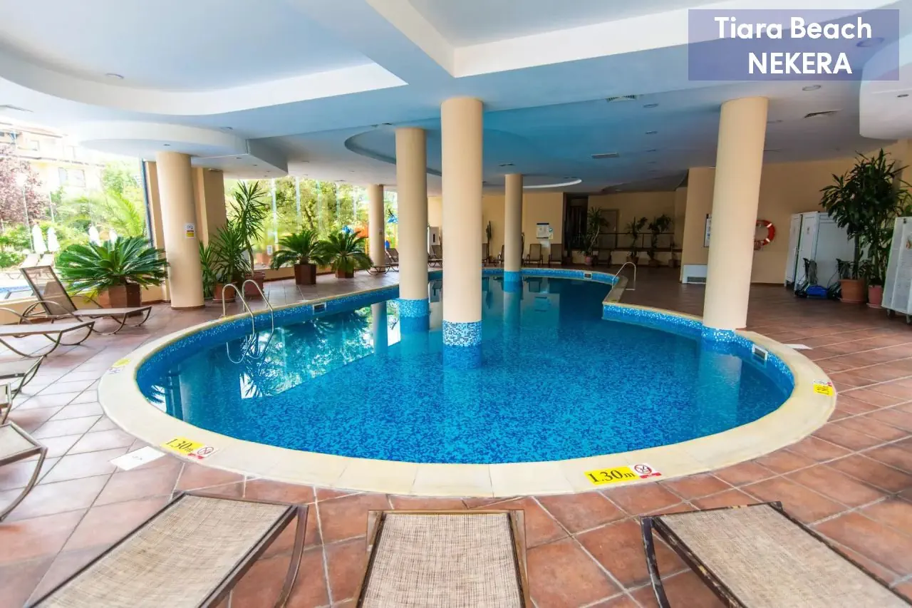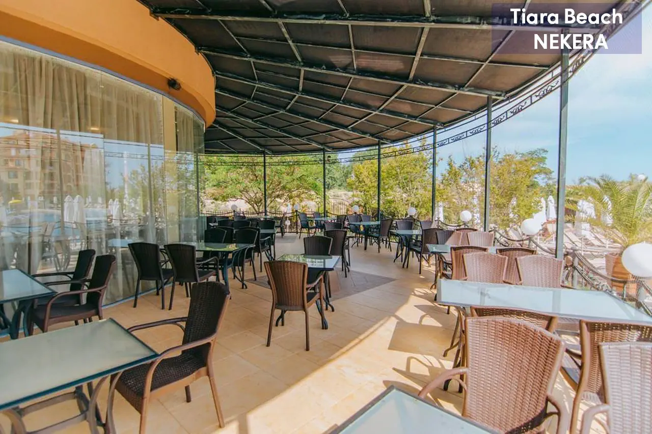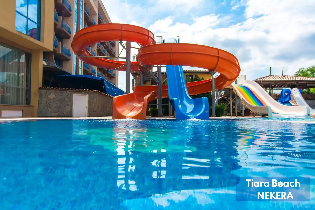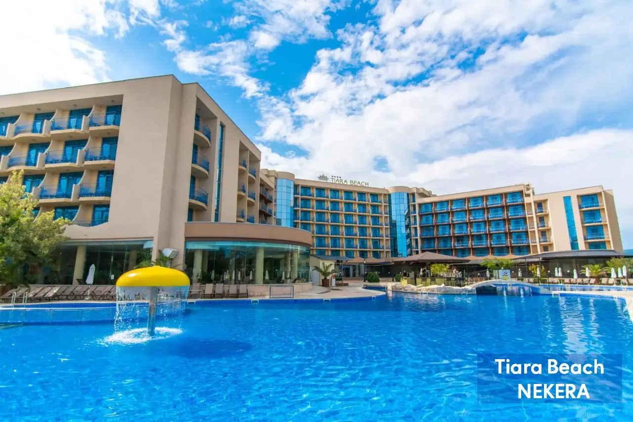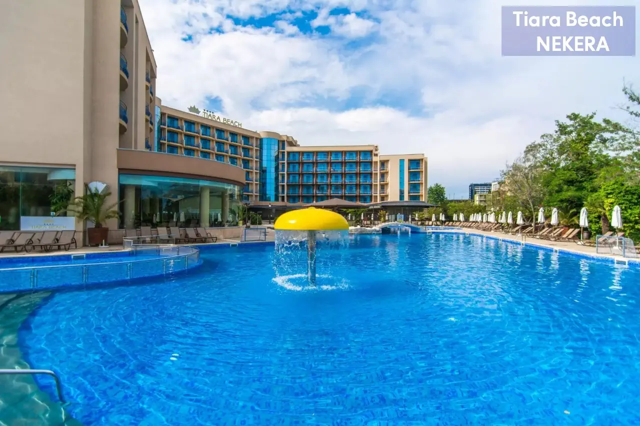 Hotel rodzinny, położony w spokojnej dzielnicy Słonecznego Brzegu, zaledwie 150 m od plaży. Oferuje komfortowe pokoje oraz bogatą ofertę rekreacyjną, w tym baseny, zjeżdżalnie, animacje i mini klub dla dzieci. Goście mogą korzystać z wyżywienia w systemie All Inclusive, obejmującego posiłki, przekąski i lokalne napoje alkoholowe oraz bezalkoholowe. Na terenie obiektu znajduje się spa, siłownia oraz szeroka oferta sportów wodnych. Dodatkowo, hotel oferuje bezpłatne Wi-Fi, a także płatne usługi takie jak masaże i wypożyczalnia sprzętu.