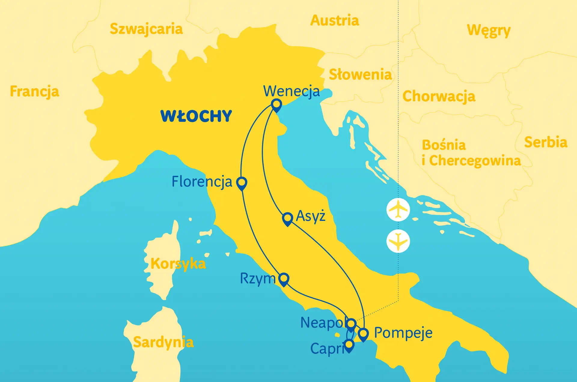 Pokoje skromnie urządzone pokoje 2 i 3-osobowe z łazienkami. Wyżywienie śniadania kontynentalne (pieczywo, masło, dżem, kawa, mleko) oraz za dopłatą obiadokolacje (możliwe w pobliskiej włoskiej restauracji), napoje do obiadokolacji płatne dodatkowo. Położenie Hotele **/*** klasy turystycznej, położone w miastach satelickich (30-65 km do centrum) lub obiekty „villaggio turistico” o charakterze wioski wakacyjnej, na trasach pomiędzy zwiedzanymi miastami. 7 rozpoczętych dób hotelowych: Neapol/ zona Napoli (3), Wenecja/ Padwa (1), Florencja/ Chianciano Terme (1), Fiuggi (1), ok. Ceseny/ San Marino/ Arezzo (1). Do dyspozycji gości recepcja, restauracja lub bar. Kategoria lokalna **/***