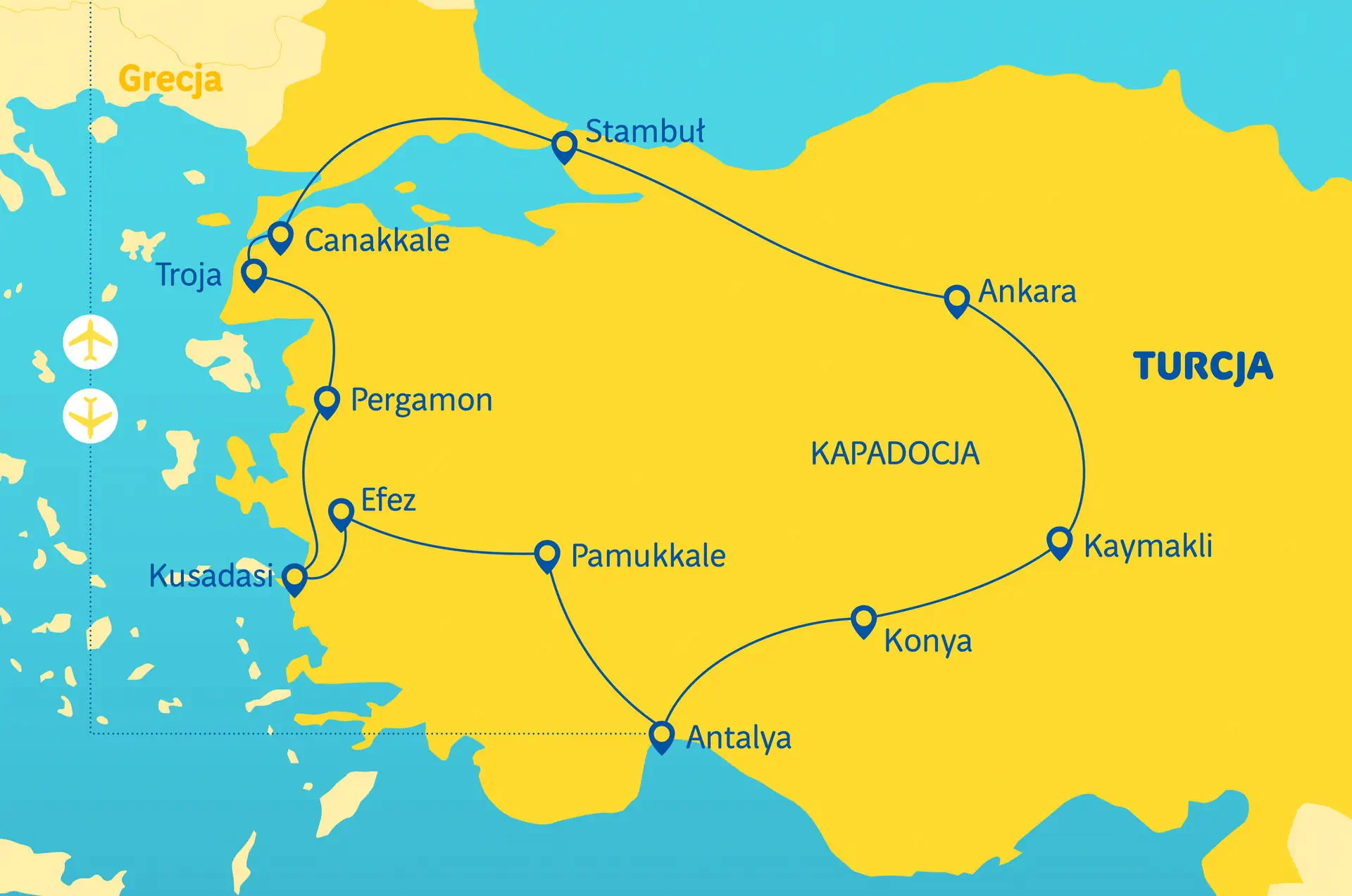 Do dyspozycji gości restauracja i bar Kategoria lokalna *** Położenie Hotele *** - skromne, położone zwykle poza centrami miast - (7 rozpoczętych dób hotelowych: Antalya - 2, Selcuk/ Kusadasi - 1, Canakkale - 1, Stambuł - 1, Kapadocja - 2). Pokoje: 2 - osobowe (możliwość dostawki), wszystkie z klimatyzacją (hotele w Kapadocji bez klimatyzacji) i łazienkami. Do dyspozycji gości:restauracja i bar. Wyżywienie:śniadania kontynentalne typu bufet oraz obiadokolacje (bufet lub zestawy serwowane do stolików). Napoje do obiadokolacji płatne dodatkowo. Kategoria lokalna: *** Wyżywienie śniadania kontynentalne typu bufet oraz obiadokolacje (bufet lub zestawy serwowane do stolików). Napoje do obiadokolacji płatne dodatkowo. Zakwaterowanie Hotele *** - skromne, położone zwykle poza centrami miast - (7 rozpoczętych dób hotelowych: Antalya - 2, Selcuk/ Kusadasi - 1, Canakkale - 1, Stambuł - 1, Kapadocja - 2). Pokoje: 2 - osobowe (możliwość dostawki), wszystkie z klimatyzacją (hotele w Kapadocji bez klimatyzacji) i łazienkami.