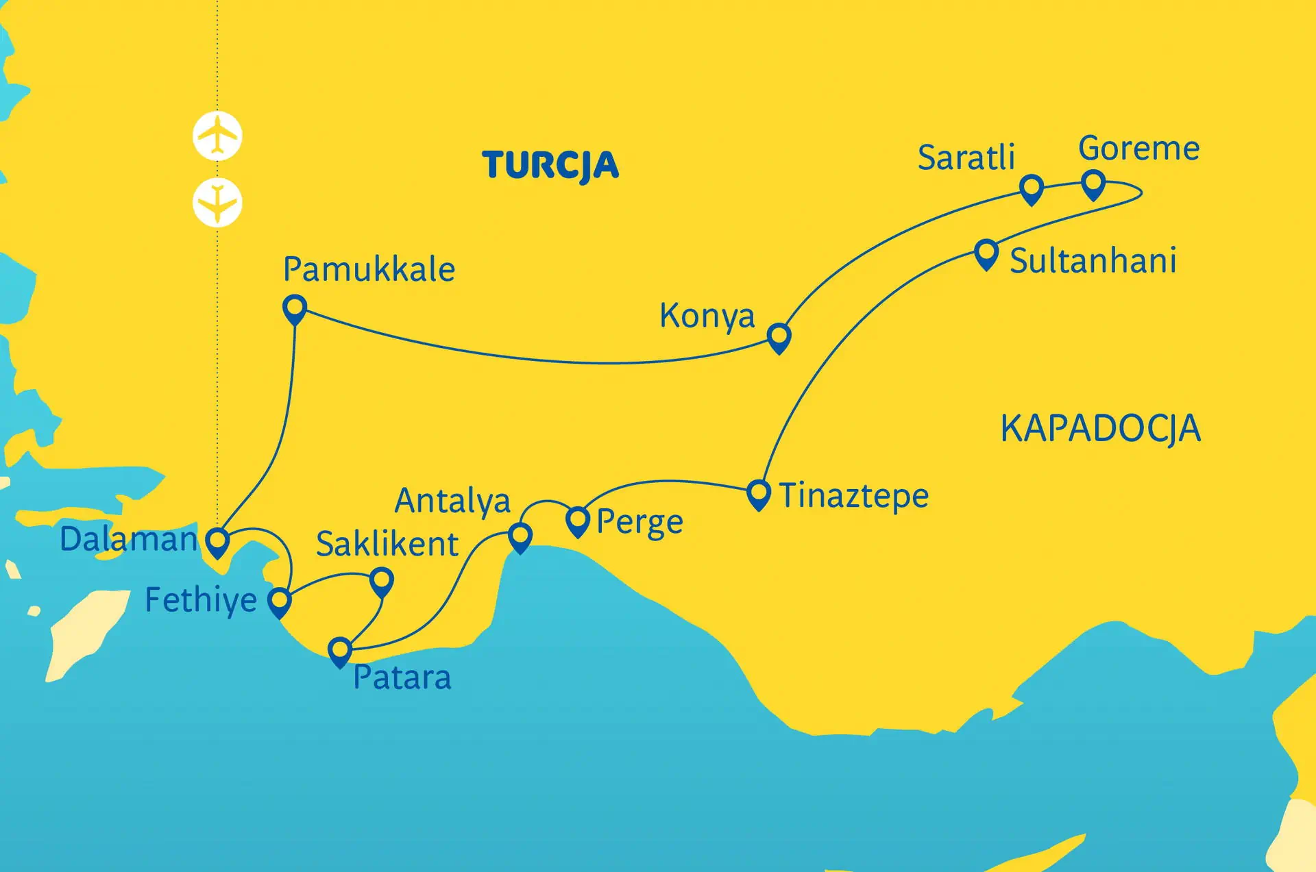 Położenie Hotele*** - skromne, położone zwykle poza centrami miast (7 rozpoczętych dób hotelowych: Dalaman - 1, Konya - 1, Kapadocja - 2, Antalya - 2, Fethiye- 1). Pokoje: 2 - osobowe (możliwość dostawki), wszystkie z klimatyzacją (hotele w Kapadocji bez klimatyzacji) i łazienkami. Do dyspozycji gości:restauracja i bar. Wyżywienie: śniadania kontynentalne typu bufet oraz obiadokolacje (bufet lub zestawy serwowane do stolików). Napoje do obiadokolacji płatne dodatkowo. Kategoria lokalna ***