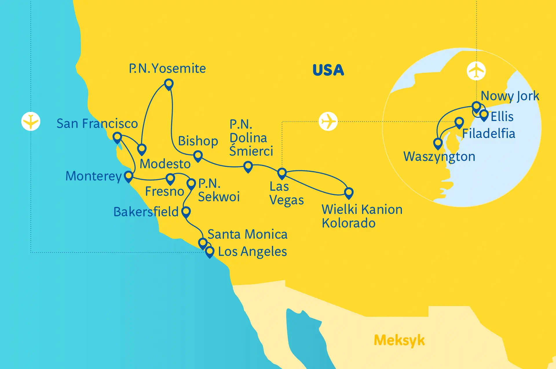 Wyżywienie Śniadania amerykańskie: składają się głównie z produktów słodkich – słodkie bułki, muffiny, pieczywo tostowe, płatki kukurydziane, owoce. Czasami dostępne są „hash browns” – placki ziemniaczane lub ziemniaki na ciepło. Rzadkością są warzywa, sery czy wędlina. Zakwaterowanie Hotele ***,a także ew. pensjonaty/motele *** wg kategoryzacji Rainbow o średnim standardzie (w USA nie ma oficjalnej kategoryzacji obiektów); zwykle położone poza centrami miast - (10 rozpoczętych dób hotelowych: Los Angeles – 2, Barstow – 1, Las Vegas – 2, Bishop – 1, Manteca/Modesto – 1, San Francisco – 1, Nowy Jork - 2). Do dyspozycji gości restauracja oraz bar. Pokoje 2-osobowe, możliwe zakwaterowanie max. 3 os. dorosłych, ale bez dodatkowego łóżka – pokój wyposażony jest w 2 łóżka dwuosobowe (typu „queen”) .