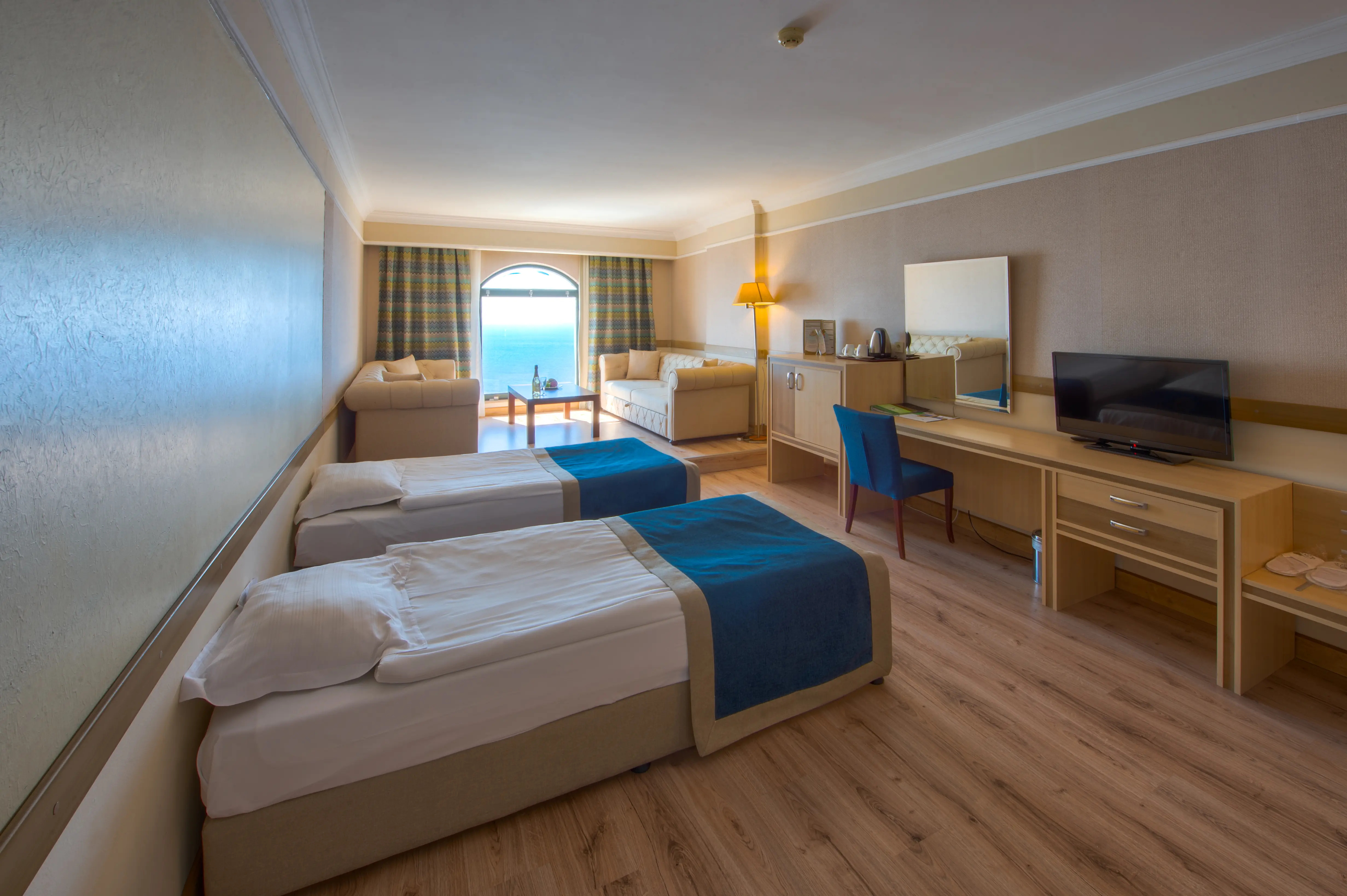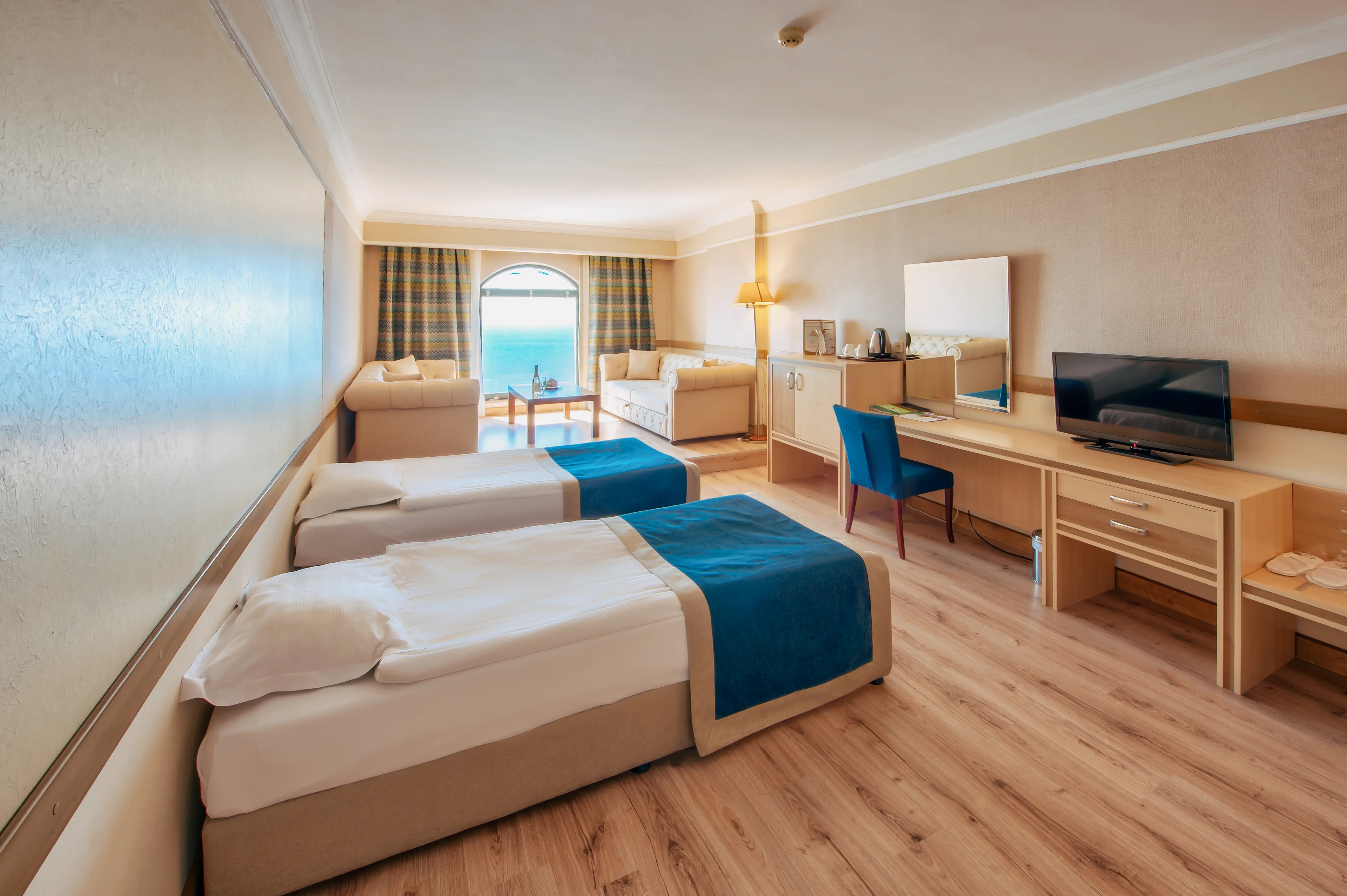 Dla max. 4 osób, Przestrzeń zewnętrzna: Balkon, Kanały telewizji: Polski, Angielski, Telefon w pokoju, prysznic, Powierzchnia pokoju: ok. 34 m2, Dostawka: łóżko rozkładane, Rodzaj podłogi: laminat, Sprzątanie codziennie, 1 sypialnia, Maksymalna liczba osób dorosłych: 2, Maksymalna liczba dzieci: 2, Widok na morze, Liczba łazienek: 1, Liczba toalet: 1, Zestaw do parzenia kawy i herbaty, Klimatyzacja: Klimatyzacja indywidualna